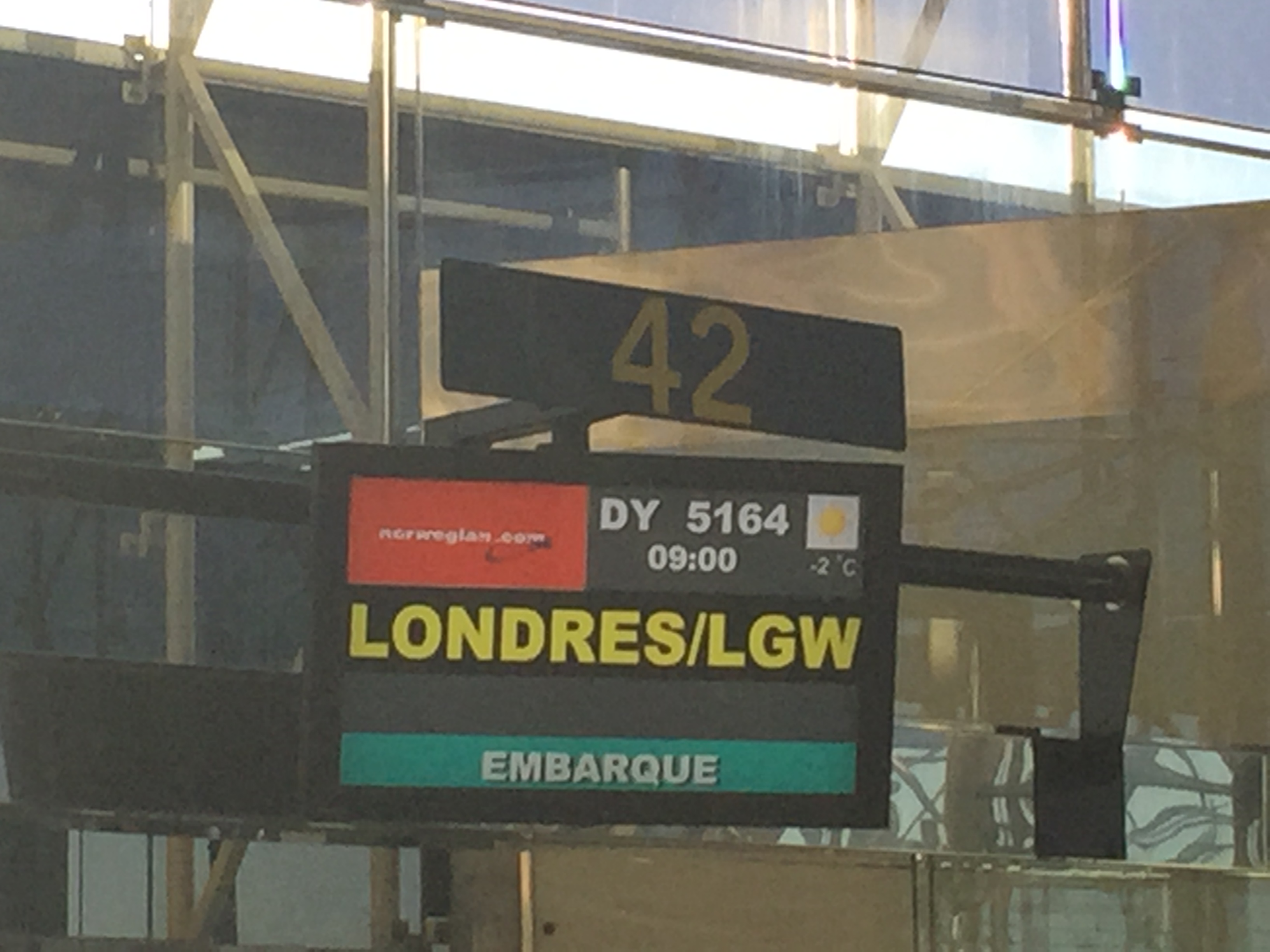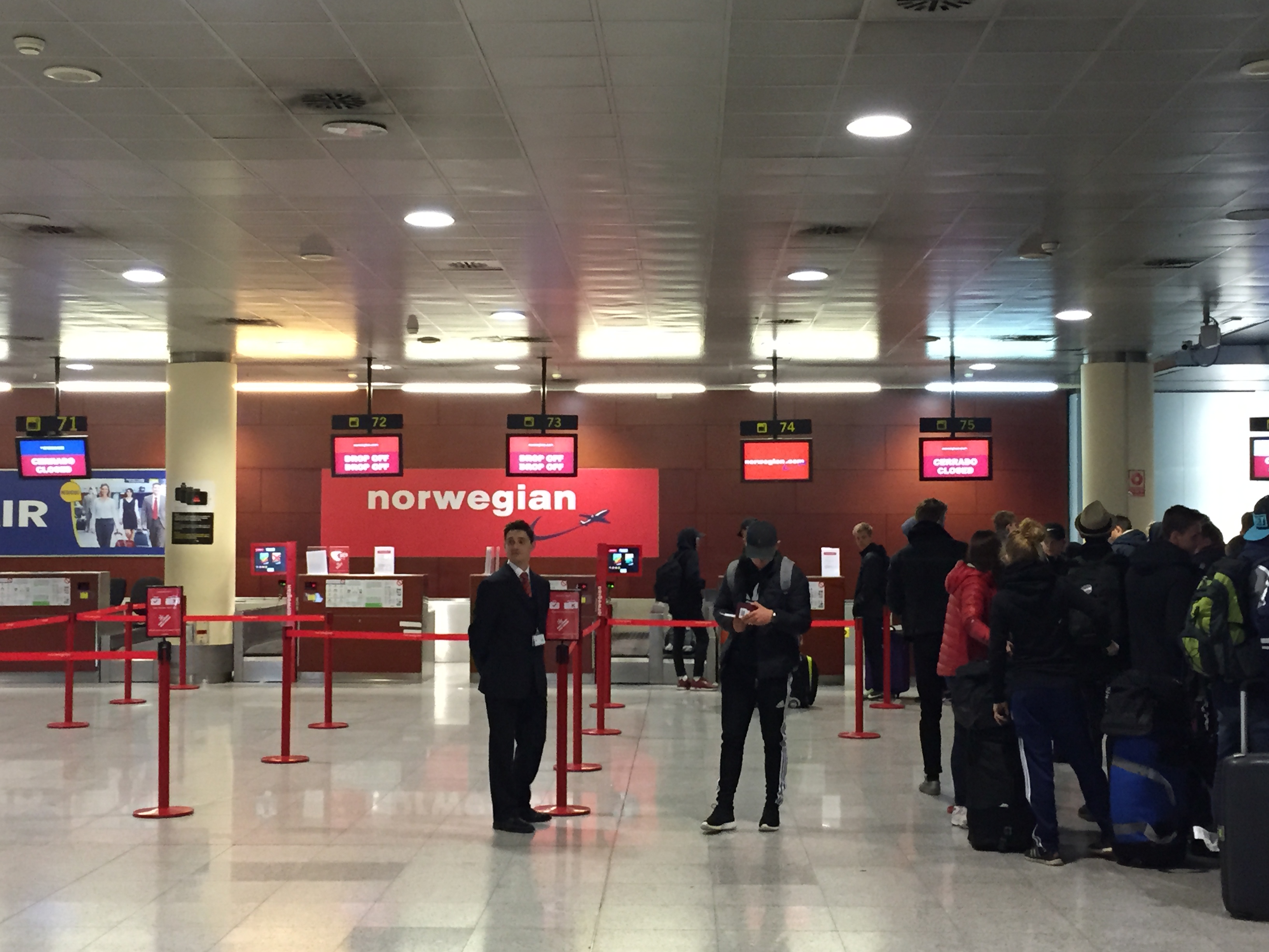 – a Norwegian utiliza os guichês 72 a 74; há 04 máquinas de check-in bem em frente e resolvi testar e a experiência foi ótima: uma vez passado no scanner o código de barras do e-mail que recebi, tudo fica fácil, a máquina imprime o cartão de embarque (o sistema “escolheu” o assento 28C – janela – para mim, pois não paguei 05 euros para pré-reservar um assento) e a etiqueta da bagagem a ser despachada; depois, há uma fila dedicada para o “drop off”: você coloca a etiqueta na mala (na verdade, pedi ajuda para um funcionário), pega um leitor de código de barras, escaneia a etiqueta, coloca a mala na esteira (que faz a pesagem e controla limite de 20kg) e pronto, a esteira liga automaticamente e mala está despachada