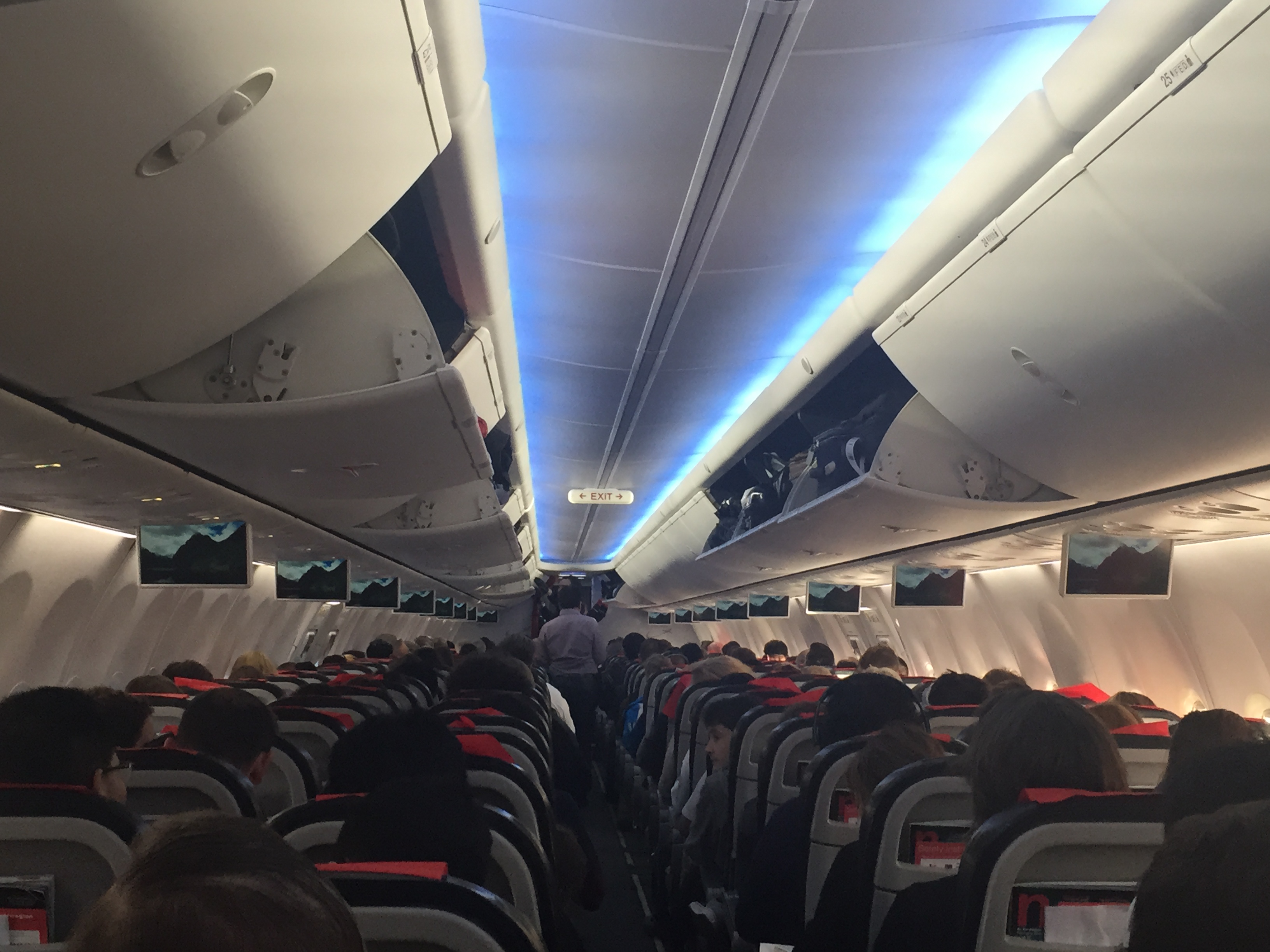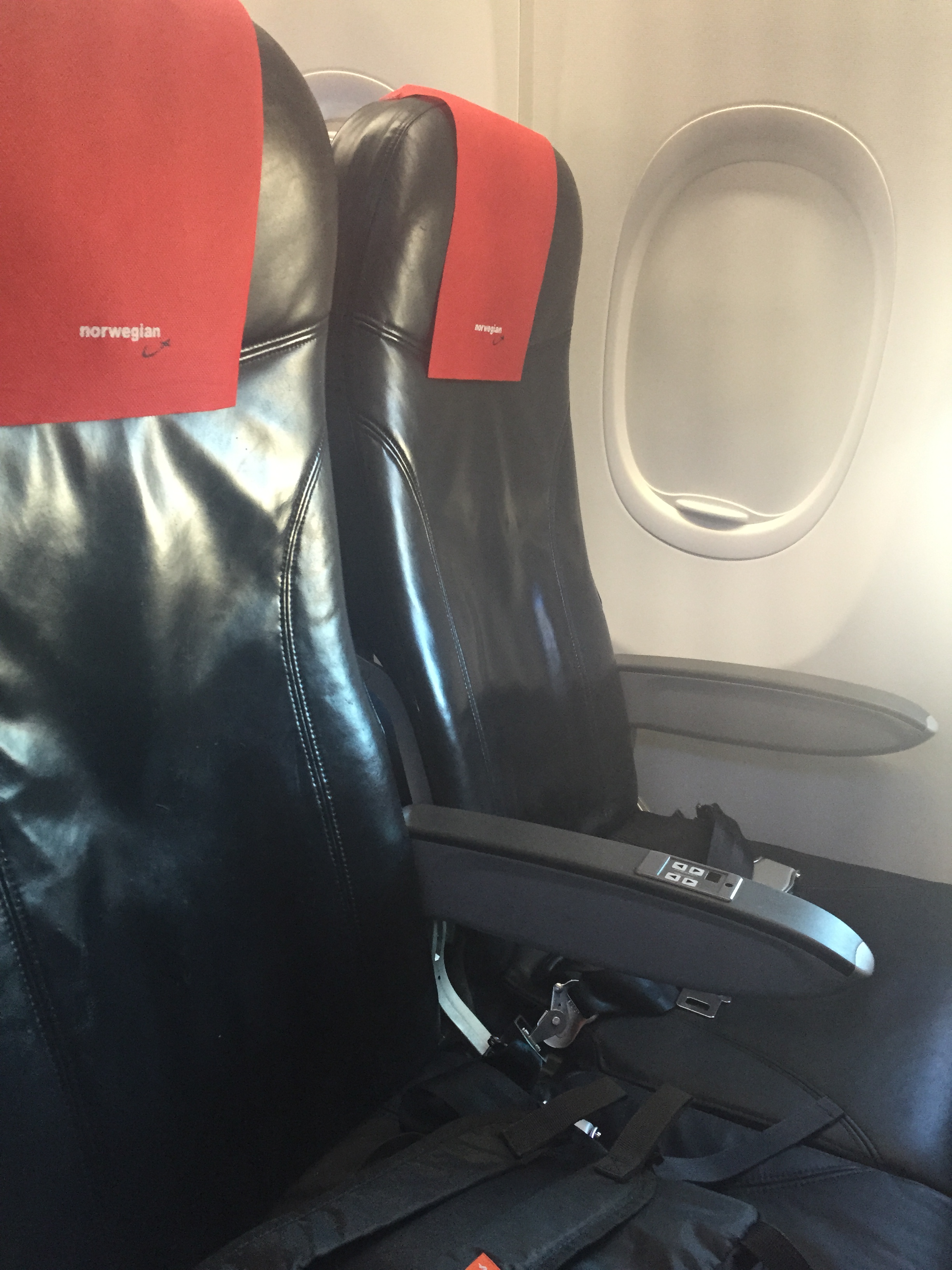 – ao entrar no avião, fui recepcionado pela Chefe de Cabine de forma calorosa; todos os Comissários usavam luvas pretas de couro, combinando com os assentos da mesma cor e também de couro; o Boeing 737-800 com Sky Interior de prefixo LN-DYP (apelido “Aksel Sandemose”) tinha 31 fileiras no tradicional configuração 3×3, em classe única e foi entregue em maio de 2011; neste voo, 90% dos assentos estavam ocupados e dei sorte, estava sozinho na minha fileira e sentei na janela; o espaço para a perna não é grande, mas não é desconfortável (se fosse no Brasil, o selo da ANAC seria “B”); a poltrona reclina pouco, como era esperado