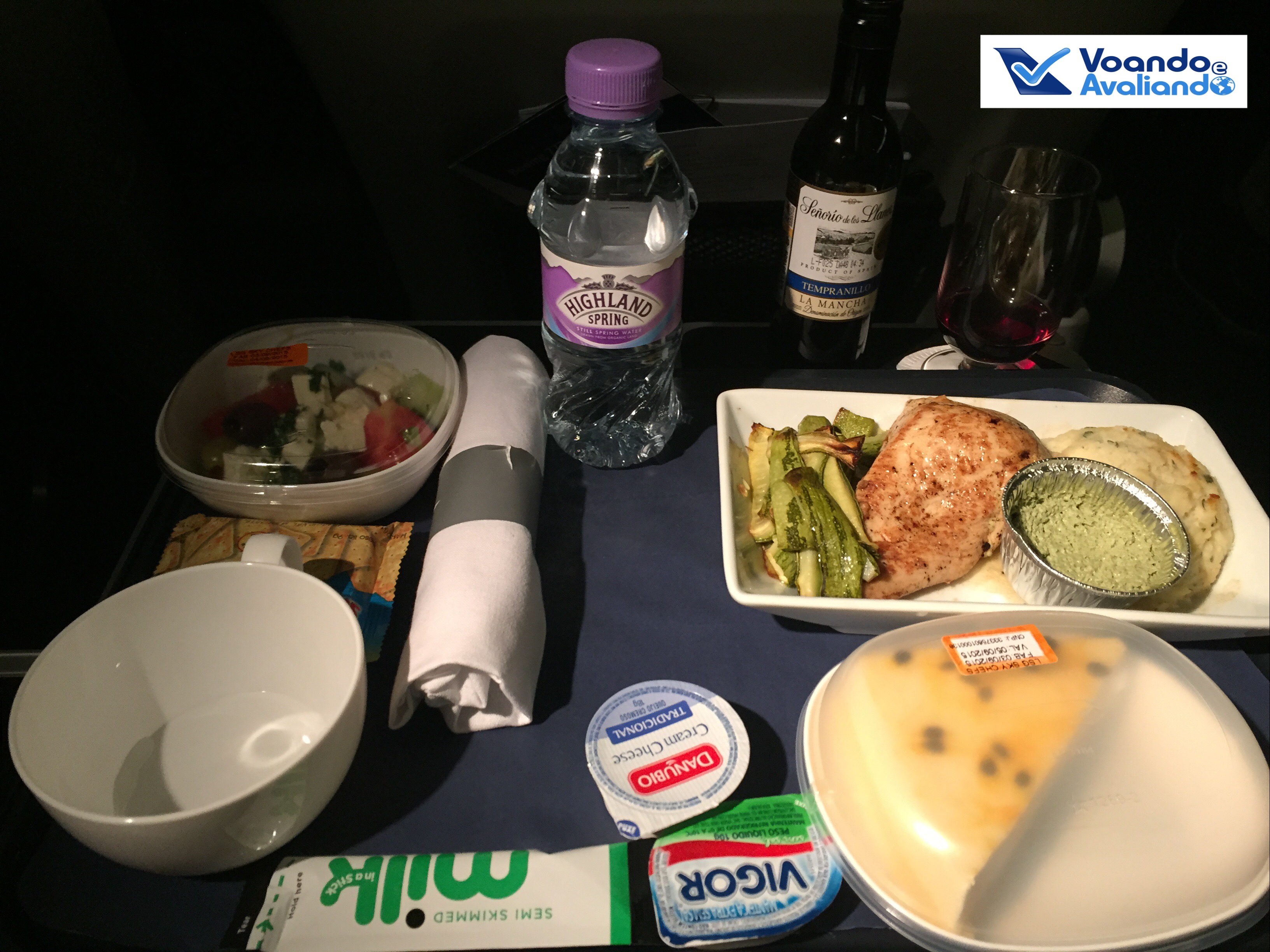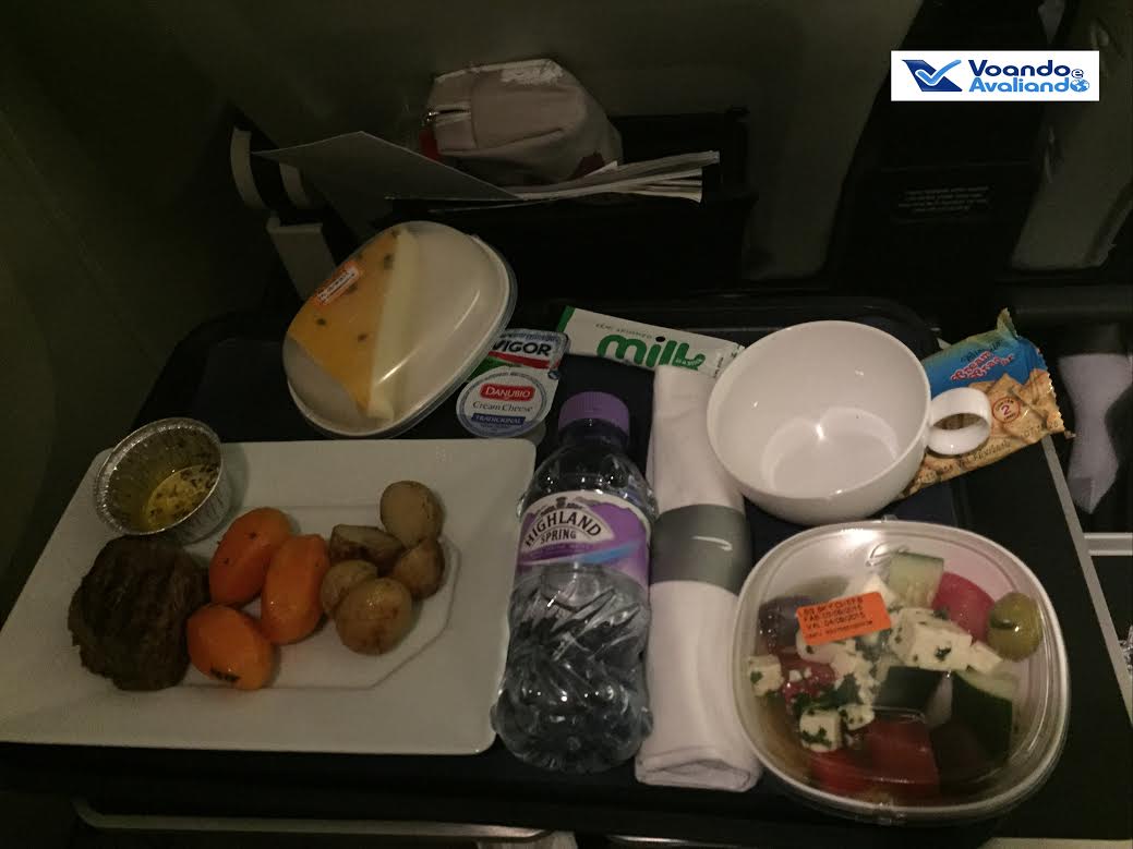 – no jantar, as opções eram: filé com batatas e cenoura ou peito de frango com purê de batata e pepino assado, tendo uma salada de tomate, queijo minas, pepino e azeitonas como acompanhamento; escolhi o filé, bem passado, do jeito que gosto; mais vinho; café foi oferecido ao final; o serviço é muito mais próximo da Econômica do que da Business: bandeja já é servida pronta, com talheres de metal, sem frescuras ou variedades