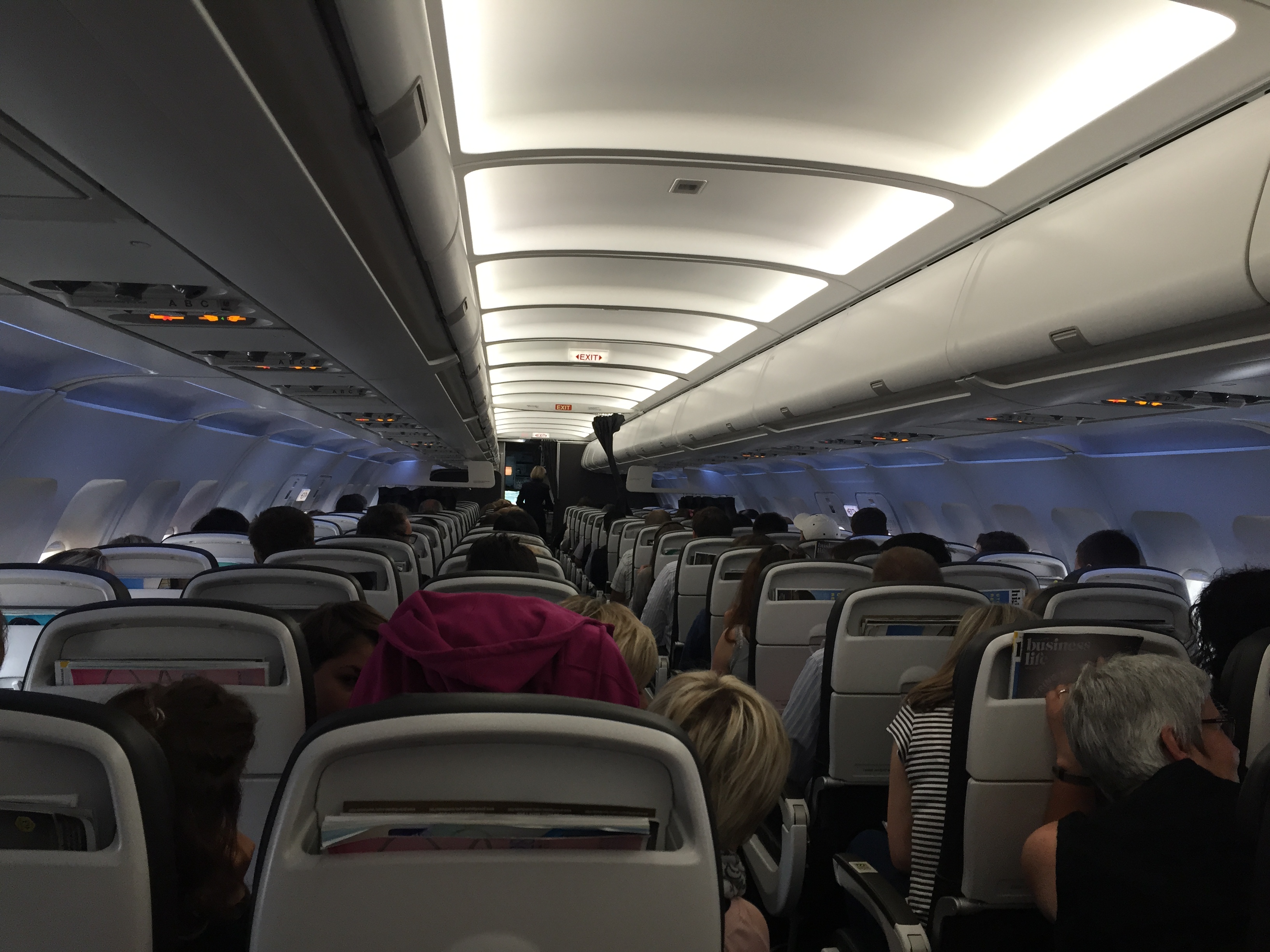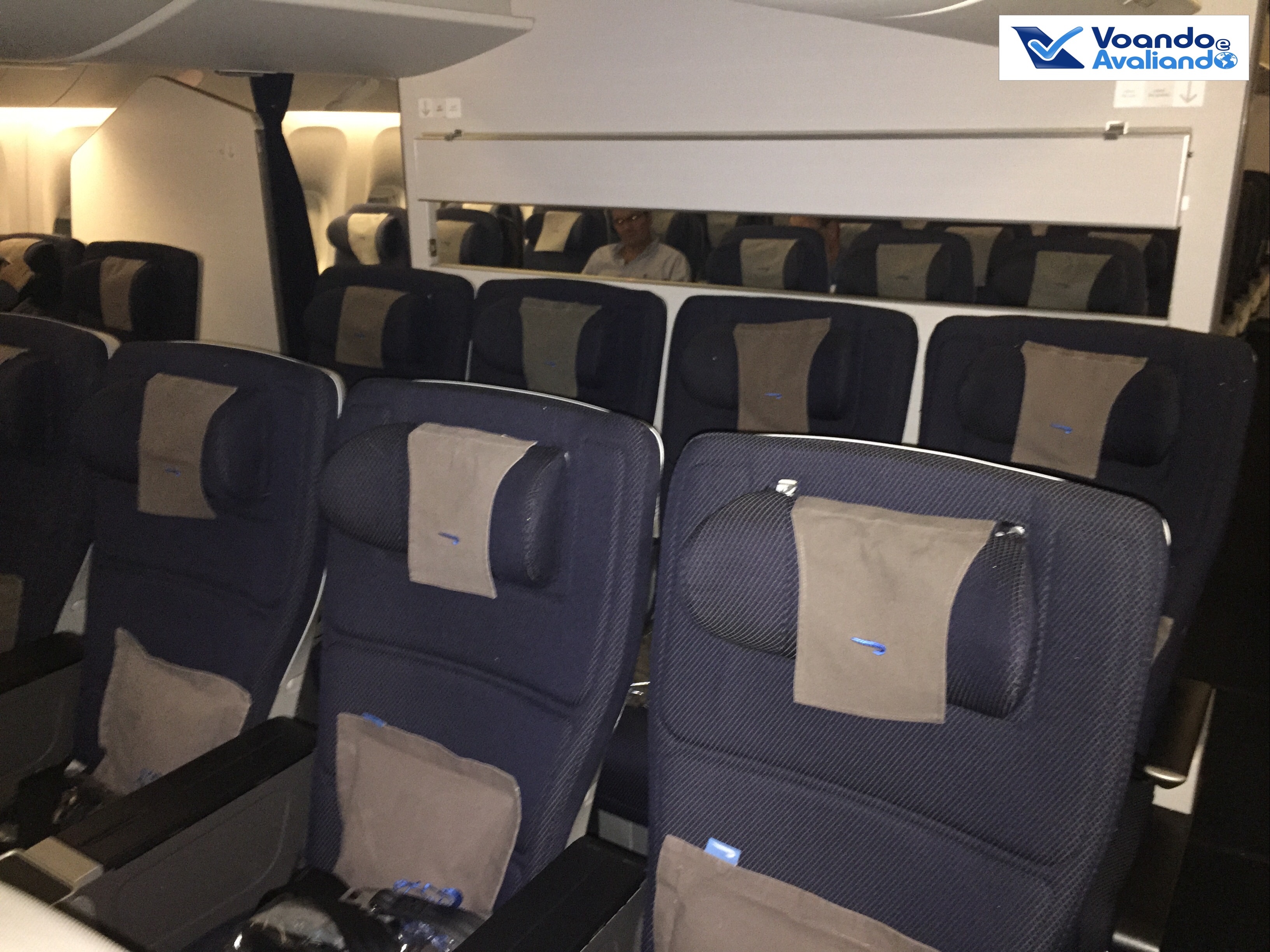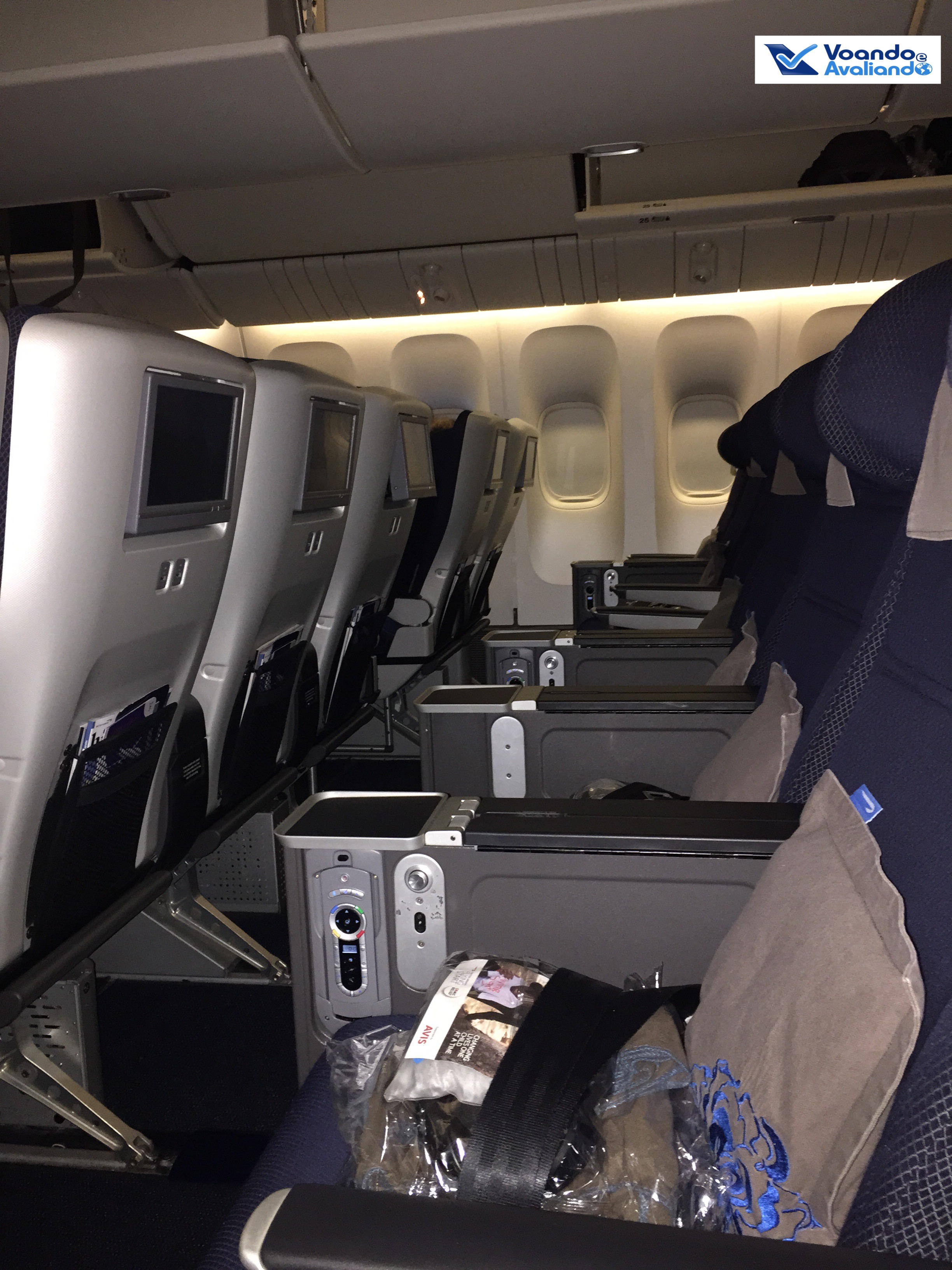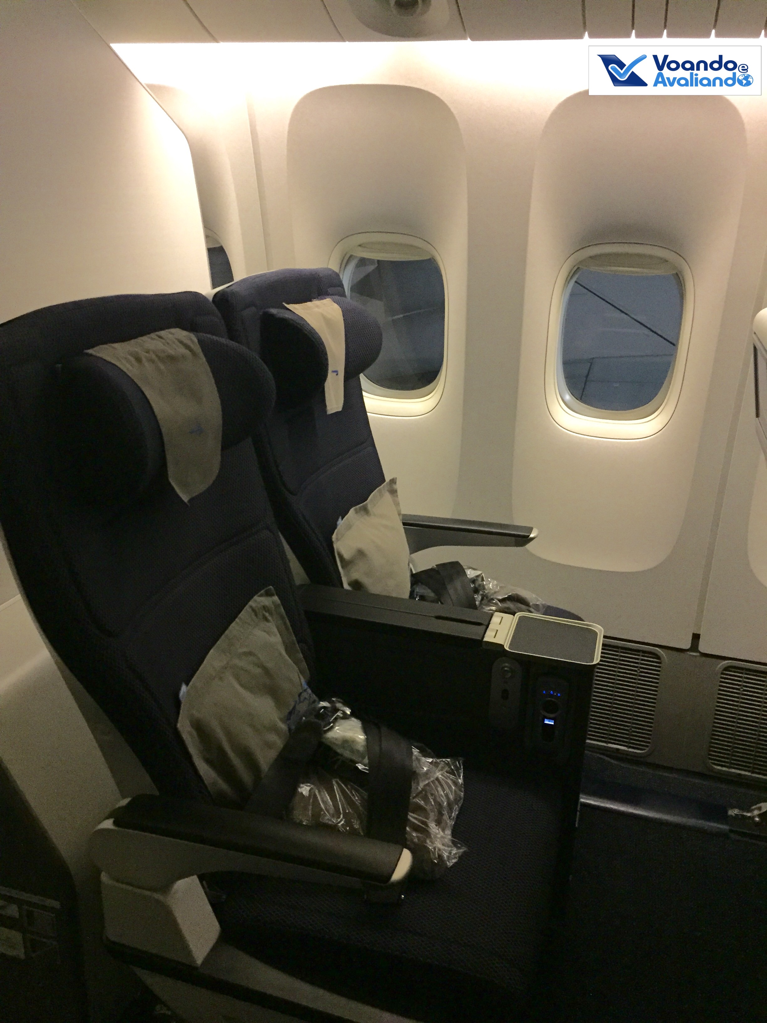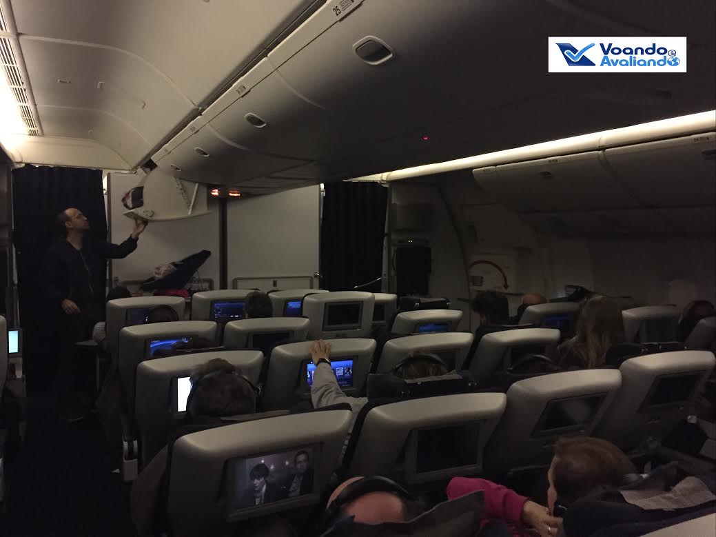 – a configuração do avião na Classe Econômica é 3x3x3; na Plus, a disposição das poltronas é diferente: 2x4x2, ou seja, 01 poltorna a menos, o que indica mais espaço; com o upgrade, estávamos nas poltronas 25A e 25B (janela e corredor), no lado esquerdo, perfeito para um casal viajando; os bagageiros superiores são grandes, não houve nenhum stress para acomodar a bagagem de mão dos 44 passageiros que ocupavam esta seção da aeronave
