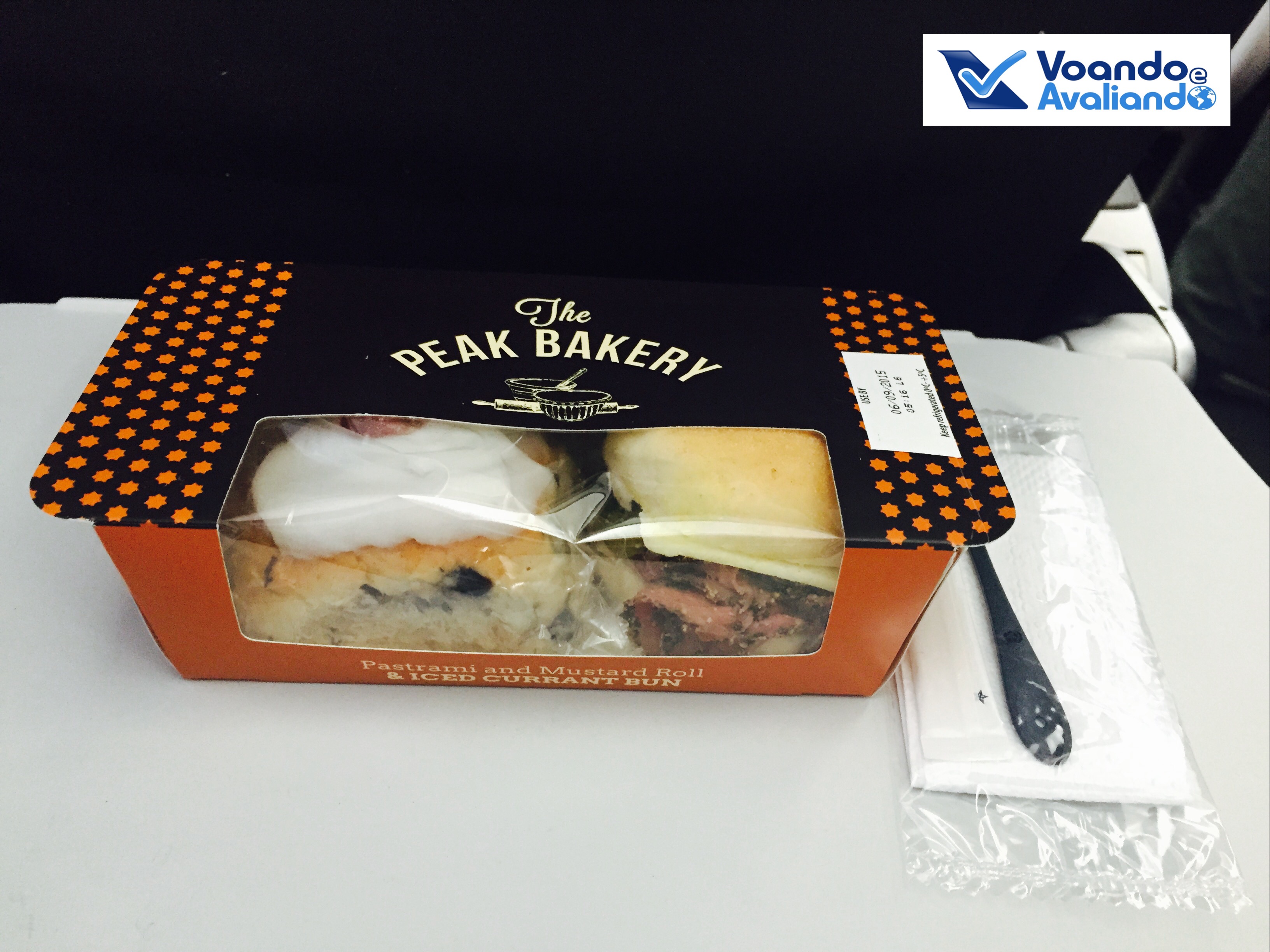 – a bandeja do café era pequena e básica: omelete ou sanduíche de queijo; escolhi o sanduíche, que estava um pouco queimado embaixo, mas matou a fome (nesta refeição, os talheres eram de plástico); além disso, um copinho de suco de laranja e um bolinho com passas, junto com um copo de café; muito simples e reparei que as opções eram exatamente as mesmas da Classe Econômica