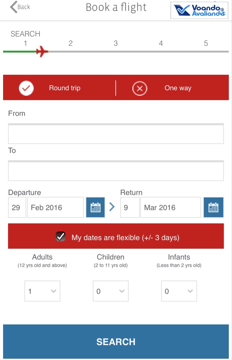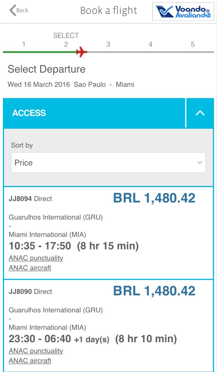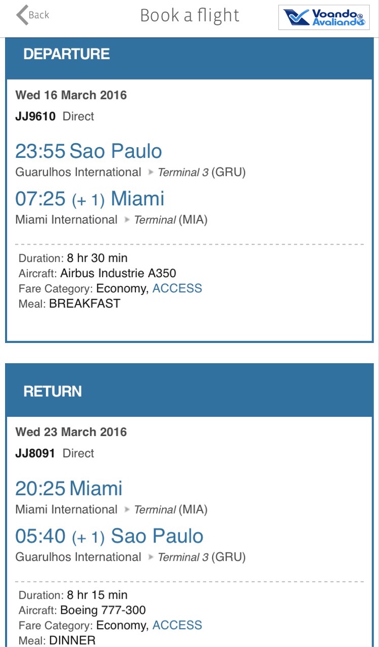– TAM (e Fidelidade): apesar das recentes evoluções, ainda tem poucas facilidades e navegação lenta; há opção de check-in, mas a minha experiência pessoal é ruim, com algumas situações de erro, simplesmente não consegui fazer; tem consulta de situação de voos e a opção “Meus voos”, onde é possível inserir dados de reservas de voos com a TAM; na parte do Fidelidade, só há consulta de saldo e indicação do seu status no Programa, nada mais; recentemente, foi inserida a opção de compra de passagem: simulei a ida de São Paulo para Miami no dia 16.03.2016, que foi o 1º voo internacional do novo Airbus A350 da TAM: