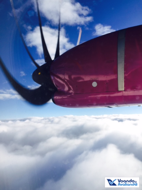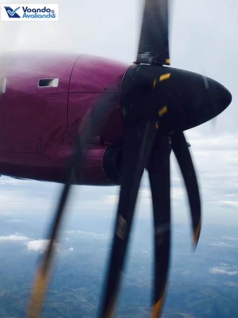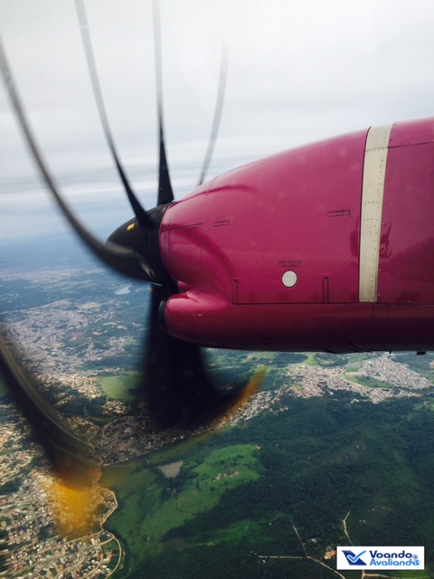 – fui conhecer o único banheiro a bordo: fica na parte traseira, muito pequeno, não é nada confortável para pessoas altas e “cheinhas”; aproveitei e tirei fotos das hélices rodando a todo vapor para impulsionar o ATR da Flyways