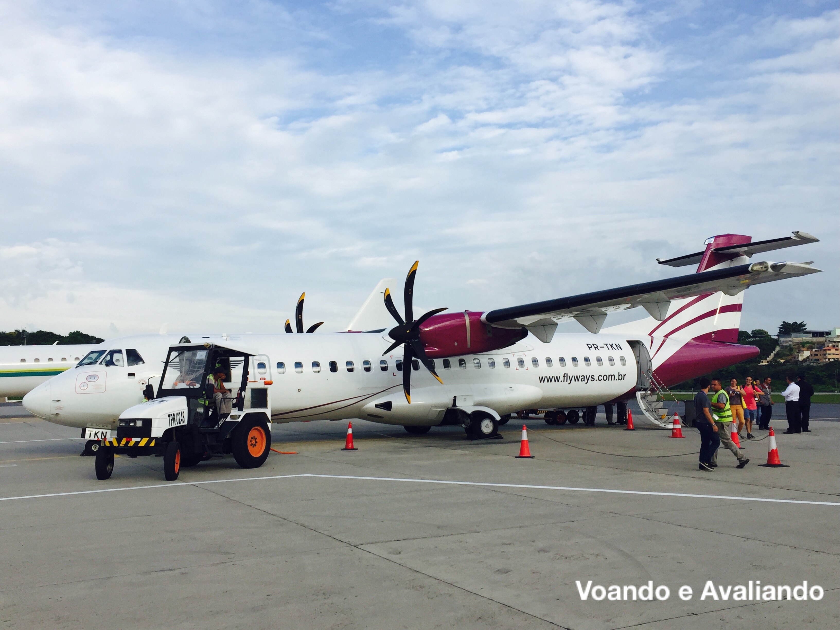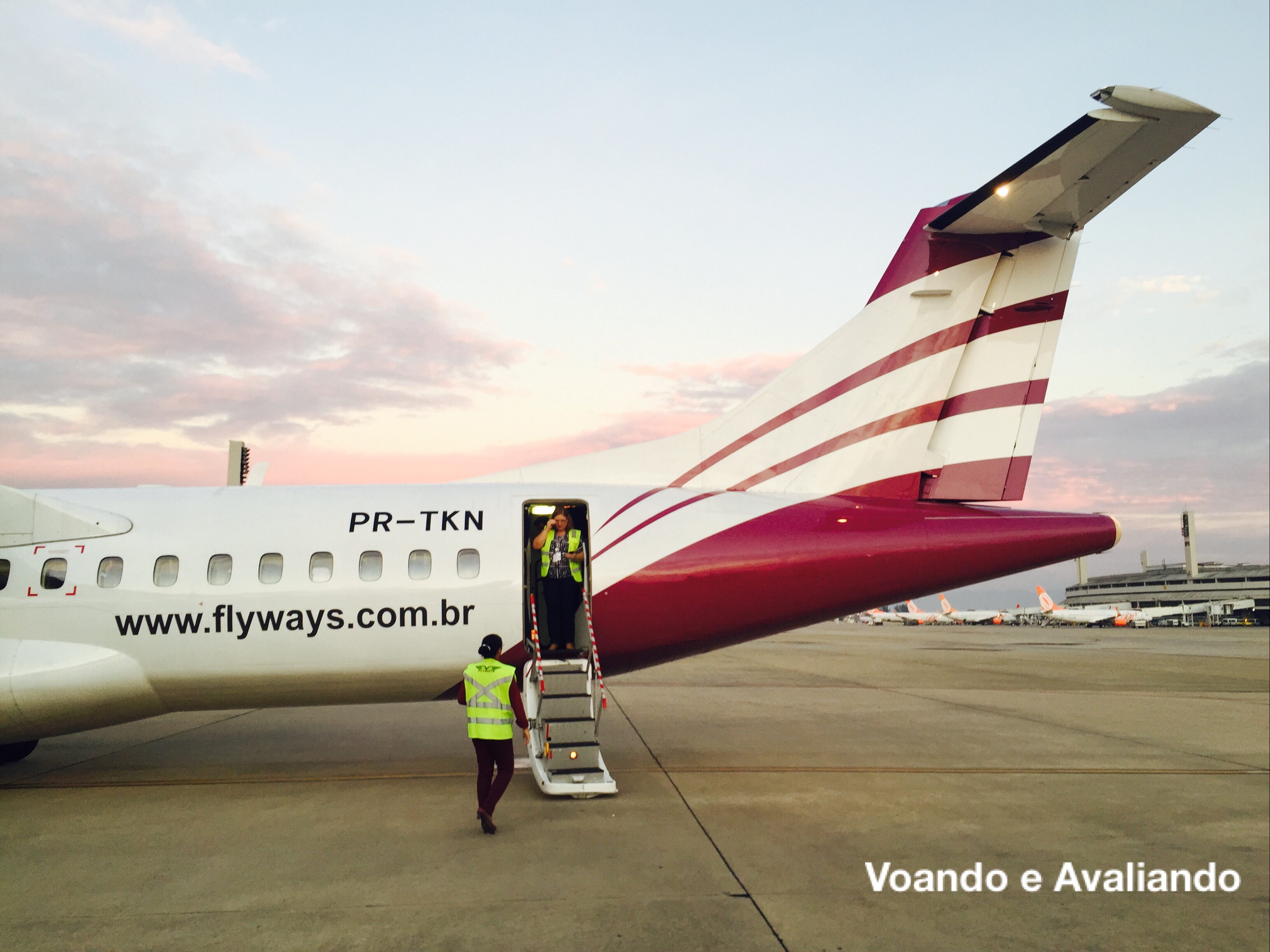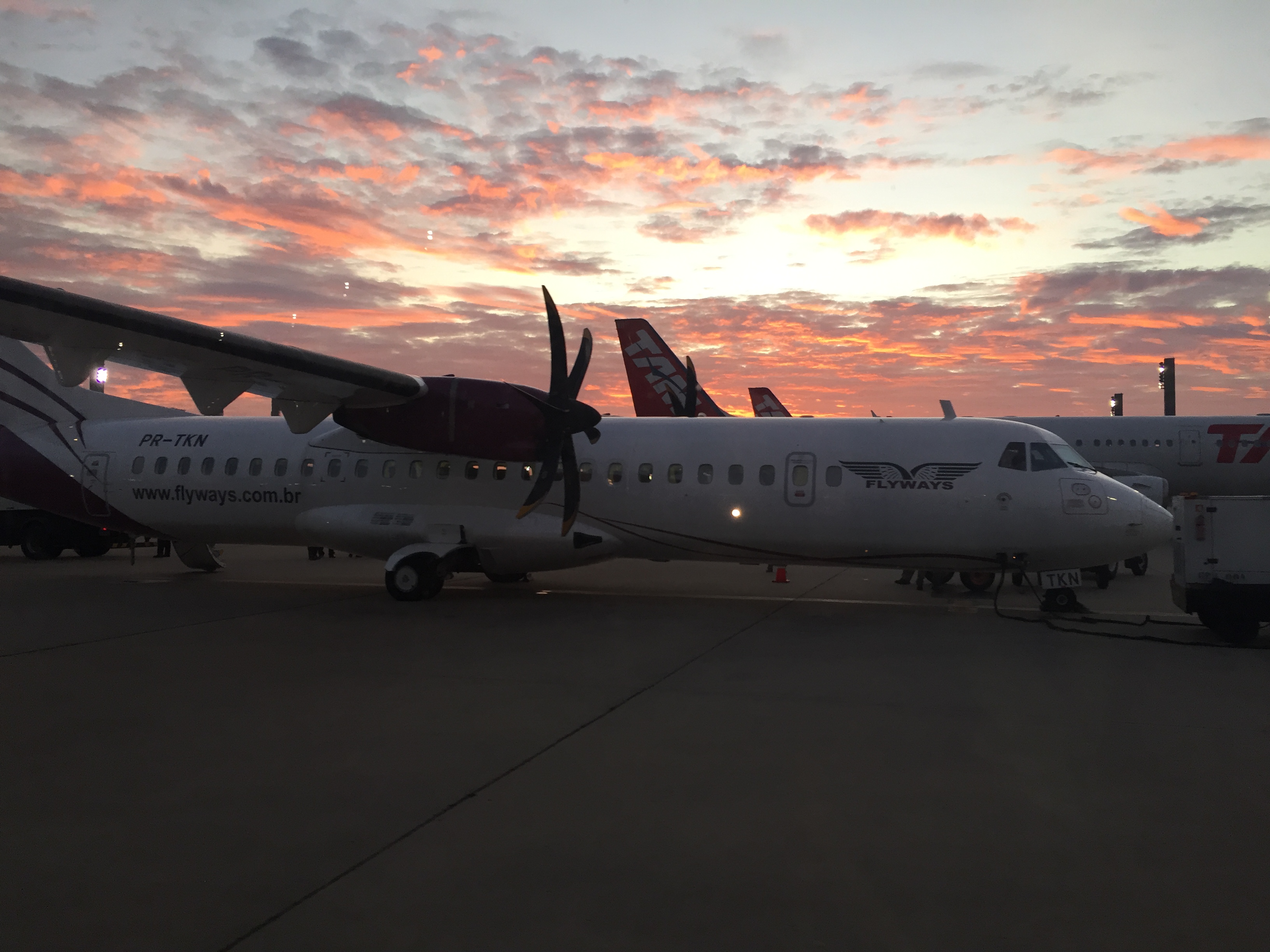 – o embarque seria feito pelo Portão R4 (remoto), onde cheguei às 05:25h; não havia nenhuma sinalização da Flyways; os poucos passageiros foram chamados somente às 05:50h: fomos direcionados para o ônibus que nos levaria ao ATR-72 (fabricação francesa) de prefixo PR-TKN, recebido pela empresa em julho de 2015; esta aeronave foi fabricada em 1999, voou antes pela espanhola Air Nostrum, pela nossa Trip e, finalmente, até jan/2015, pela nossa Azul