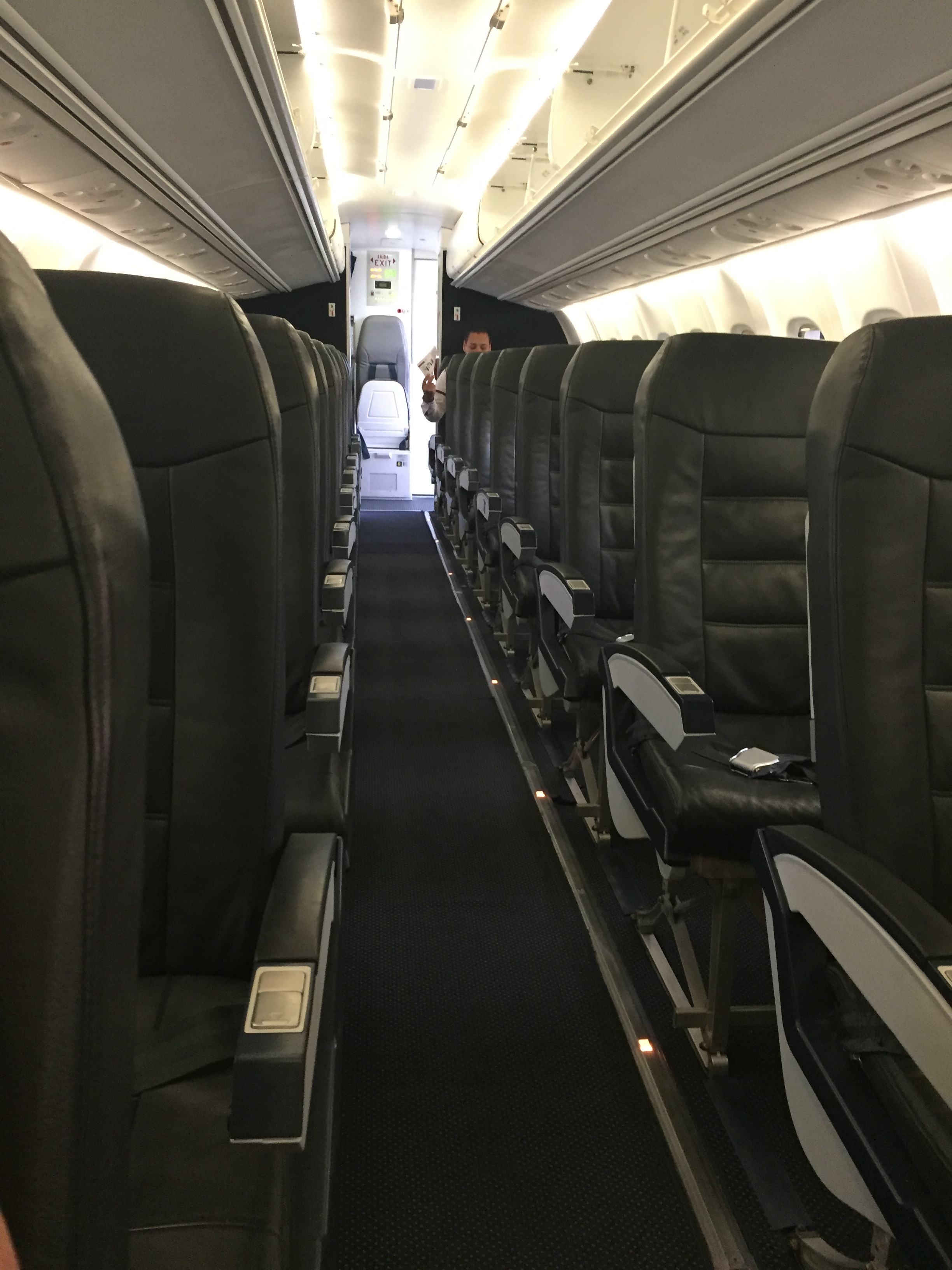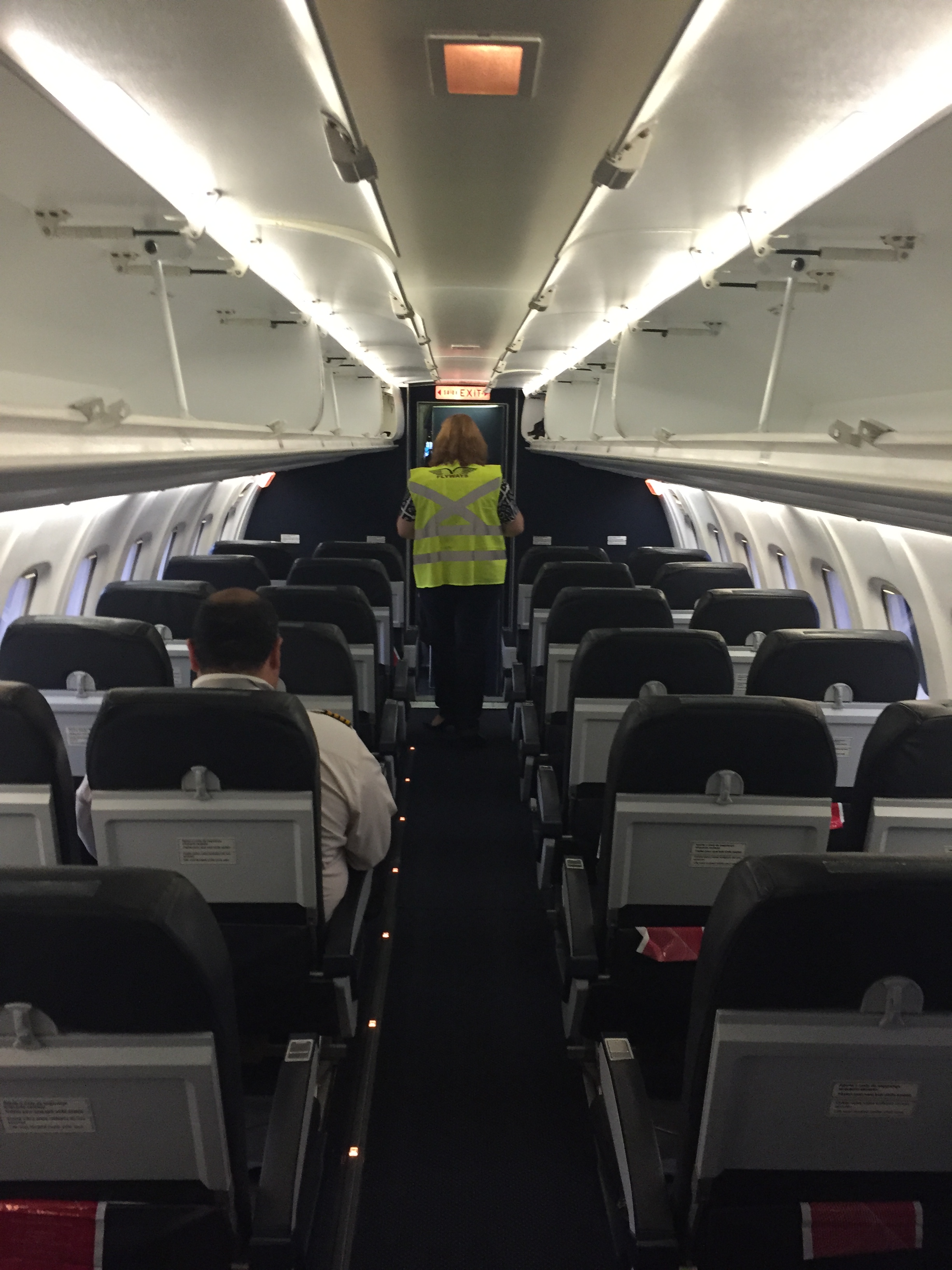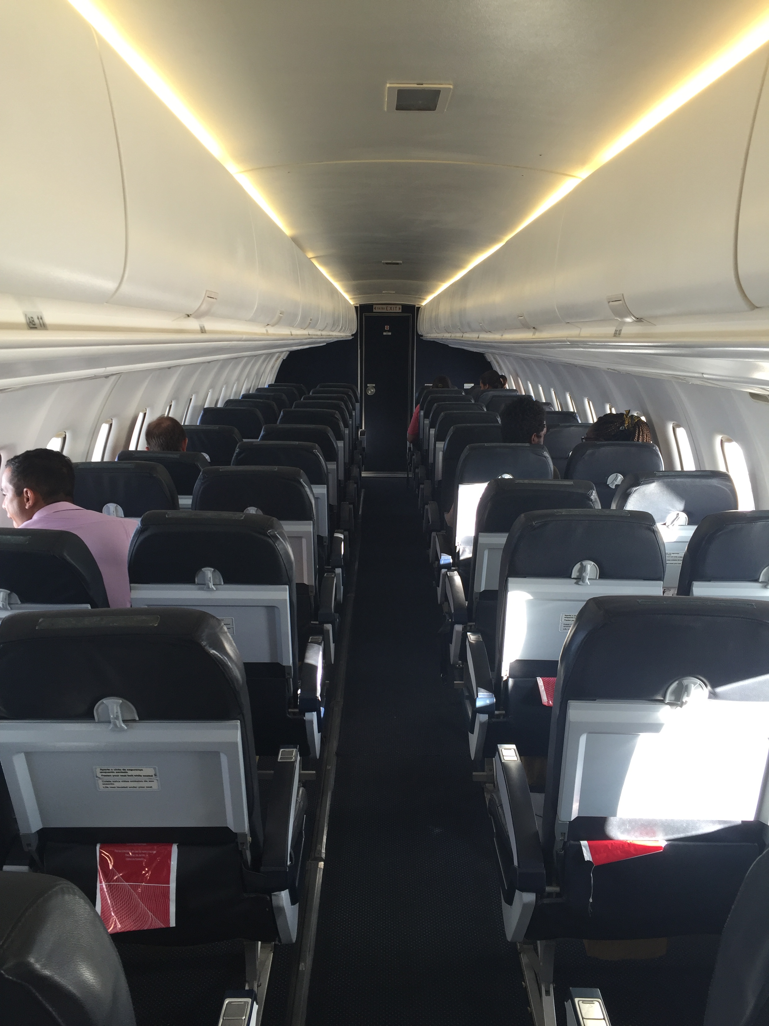 – o interior do avião está bem conservado, apesar de seus 16 anos de “batalha”: bancos de couro azul escuro na configuração 2×2; não há sistema de entretenimento/vídeo; o espaço para as pernas não é dos melhores, mas para um voo de curta duração não foi um problema; o voo estava realmente vazio: éramos apenas 07 passageiros, 02 tripulantes e mais 04 funcionários da Flyways; foi solicitado que ninguém mudasse de lugar durante o voo para o correto balanceamento da aeronave