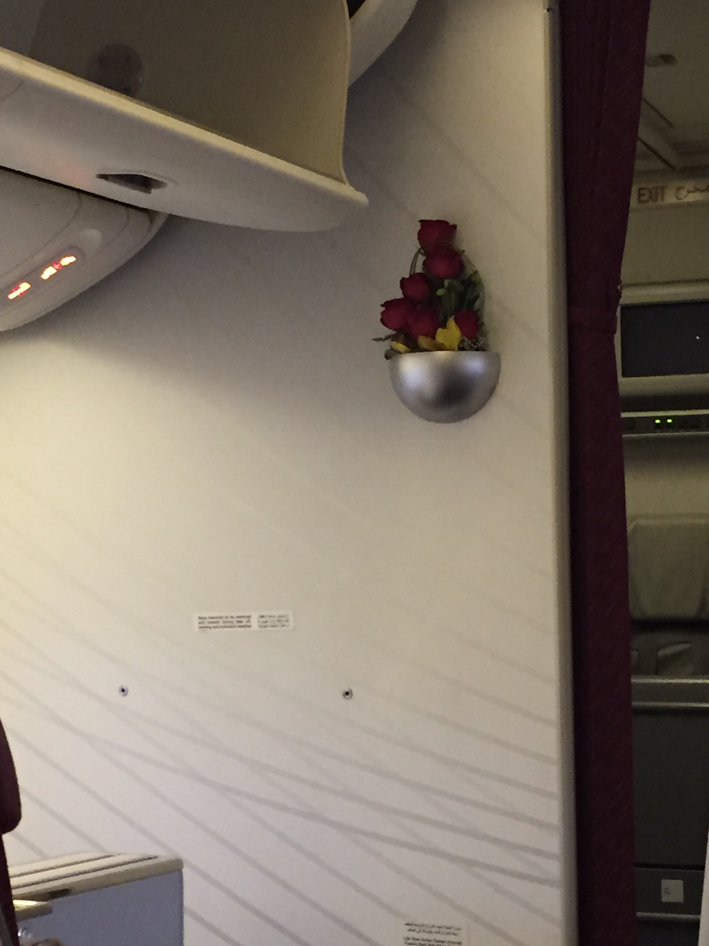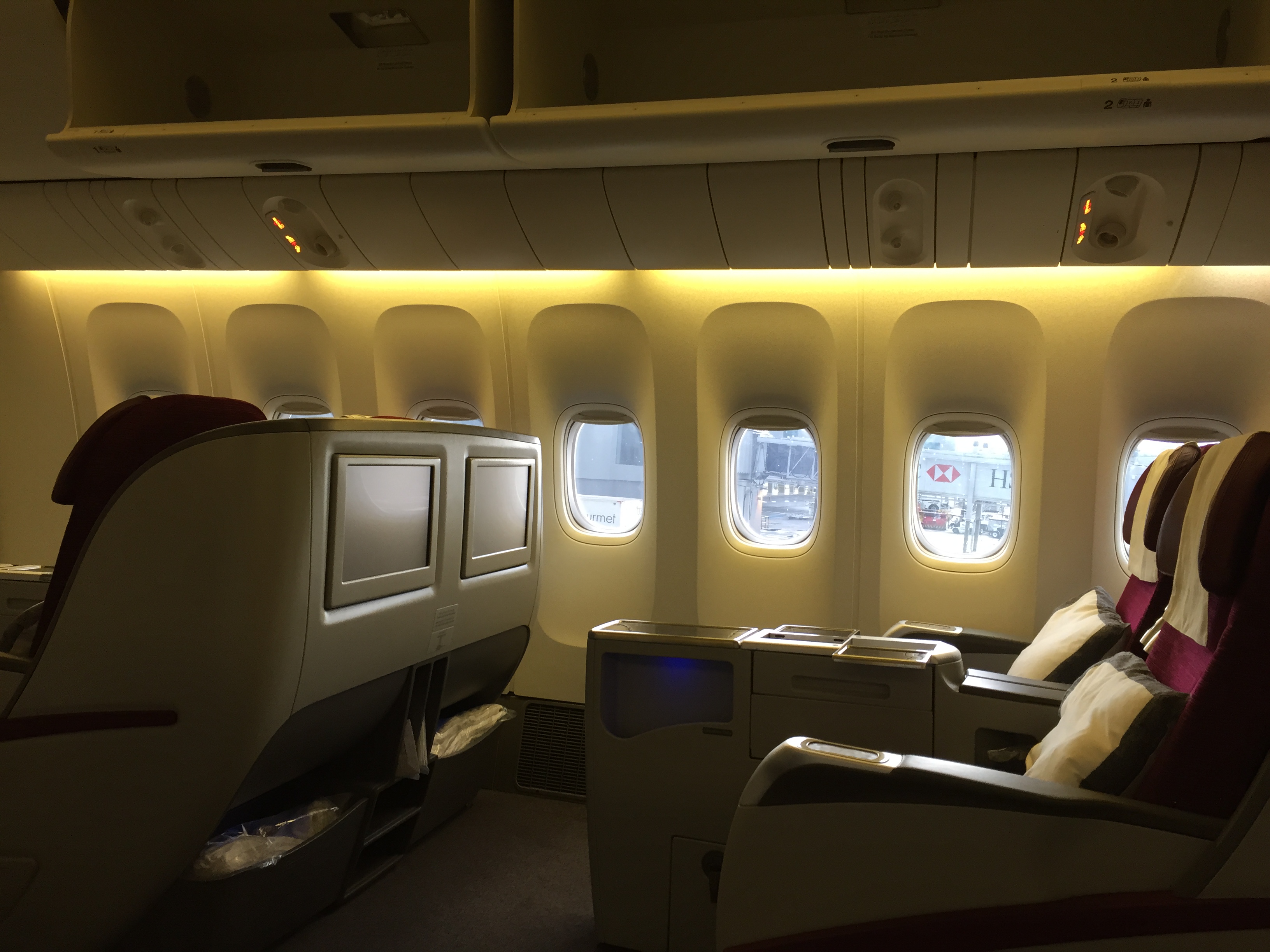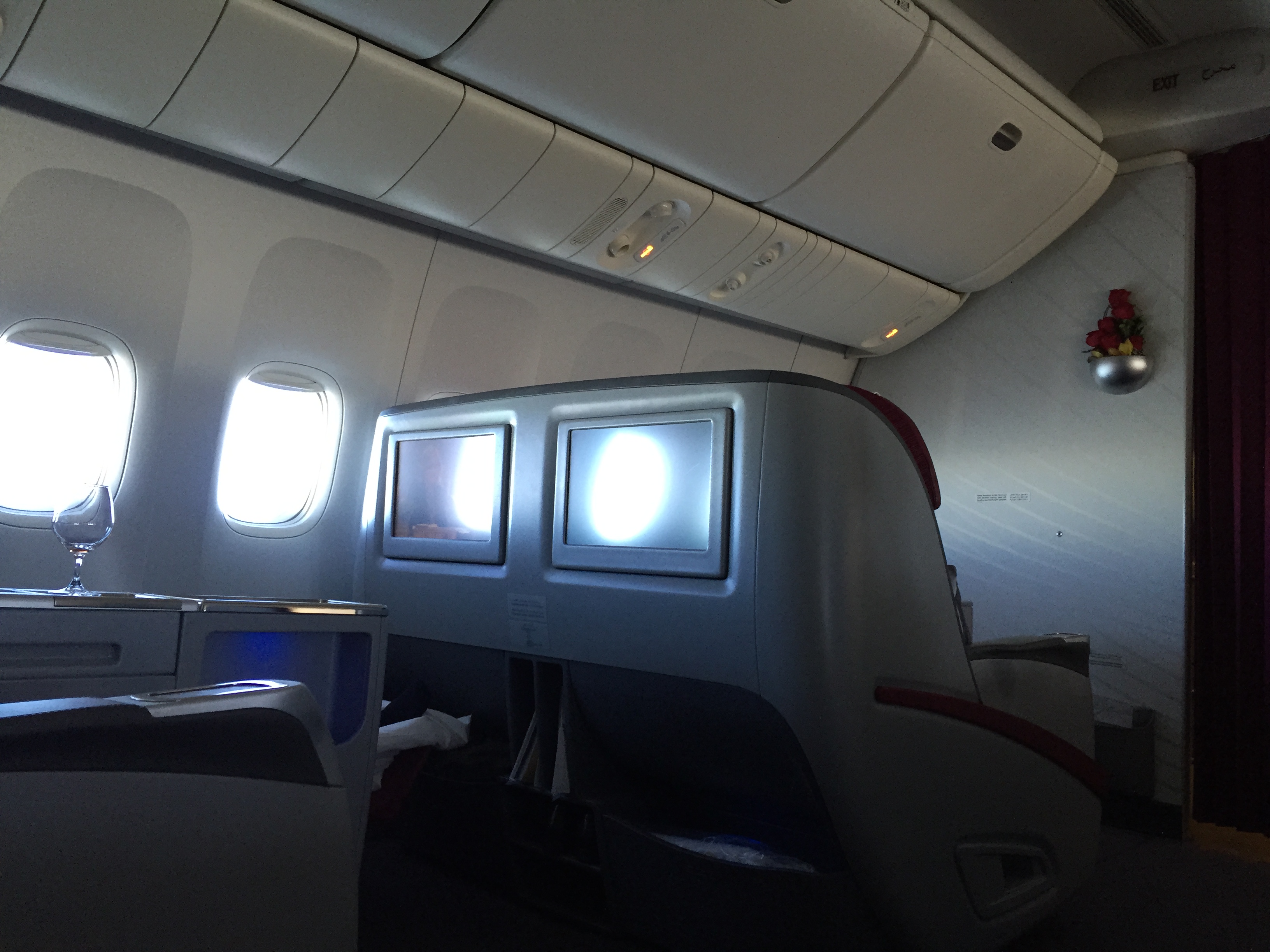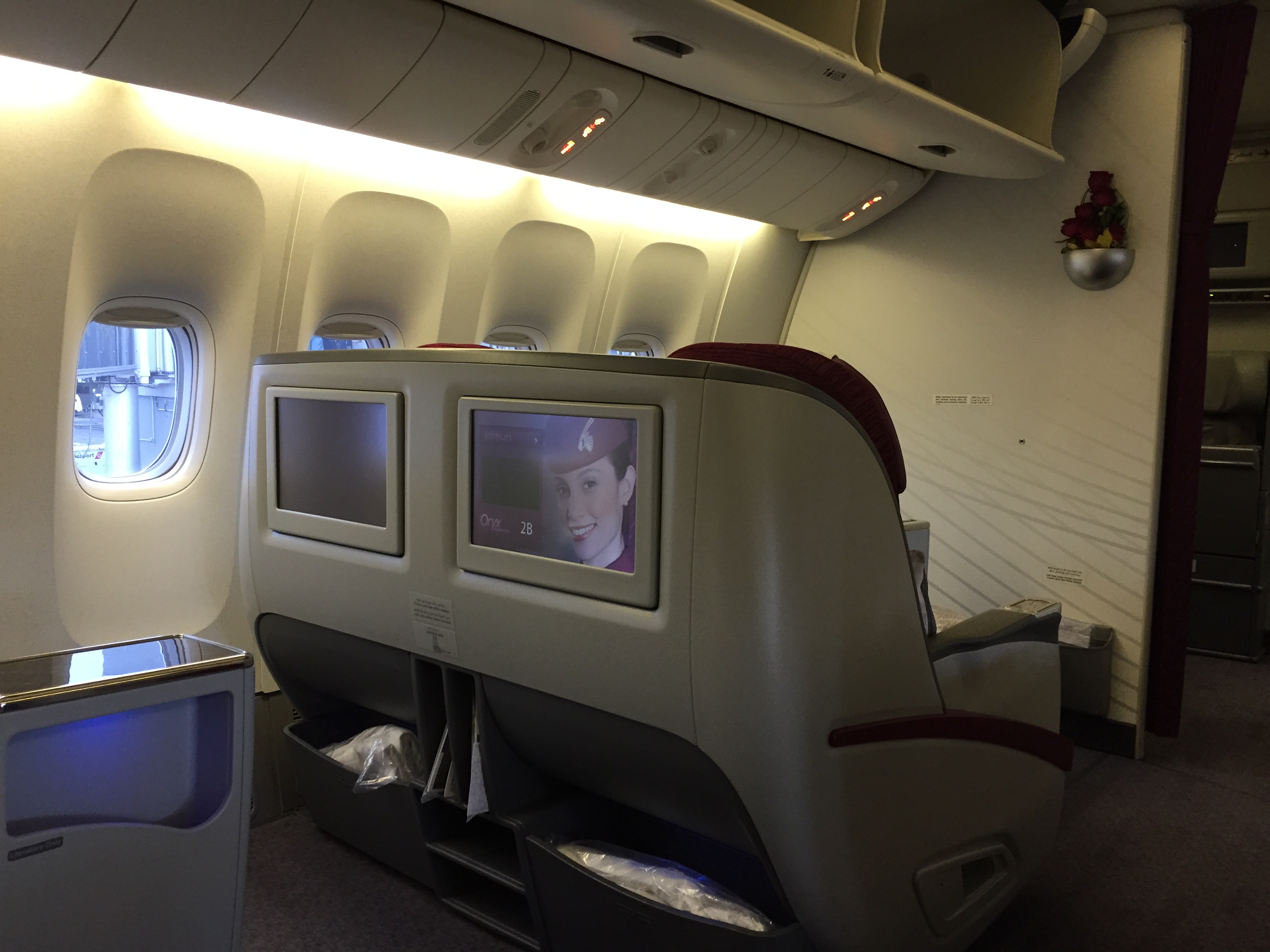 – a configuração do Boeing “Triplo 7”, prefixo: A7-BBH – entregue em agosto de 2010, era 2x2x2, ou seja, muito espaço para todos os ocupantes (a TAM utiliza a configuração 2x3x2); a localização dos botões de controle do assento é ótima, evita toques involuntários; da mesma forma, o controle remoto do sistema de entretenimento fica sob o encosto de braço do lado direito; neste trecho e dia, decolamos com 50% de ocupação da Business (são 07 fileiras, ou seja, 42 lugares)