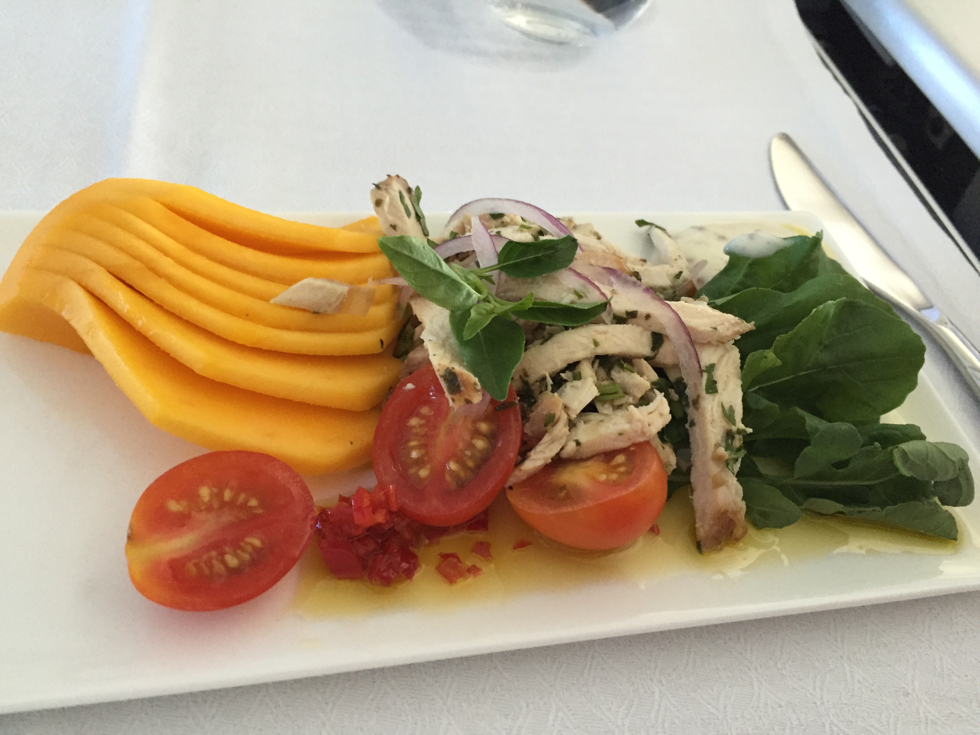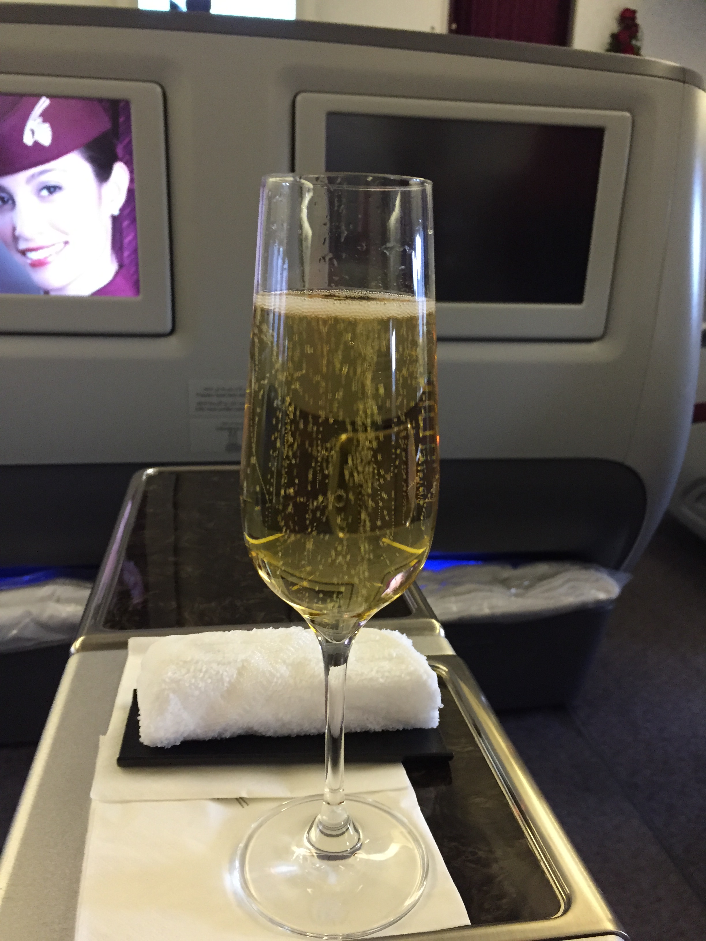 – recepcionado com muitos sorrisos pela Aeromoça Andreia; brasileira, me recebeu em português e me acompanhou até o meu assento e me ofereceu 3 tipos de champagne, o que surpreendeu