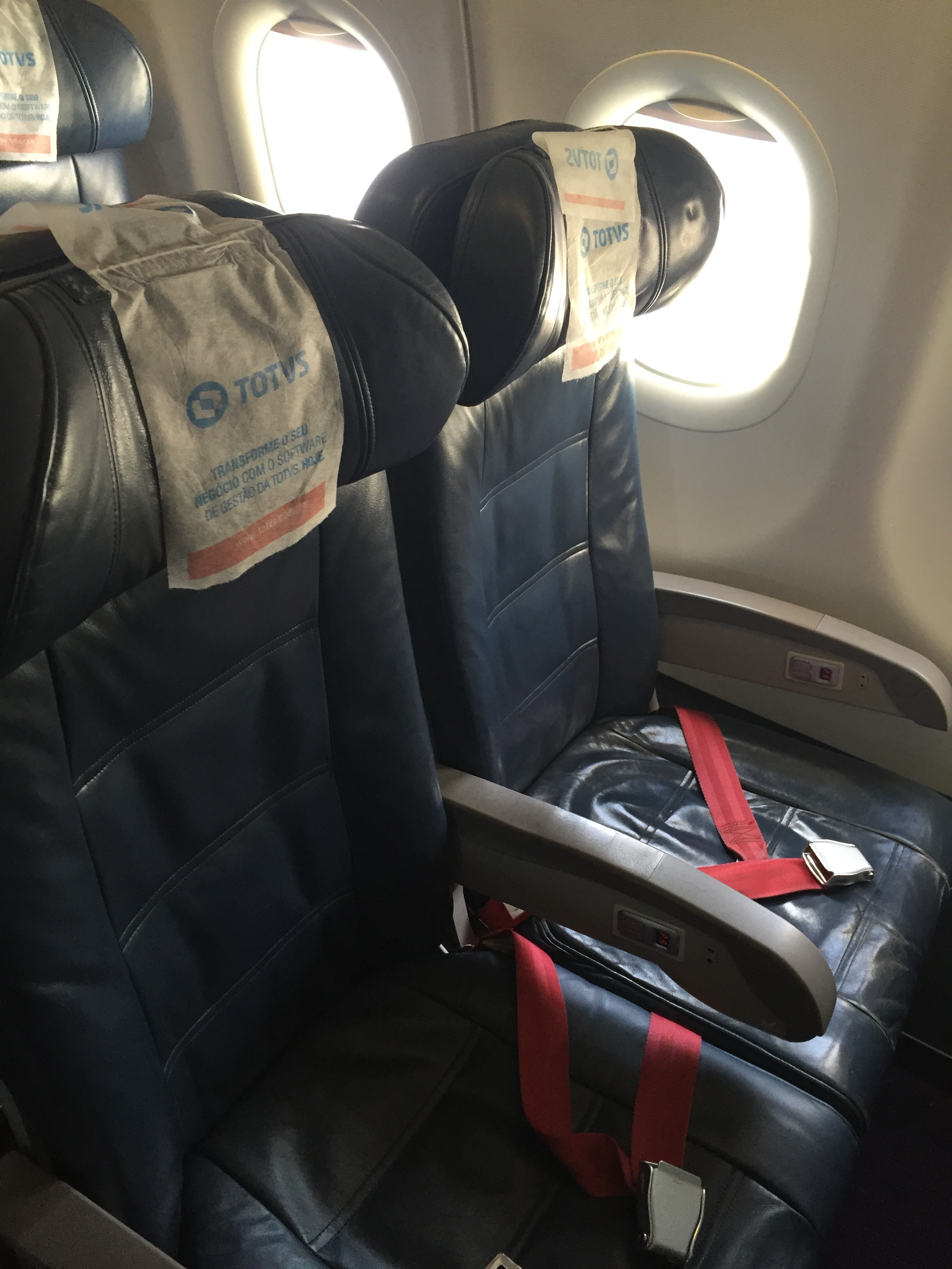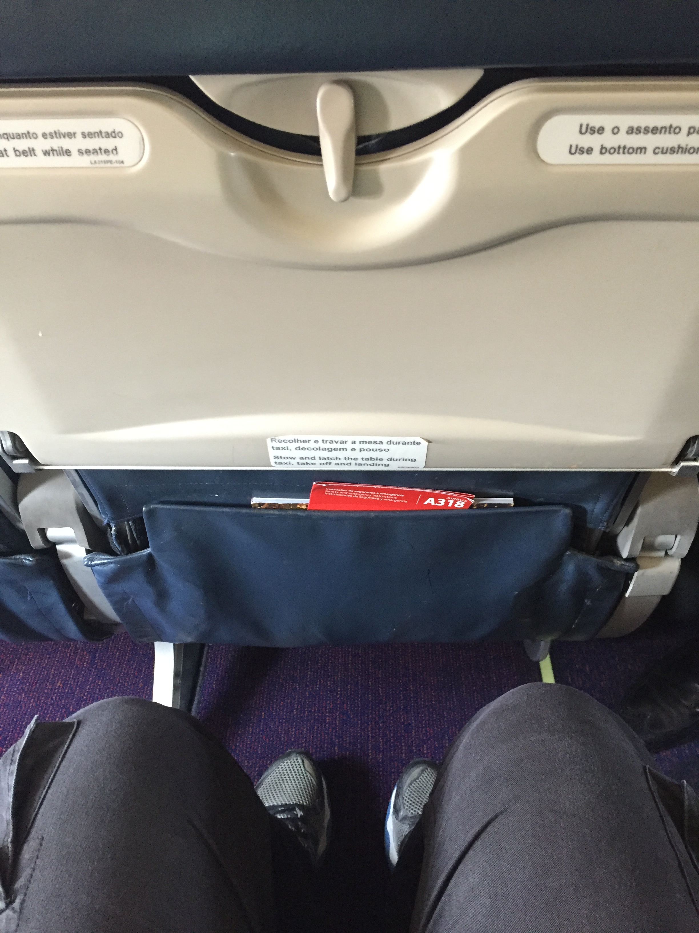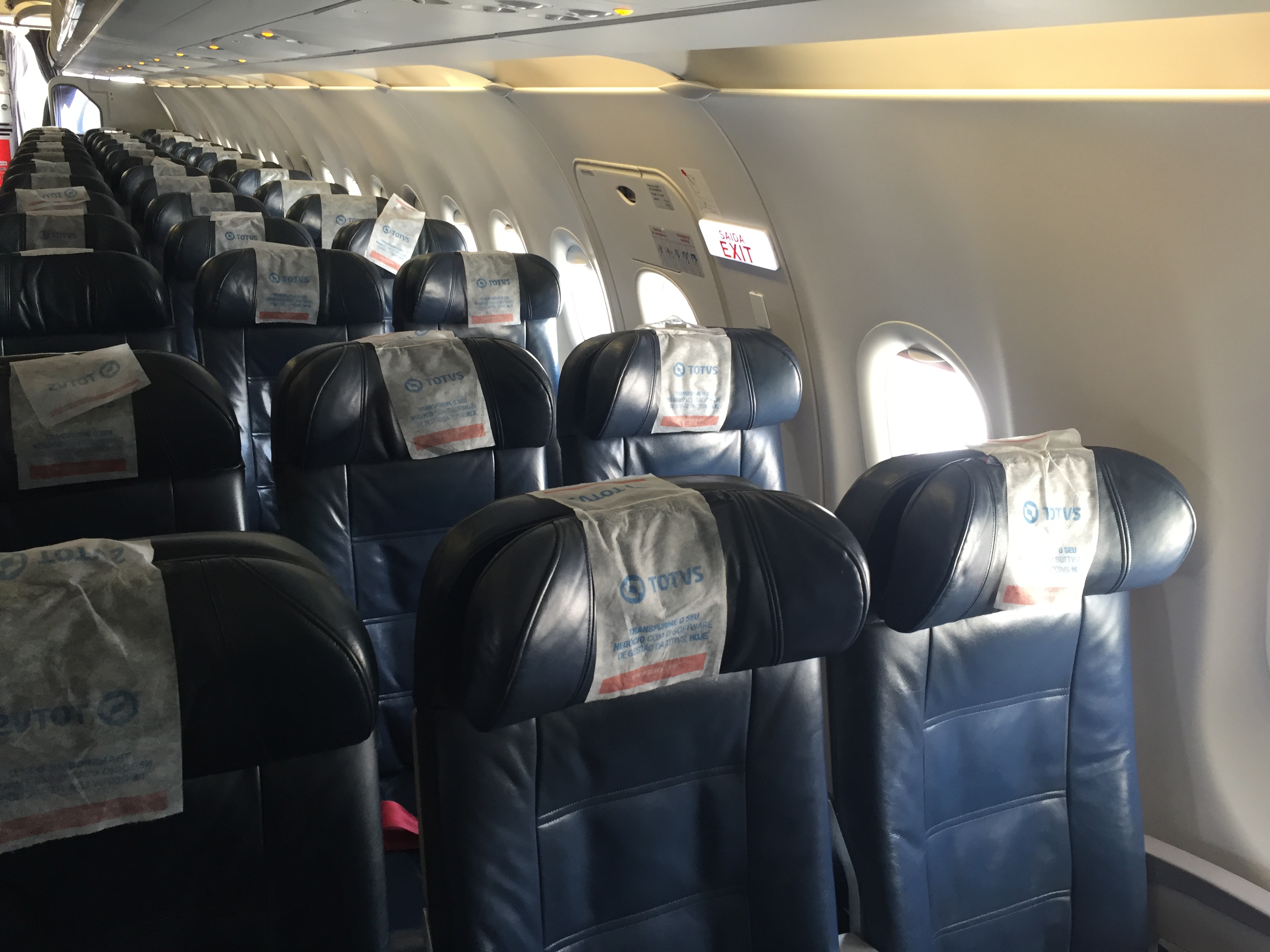 – o embarque foi anunciado às 07:45h: usei a fila de prioridades com meu cartão Gold (obtido com a promoção de status match que a Avianca está fazendo); entrei rapidamente no A318 (o menor modelo da Airbus, são apenas 120 lugares), de prefixo PR-AVL, recebido pela Avianca em junho de 2011 (antes, voou a partir de dezembro de 2007 com a LAN Chile), bancos de couro azul escuro na tradicional configuração 3×3, sistema de entretenimento coletivo e bom espaço para as pernas (selo A da ANAC); o voo não estava lotado, cerca de 60% de ocupação