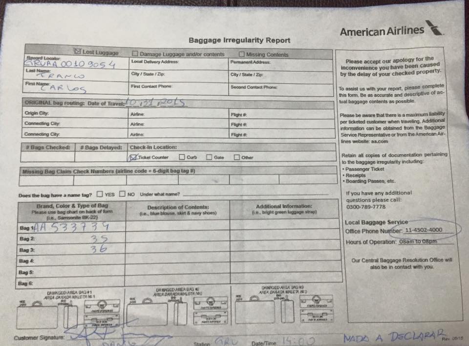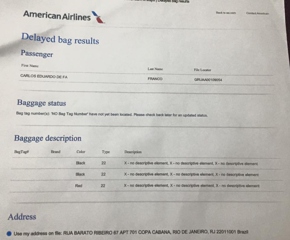 Resumo: a AA não tem preocupação alguma em ser eficiente, não tem compromisso em te entregar as malas de acordo com seu voo e demonstra total incompetência na gestão das malas extraviadas. Não ter um sistema de rastreamento das bagagens minimamente eficiente em 2015, com a quantidade de tecnologia disponível, é inacreditável.
