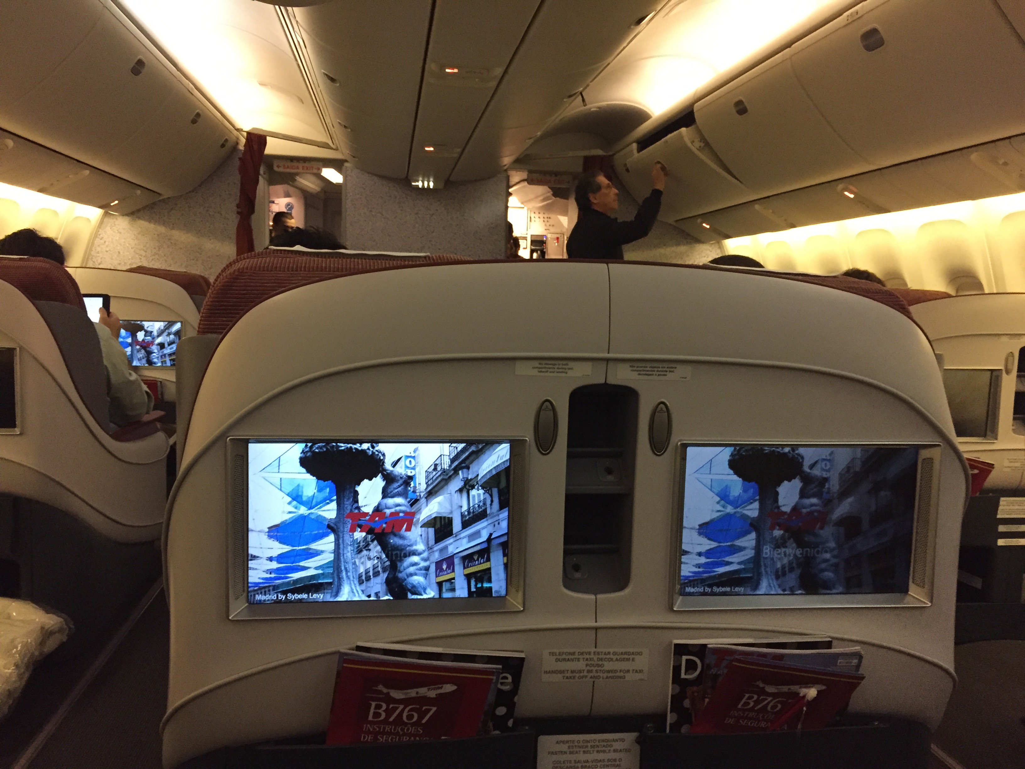 – fui recepcionado pela Chefe de Cabine Simone na porta do Boeing 767-300ER, prefixo PT-MSX, entregue à TAM em julho de 2013 (originalmente entregue à LAN em dezembro de 2012), o mesmo que voei em abril para NYC; na Business a configuração é 2x2x2 (na econômica é 2x3x2, todas com tela individual de entretenimento); a aeronave aparentava estar nova, muito bem cuidada; todos os lugares do voo estavam ocupados, casa totalmente cheia neste voo