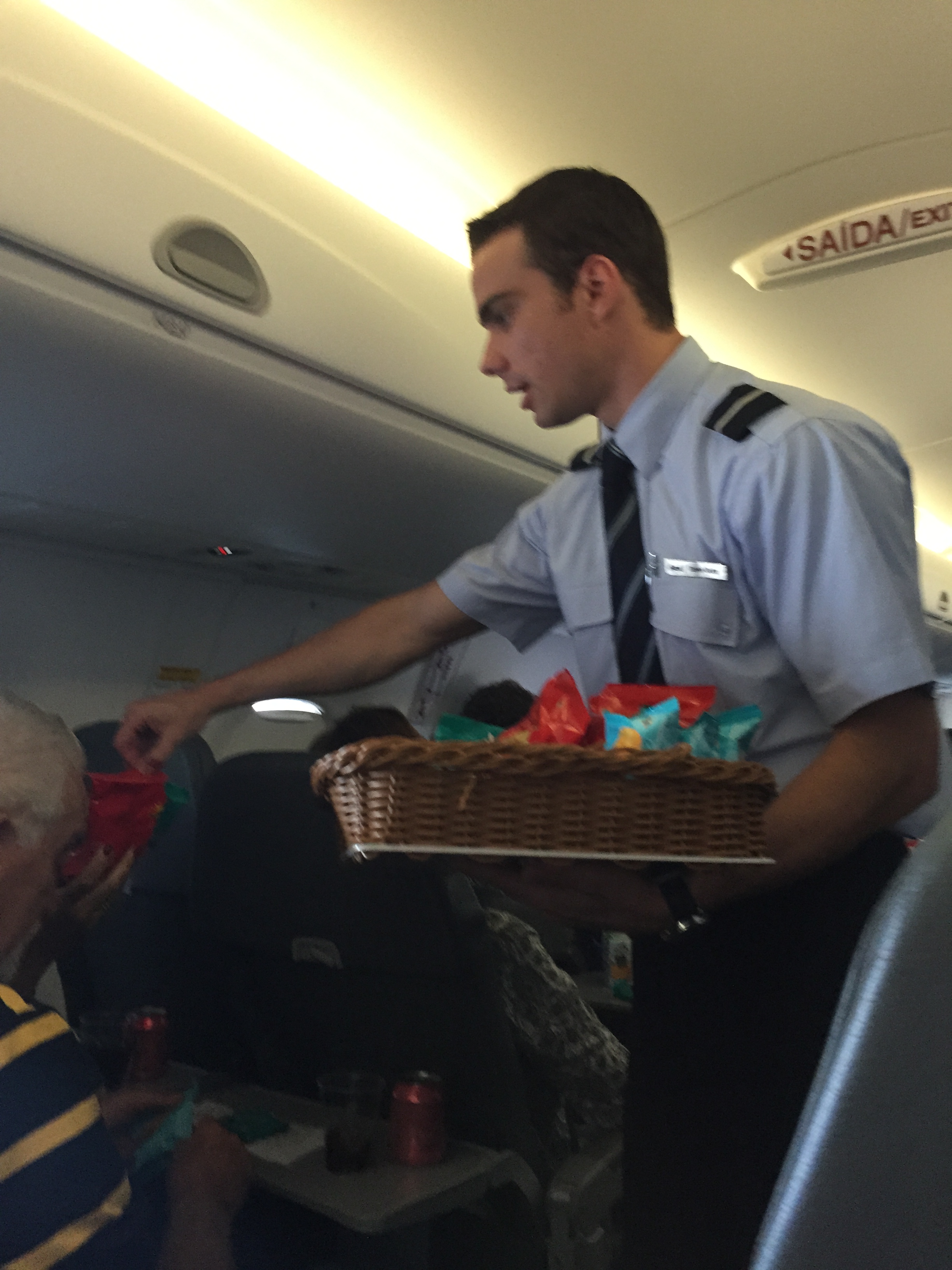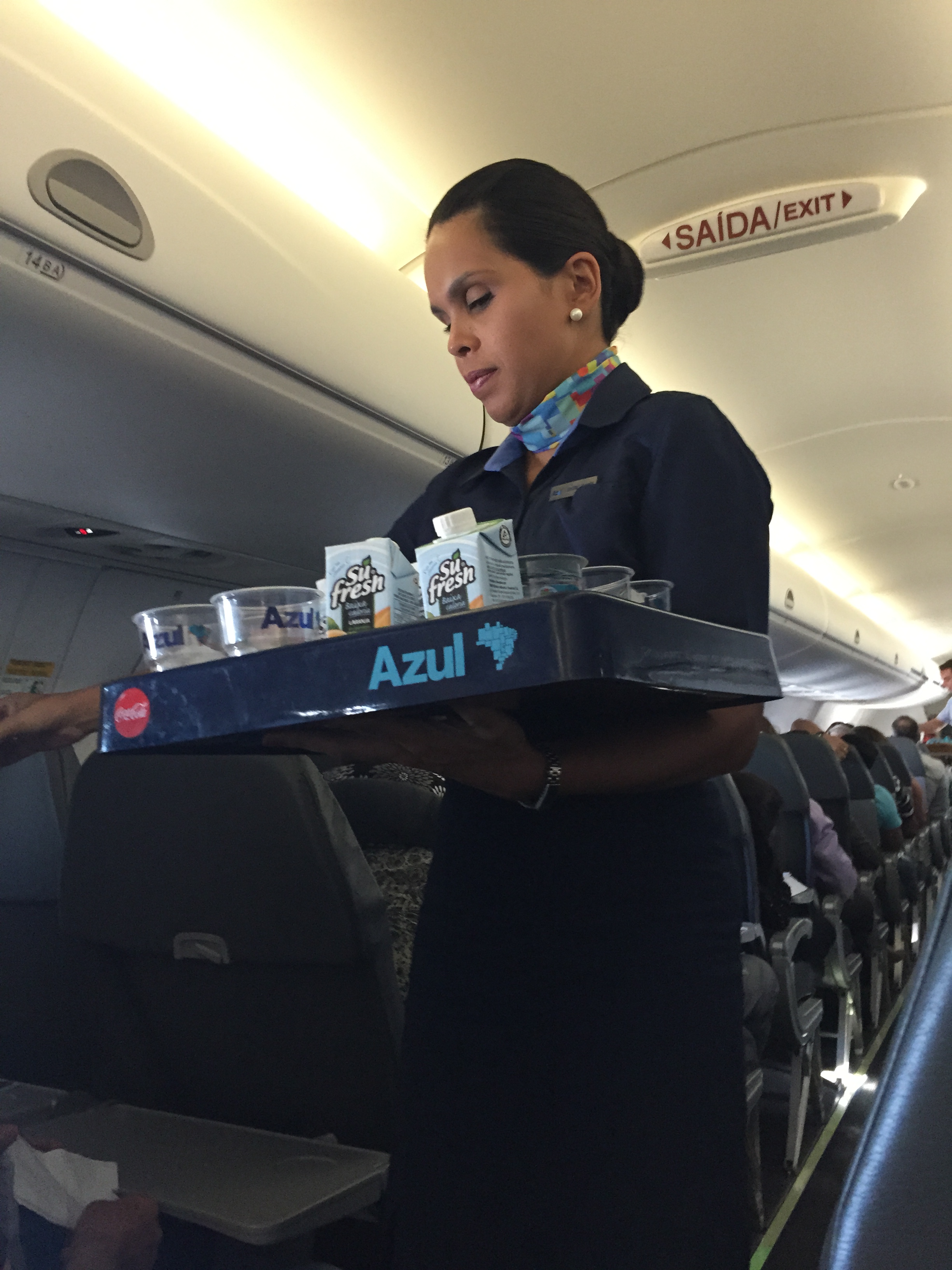 – o serviço de bordo da Azul se diferencia com relação às concorrentes TAM e Gol e foi iniciado as 07:55h; a Comissária Jordana passou de poltrona em poltrona anotando a escolha das bebidas dos passageiros e entregando guardanapos; logo em seguida, ela voltou com uma pequena bandeja com as escolhas de alguns passageiros e as serviu; depois o Comissário Daniel ostentou uma bandeja com as opções de snacks: bala de gelatina, biscoito goiabinha, biscoito de polvilho ou bolo de laranja, todos personalizados com logo da Azul