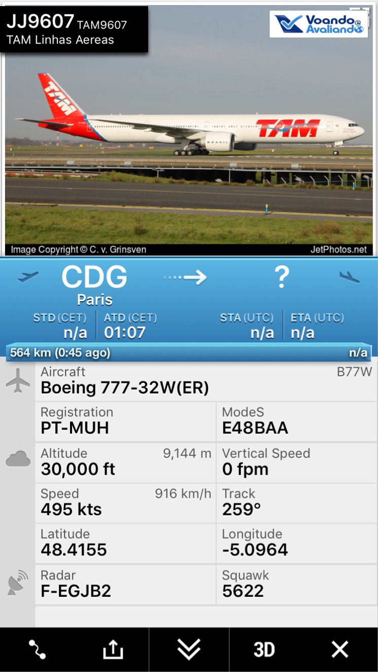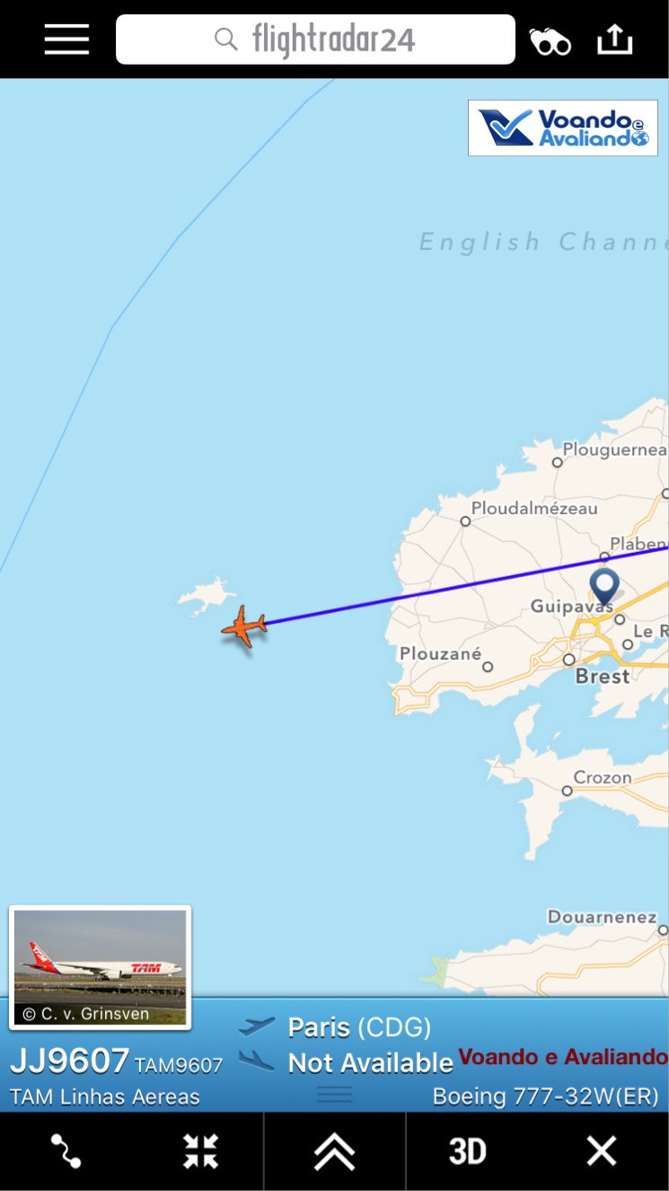 E reparem no Boeing 777-300 da TAM sobrevoando o Oceano Atlântico vindo de Paris em direção à cidade de São Paulo: