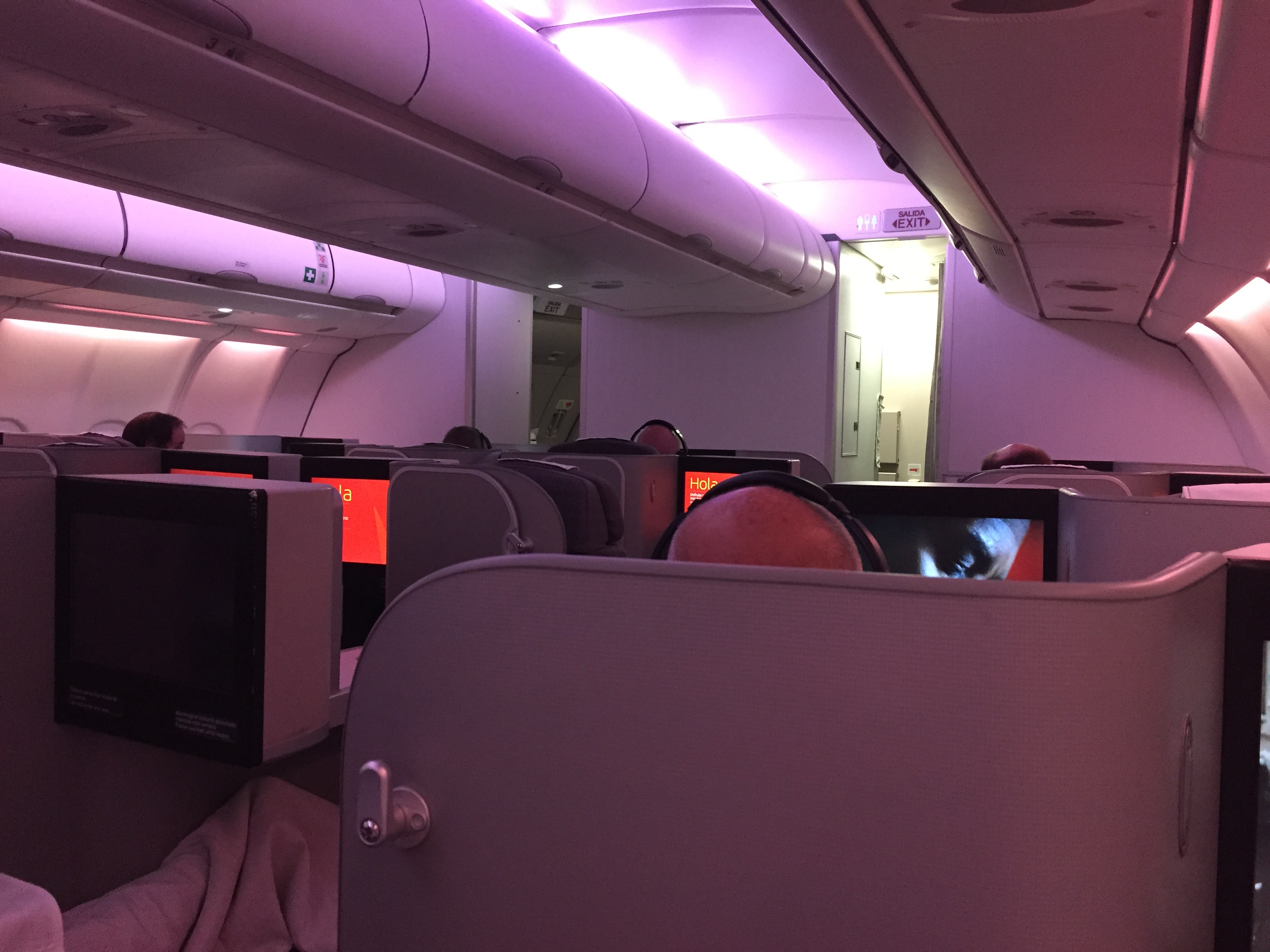 – o A330-300 que nos levaria a Madrid (prefixo EC-LUB apelido “Tikal”) foi recebida pela Iberia em fevereiro de 2013, portanto, é nova e está muito bem cuidada; não é a 1ª vez que viajo neste tipo de avião, na verdade, não são poltronas, parecem mais uns casulos individuais (foto) e, por isso, esta configuração das poltronas na Business continua chamando a atenção: não tem uma disposição uniforme e todos os passageiros têm acesso direto ao corredor, é ótimo não ter que “pular” o passageiro dormindo ao seu lado para ir ao banheiro durante a noite; 28 das 36 poltronas (9 fileiras de 4) estavam ocupadas, a casa não estava tão cheia neste voo
