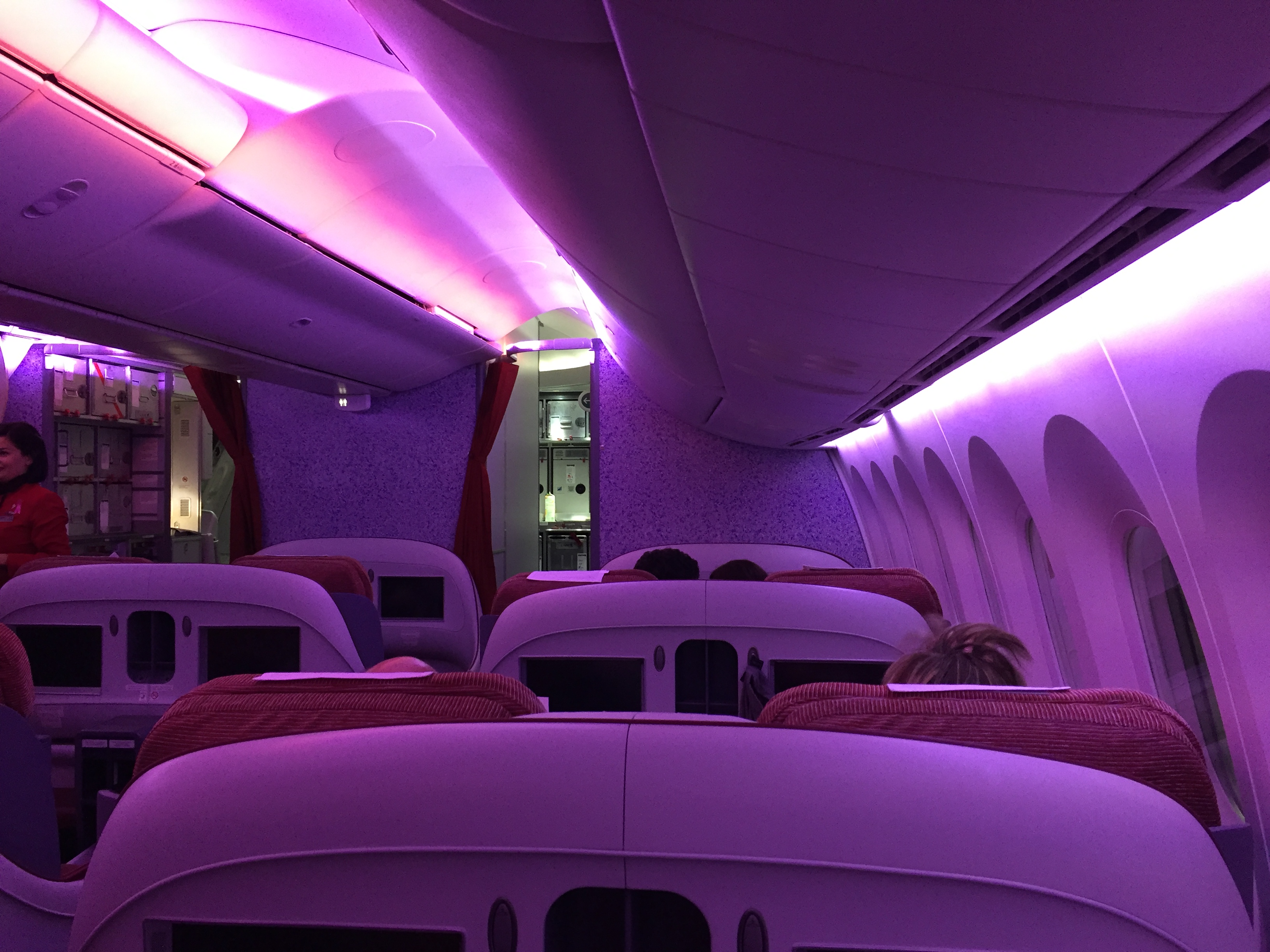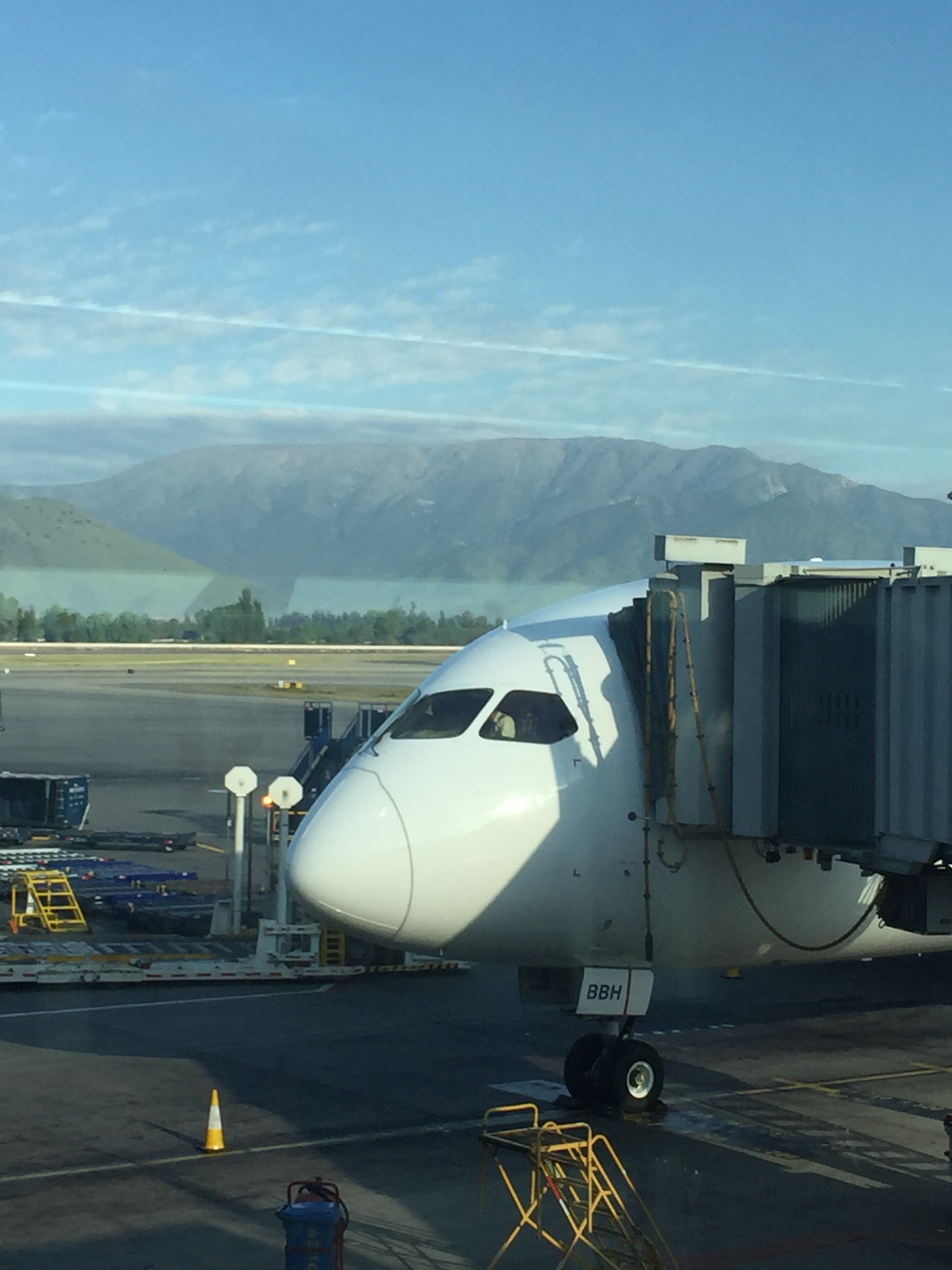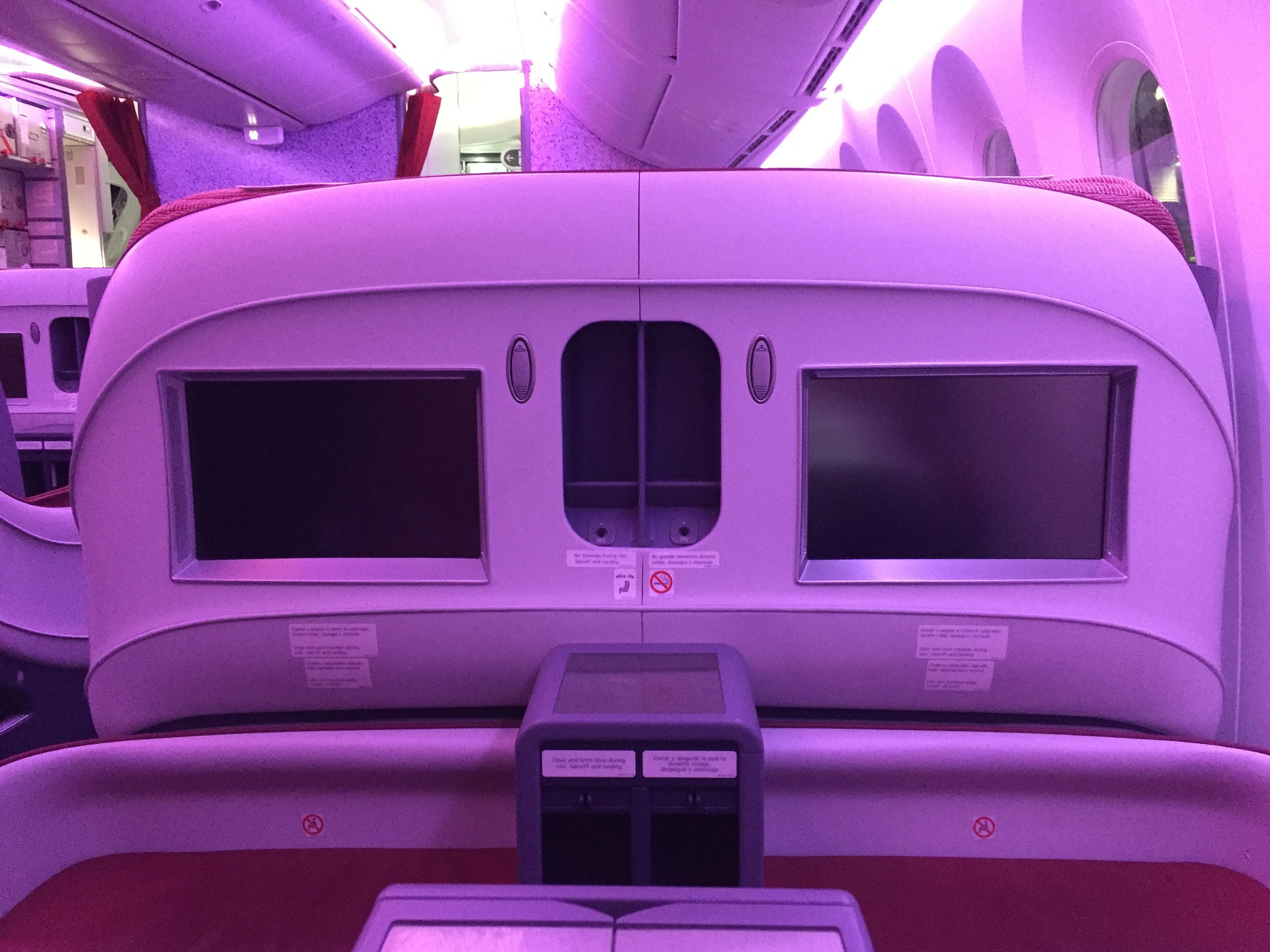 – o Boeing B787-800, prefixo CC-BBH, foi entregue em setembro de 2014 e está novinho; as janelas são enormes, impressiona pelo tamanho, muito maior do que de outros aviões; não há cortinas, há um “dimmer” para controlar a entrada de luminosidade; o sistema Sky Interior da Boeing fazia um ambiente acolhedor, com as luzes em tom laranja iluminado a cabine