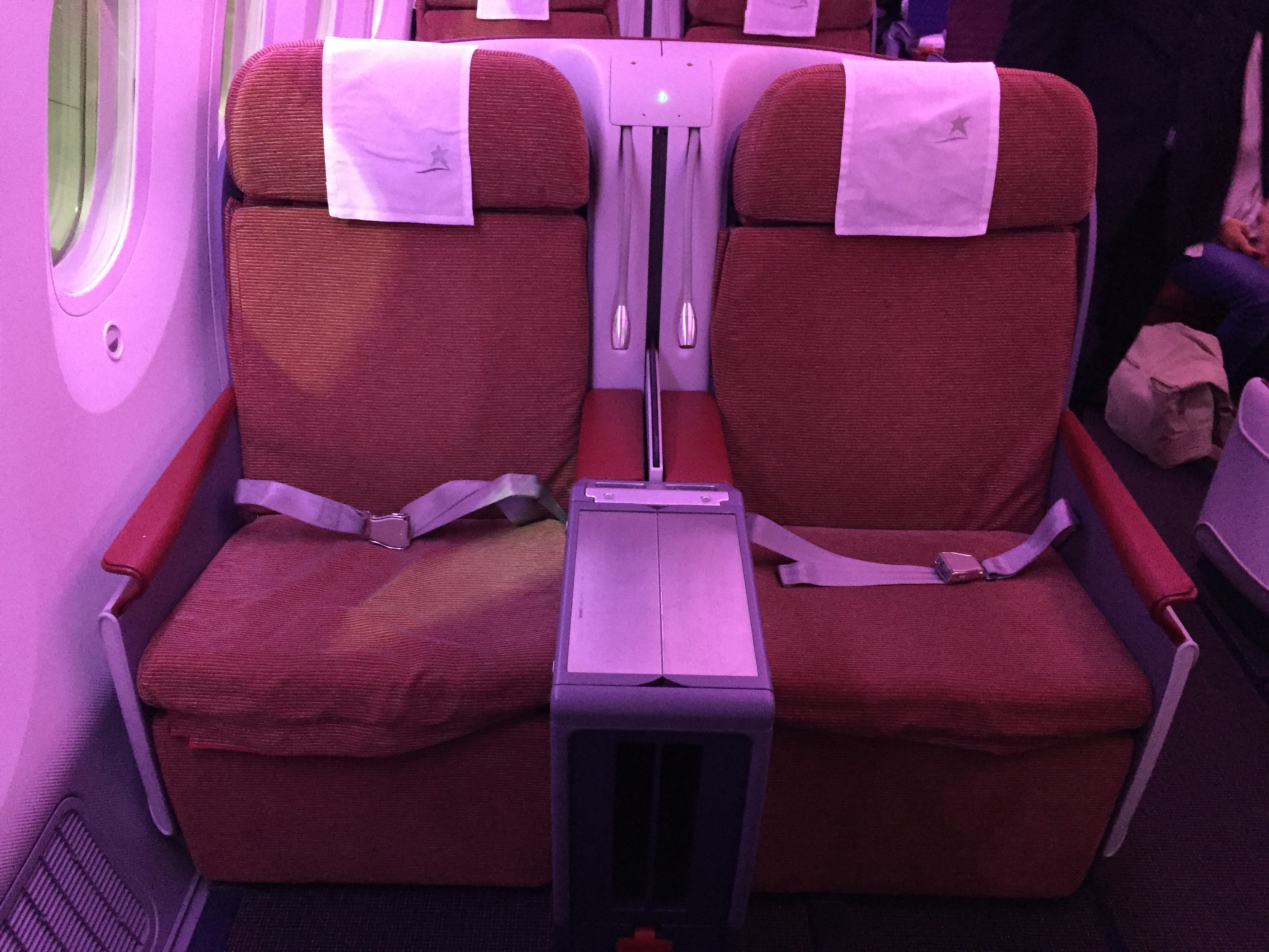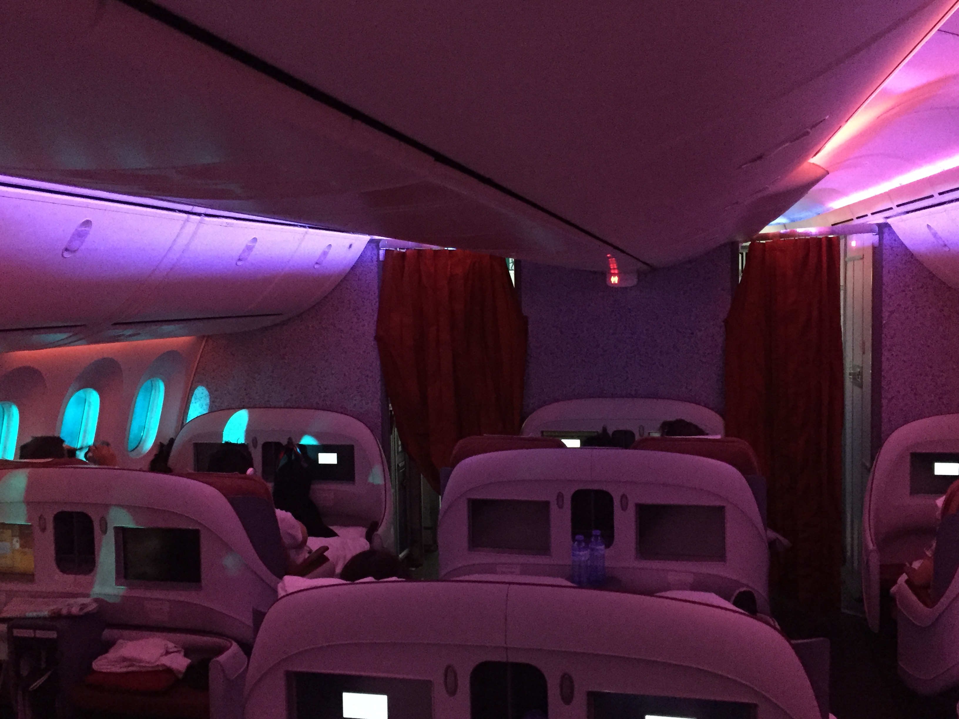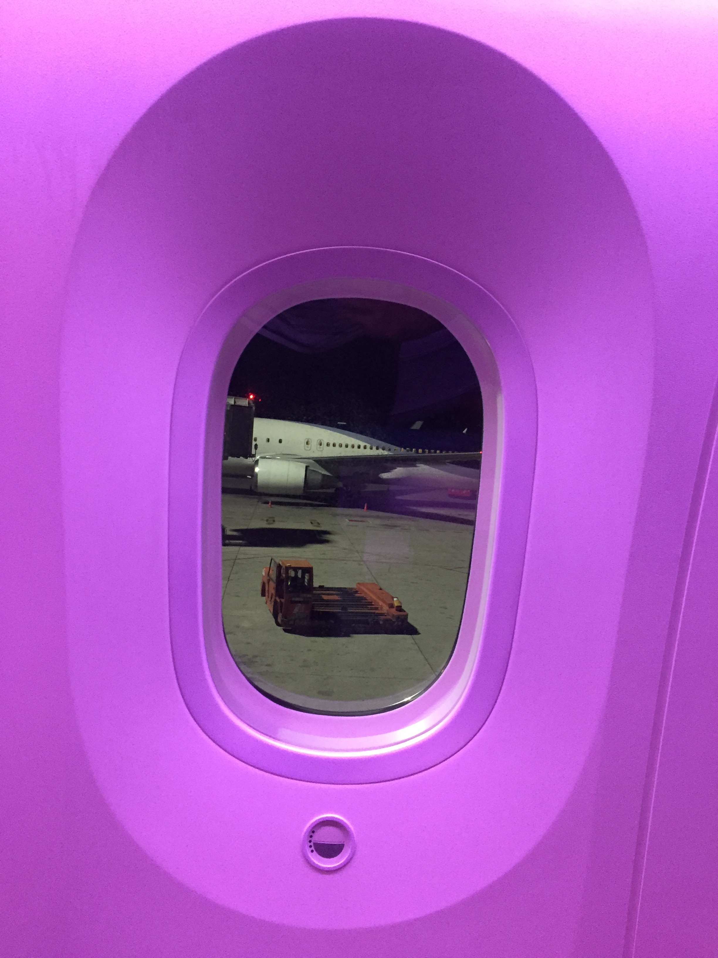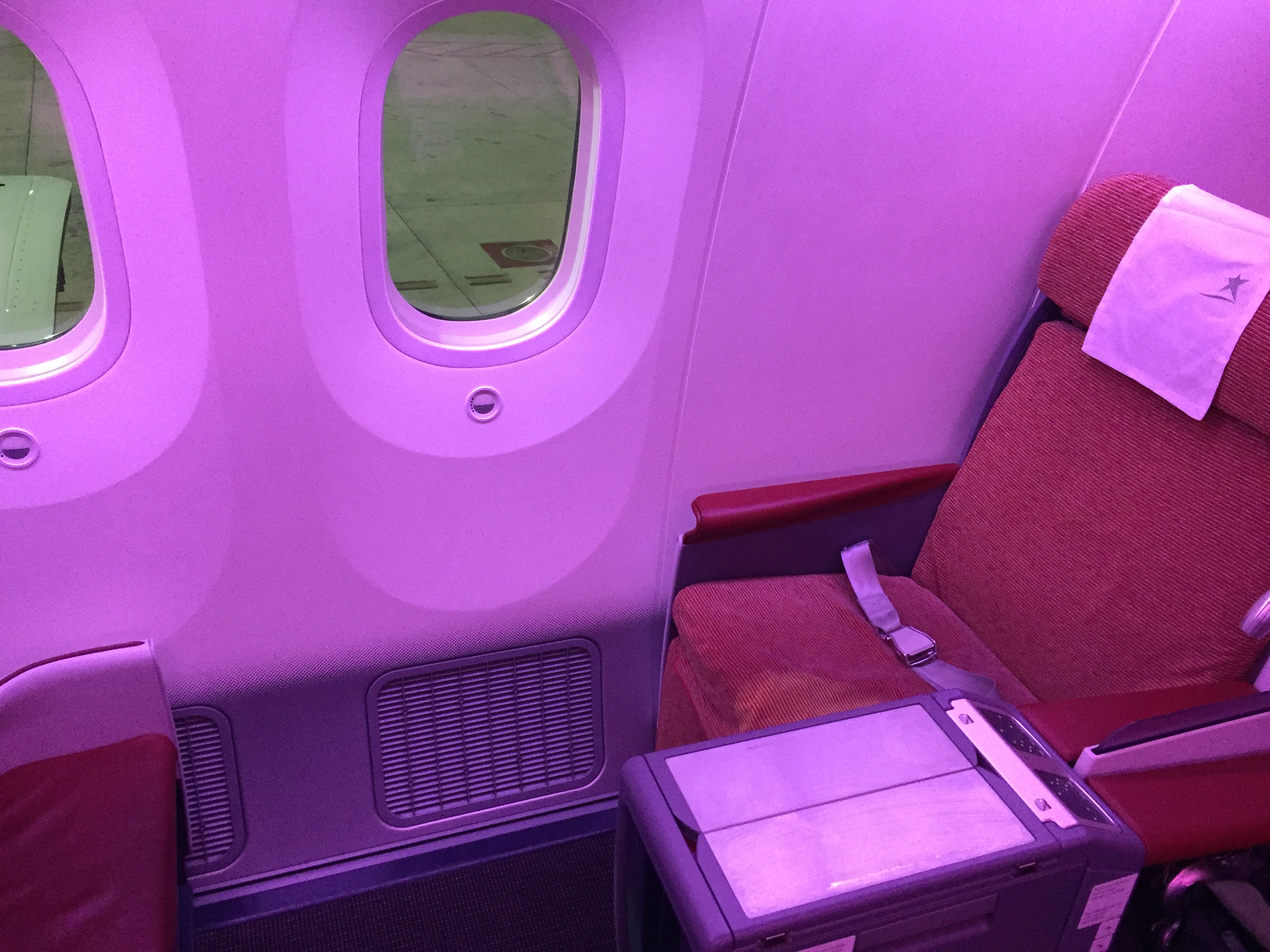 – o Boeing B787-800, prefixo CC-BBH, foi entregue em setembro de 2014 e está novinho; as janelas são enormes, impressiona pelo tamanho, muito maior do que de outros aviões; não há cortinas, há um “dimmer” para controlar a entrada de luminosidade; o sistema Sky Interior da Boeing fazia um ambiente acolhedor, com as luzes em tom laranja iluminado a cabine