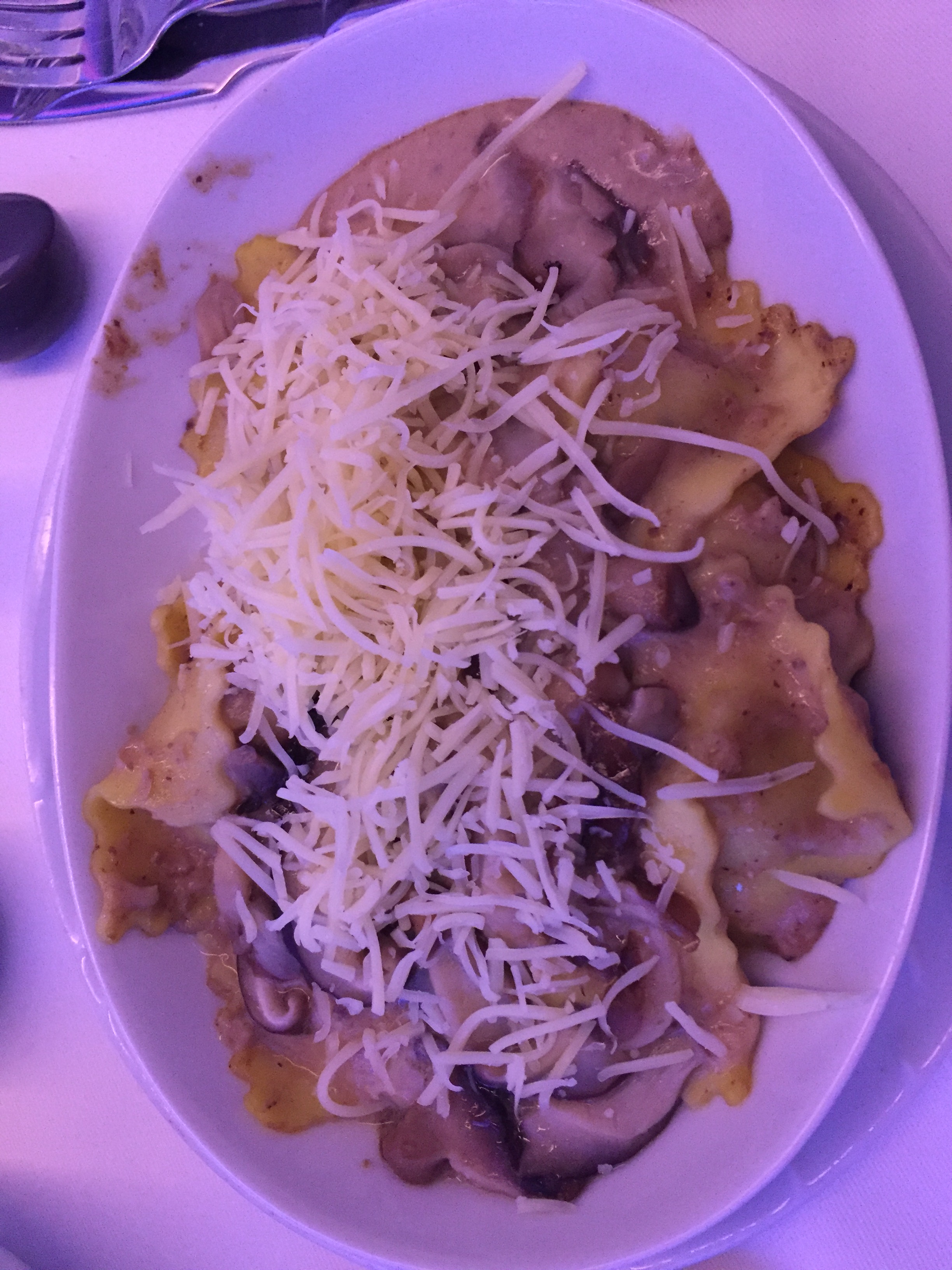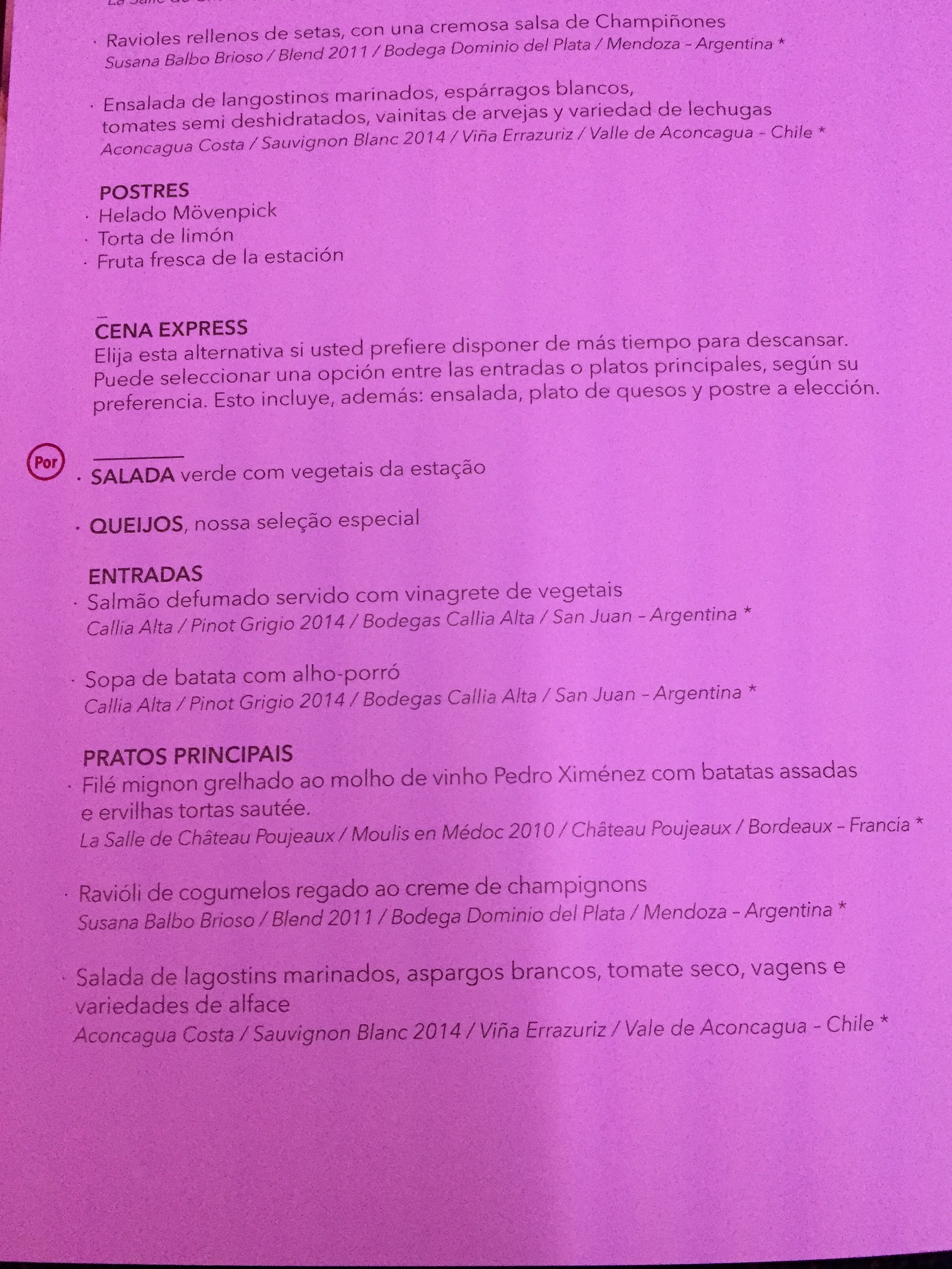 – o jantar começou a ser servido às 01:30h e 03 opções estavam disponíveis: filé ao molho de vinho e batatas assadas com ervilhas / ravioli de cogumelos com molho de champignon / salada de lagostins marinados com aspargos; fui na opção “segura” da massa: estava uma delícia, o molho estava divino; de entrada, uma sopa de batata com alho poró: nota 10!