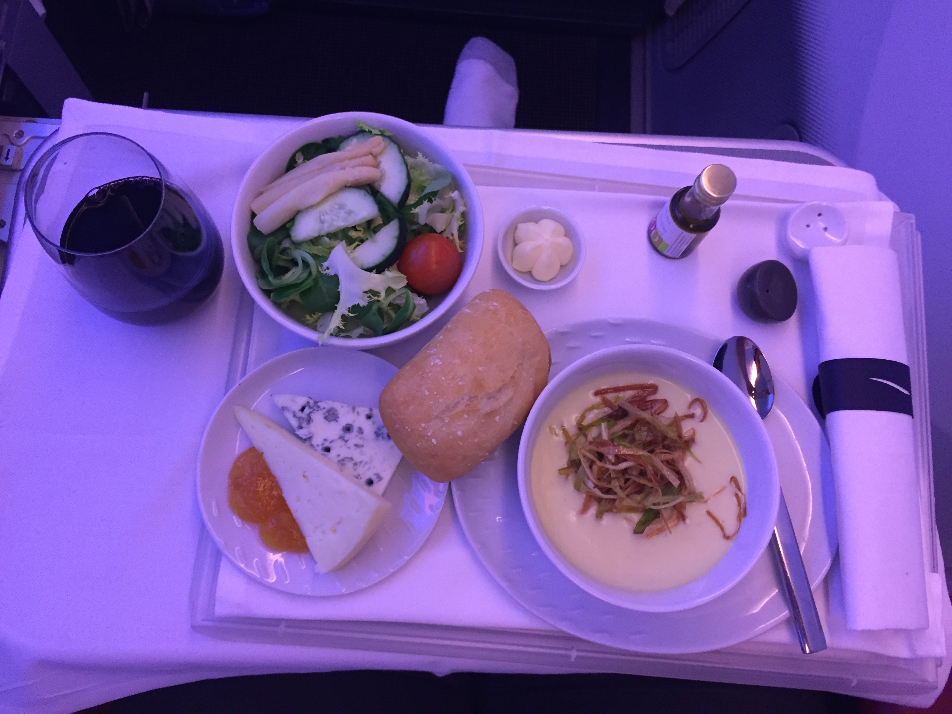 – antes de 00:40h, a tripulação começou a preparar o serviço de bordo; distribuíram cobertores e travesseiros (de tamanho bom, maior que o da TAM), junto com o cardápio e a carta de vinhos