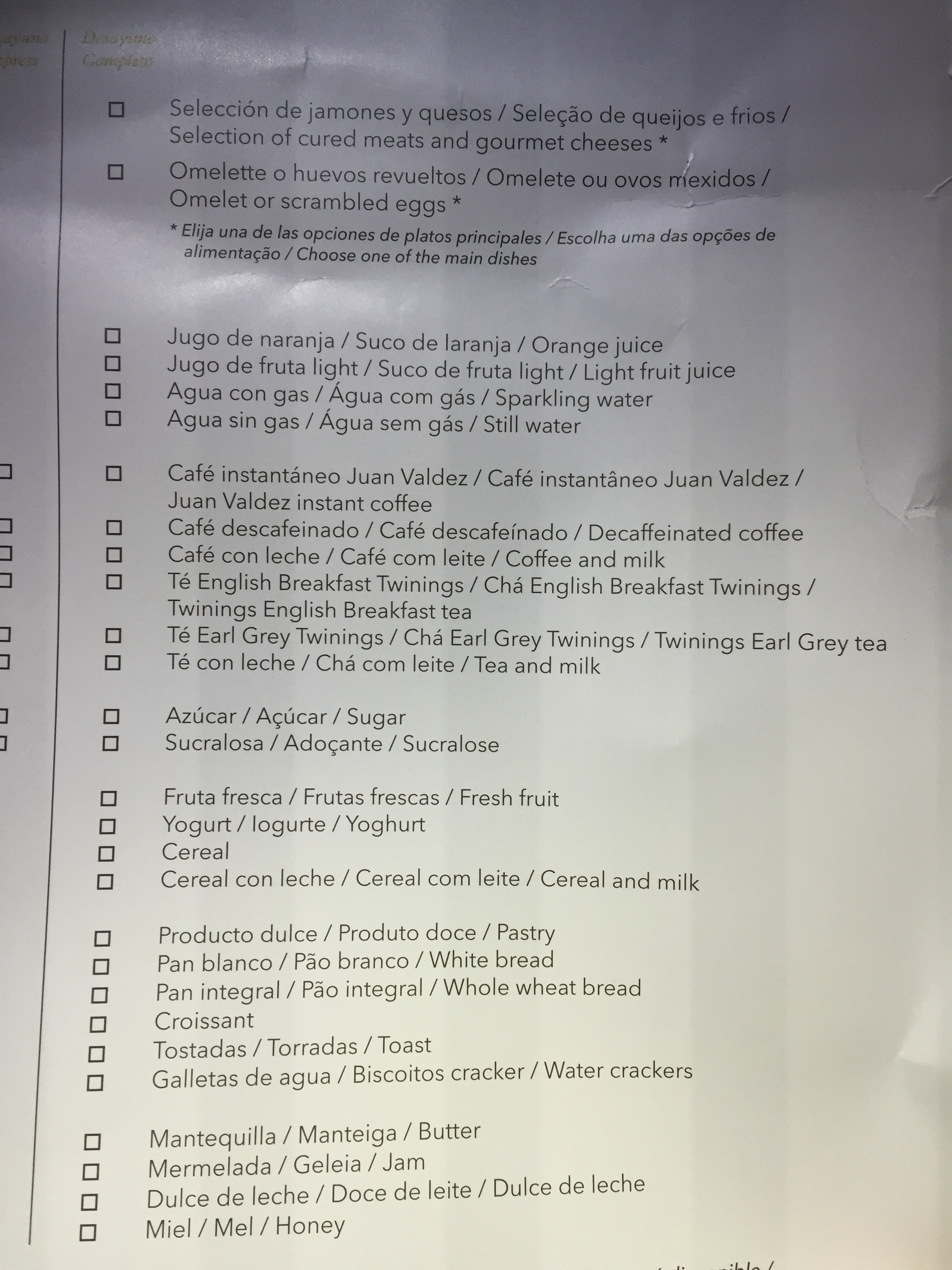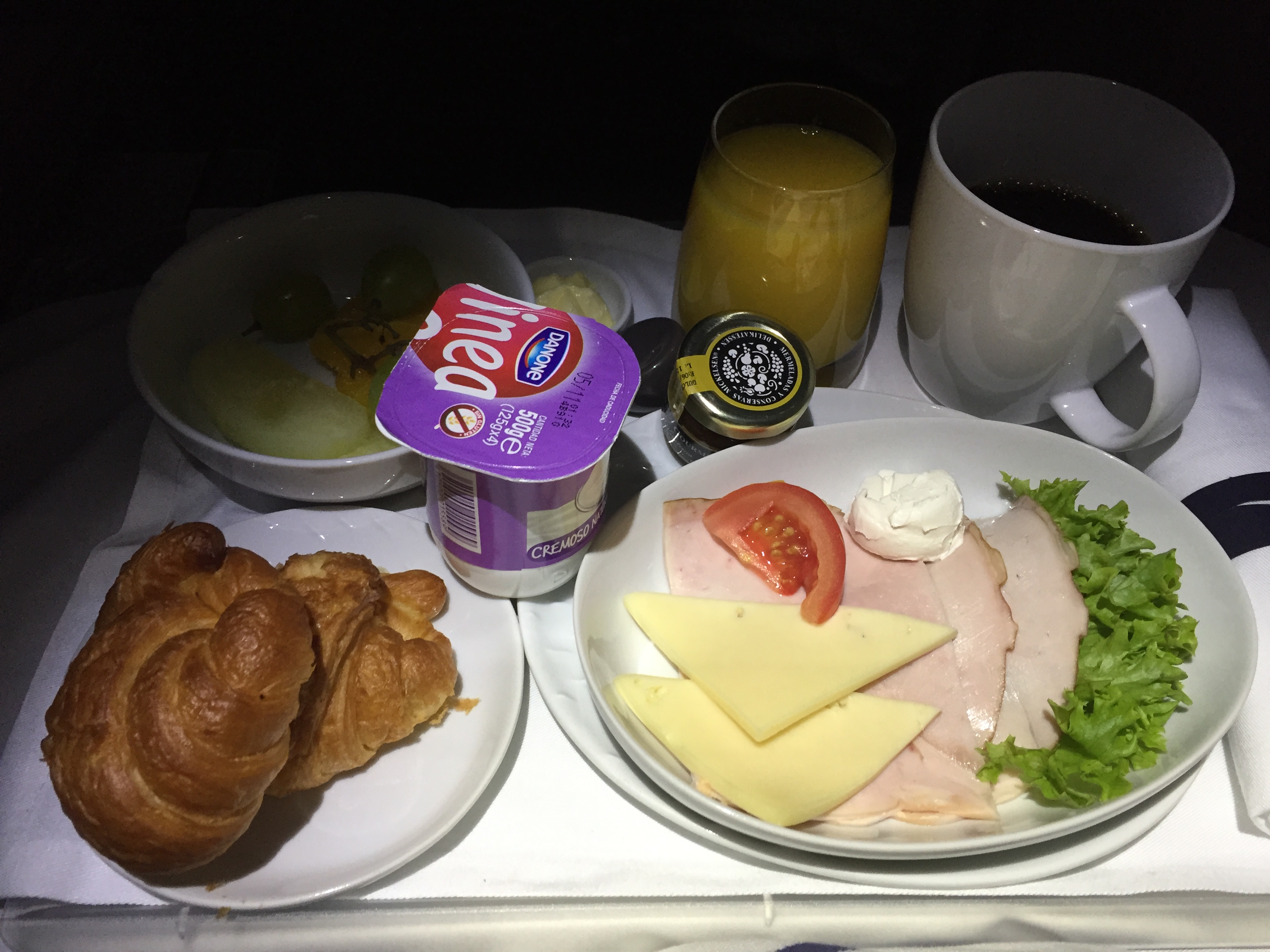 – por volta de 11:15h, o café da manhã começou a ser servido: a LAN usa um formulário com várias opções a serem marcadas pelos passageiros; escolhi queijos, croissant, frutas, iogurte, suco de laranja e café Juan Valdez, uma ótima refeição, tudo muito fresco