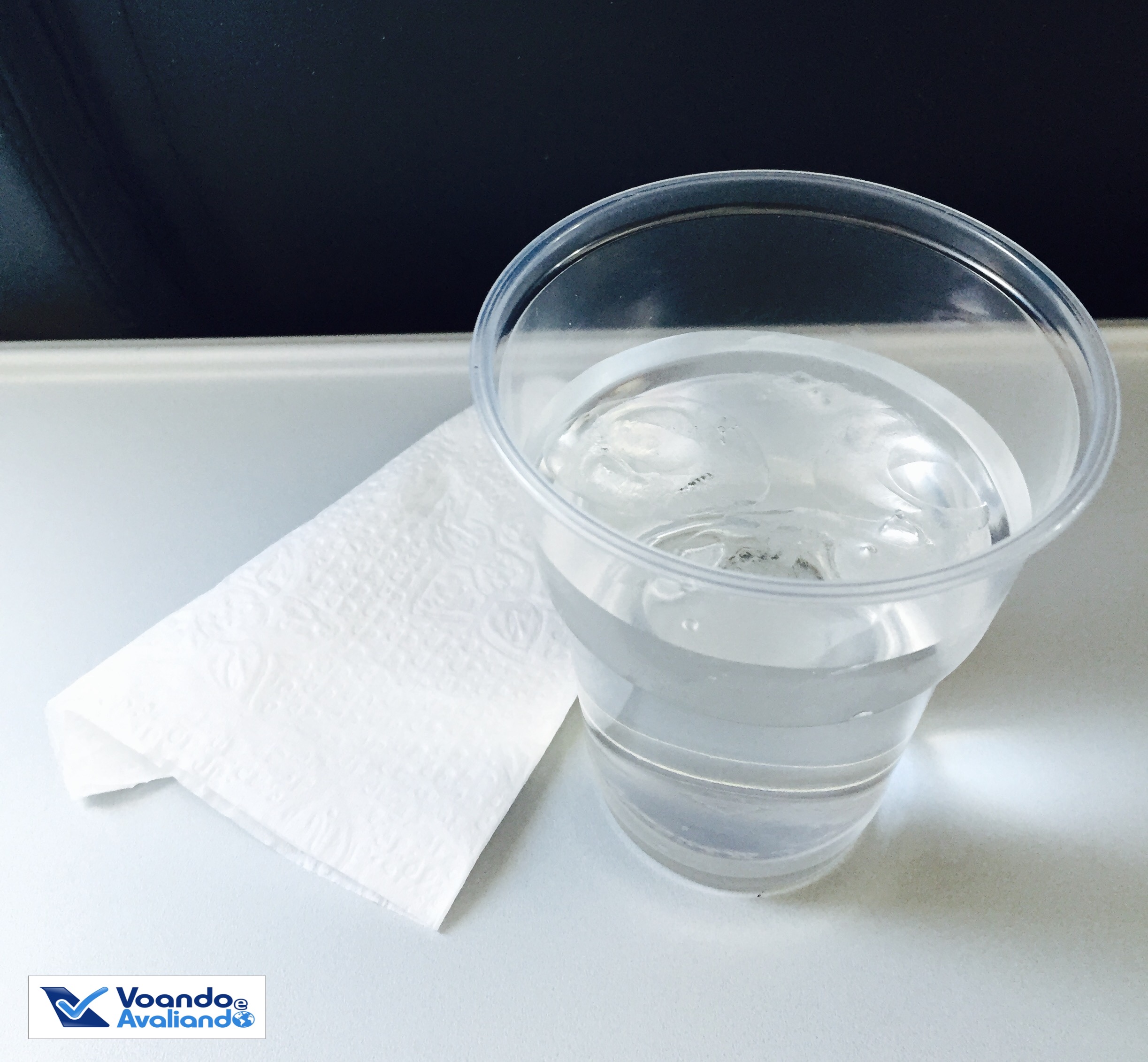 – o serviço de bordo é extremamente simples: se resume a um copo de água (o guardanapo e o copo de plástico não trazem a logomarca da Passaredo); ainda bem que fiz aquele lanche em Guarulhos…