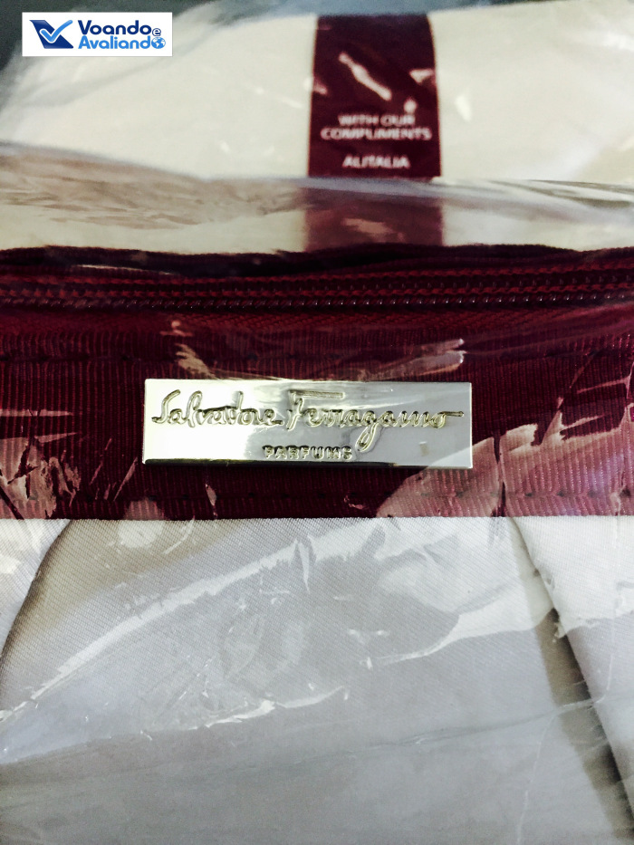 – as necessaires Salvatore Ferragamo enormes e lindas, uma para os meninos e outra para as meninas, foram distribuídas, junto com espumante, água ou suco de laranja: escolhi a opção borbulhante, sempre a melhor alternativa