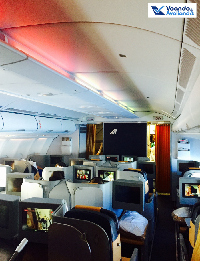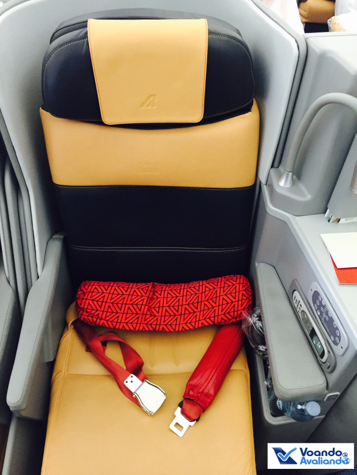 – os assentos da Alitalia na Executiva me lembram muito o A330 da Iberia (avaliação de fevreiro/15): parecem uns casulos individuais; os assentos são de couro caramelo e preto; os botões de comando e o controle remoto ficam bem localizados, evitando toques involuntários; há também tomada e porta USB para carregar aparelhos eletrônicos