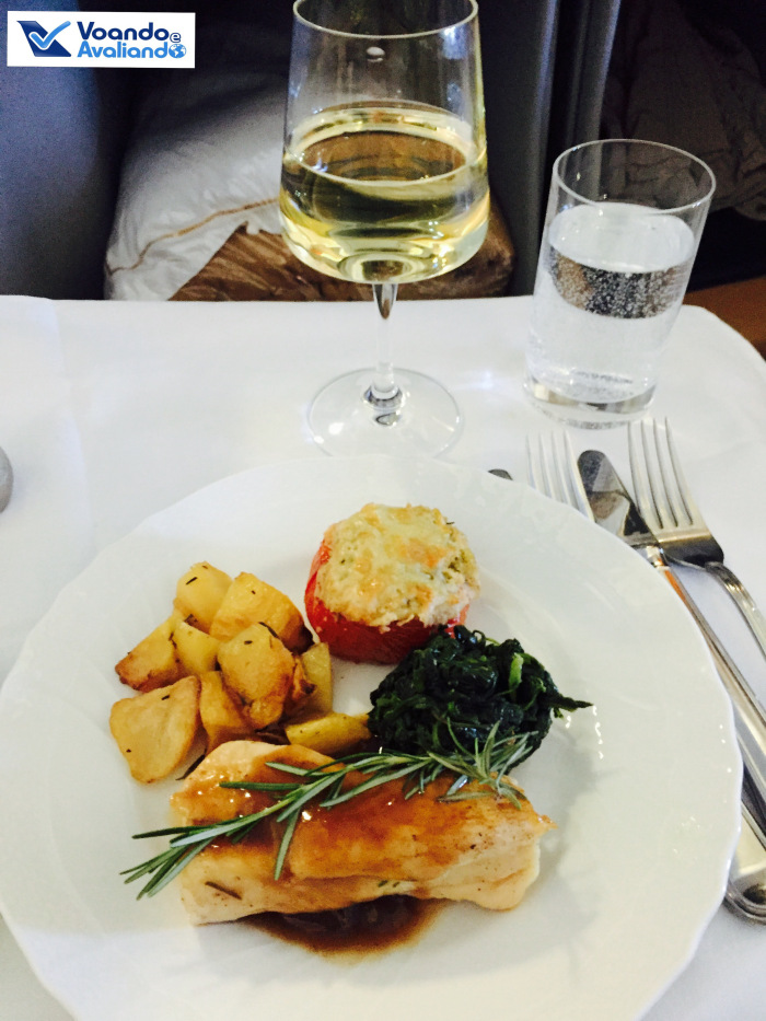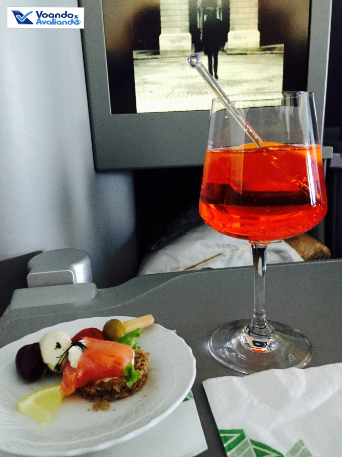 – eram por volta de 18:05h quando o serviço de bordo foi iniciado, uma autêntica ceia italiana: aperitivo (tradicional bebida italiana Spritz com canapé de salmão), entrada (salada de camarão com cenoura e batata), 1º prato (penne com molho de tomate), 2º prato (rolo de frango recheado com presunto San Daniele) e sobremesa (frutas); tudo estava excepcional; para beber, escolhi o vinho branco, que foi servido na temperatura ideal e era ótimo; faz todo sentido que a Alitalia tenha ganho o prêmio de Melhor Culinária pela revista americana Global Traveler; para terminar, um “digestivo” típico italiano: Limoncelllo
