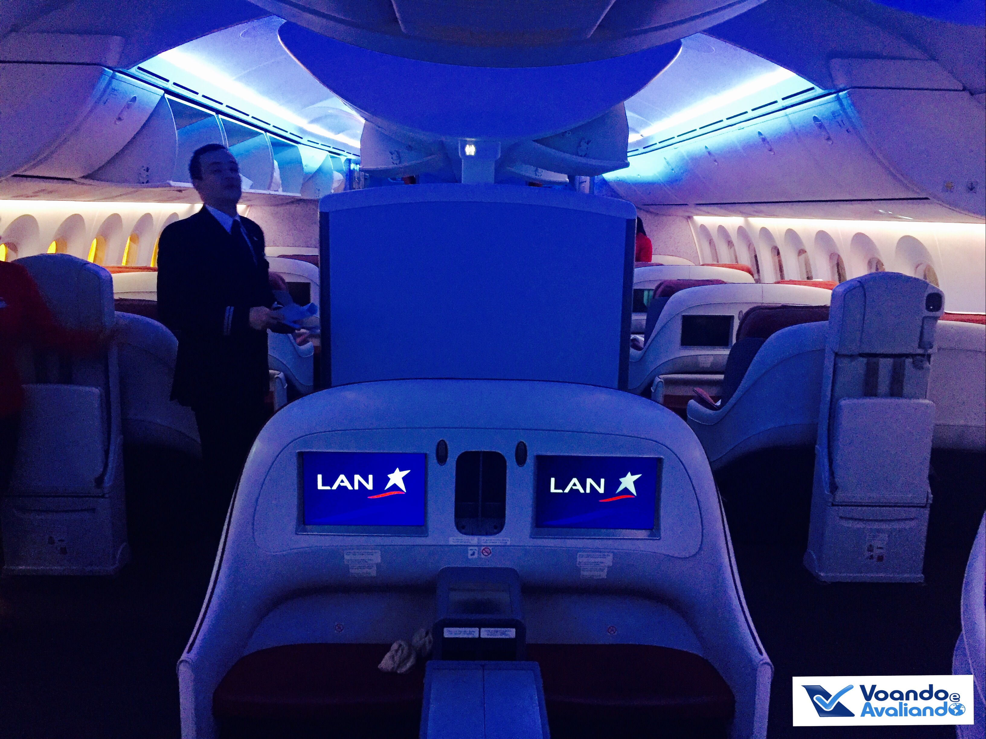 – o B787 de prefixo CC-BBE, entregue novo à LAN em outubro de 2013, tem na classe Executiva a configuração 2x2x2, são 05 fileiras, total de 30 lugares (são mais 217 assentos na classe Econômica); esta estrutura que a LAN (no B787 e B767) e TAM (no B767 e B777) usam na Business não é das mais “modernas”, pois os passageiros dos assentos das janelas não têm acesso direto ao corredor; neste trecho, teríamos casa cheia, todos os lugares estavam ocupados (na Classe Econômica, haviam poucos lugares vazios)