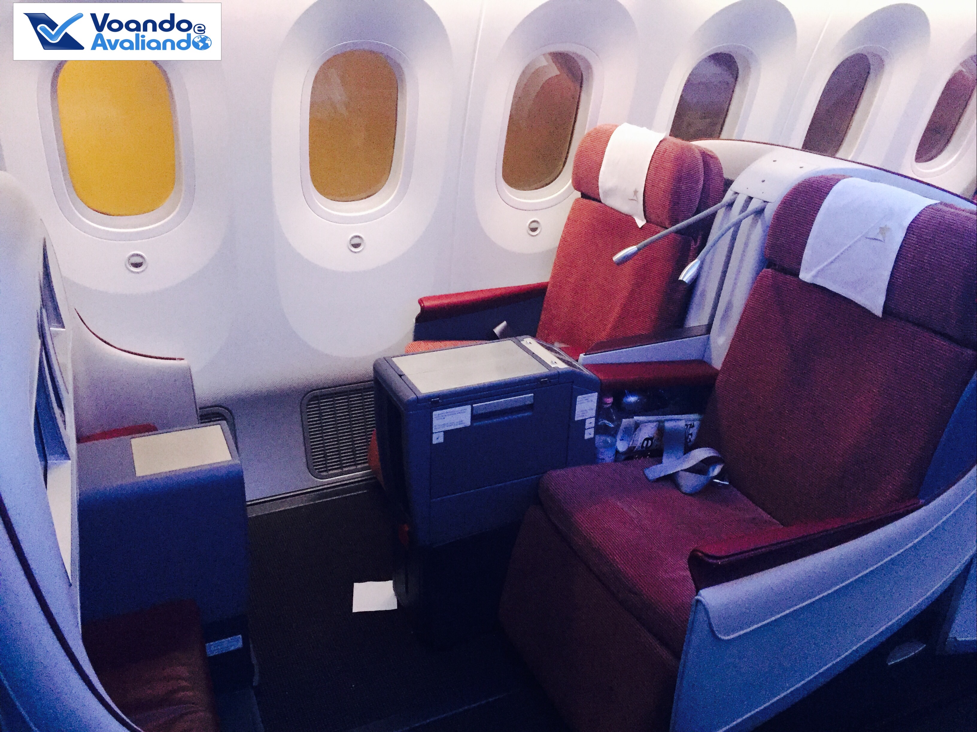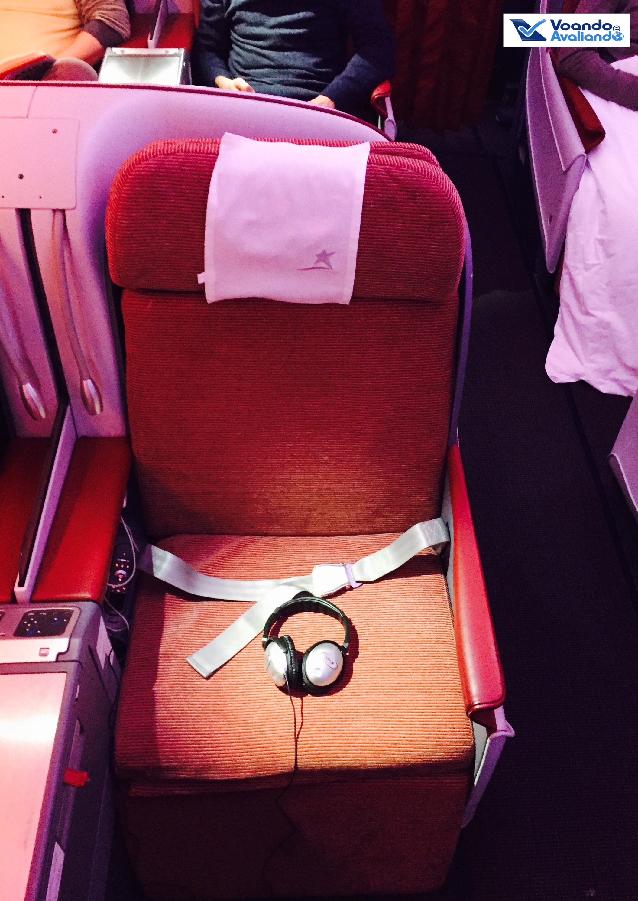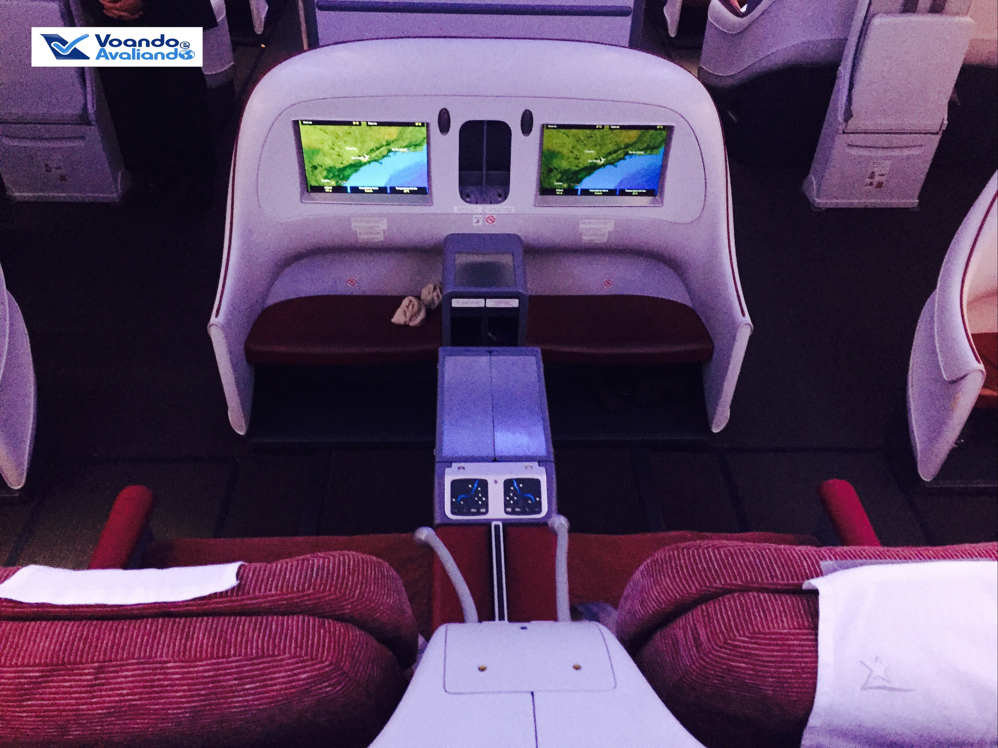 – o meu assento era o 4J: um corredor no lado direito da aeronave, na 2ª sessão da Classe Executiva; os assentos são confortáveis, em tecido vermelho (a LAN não usa o couro nos revestimentos de seus bancos)