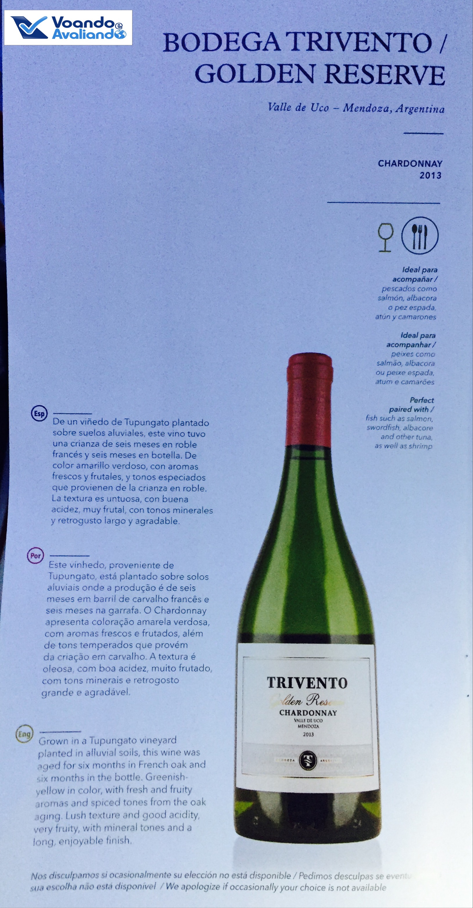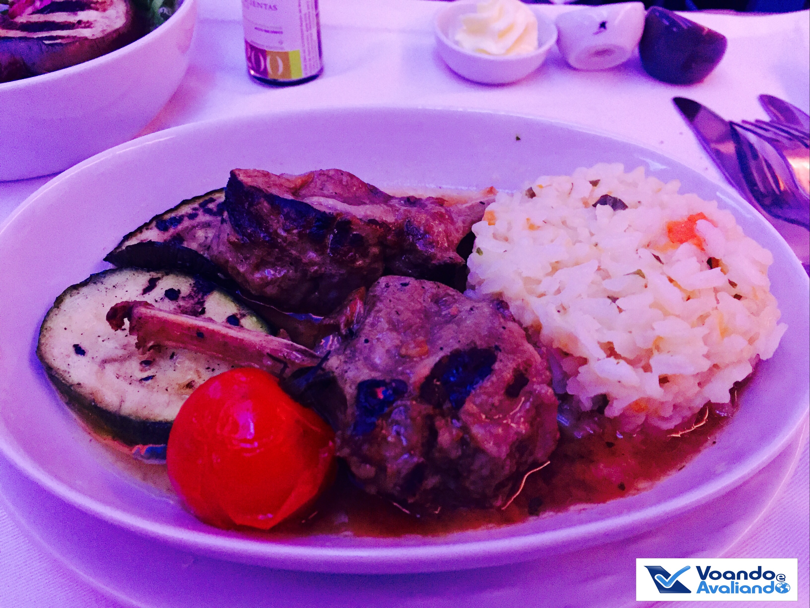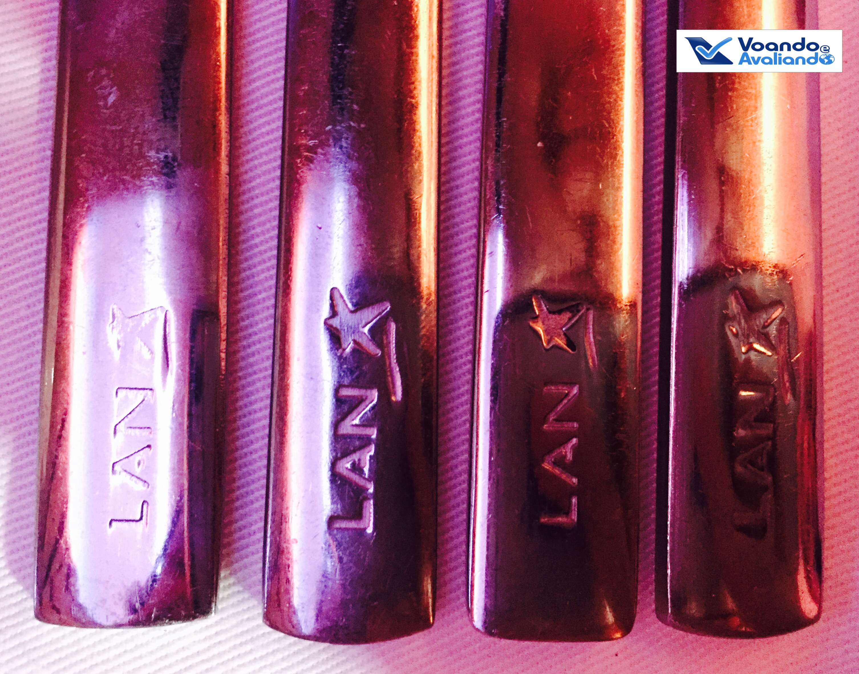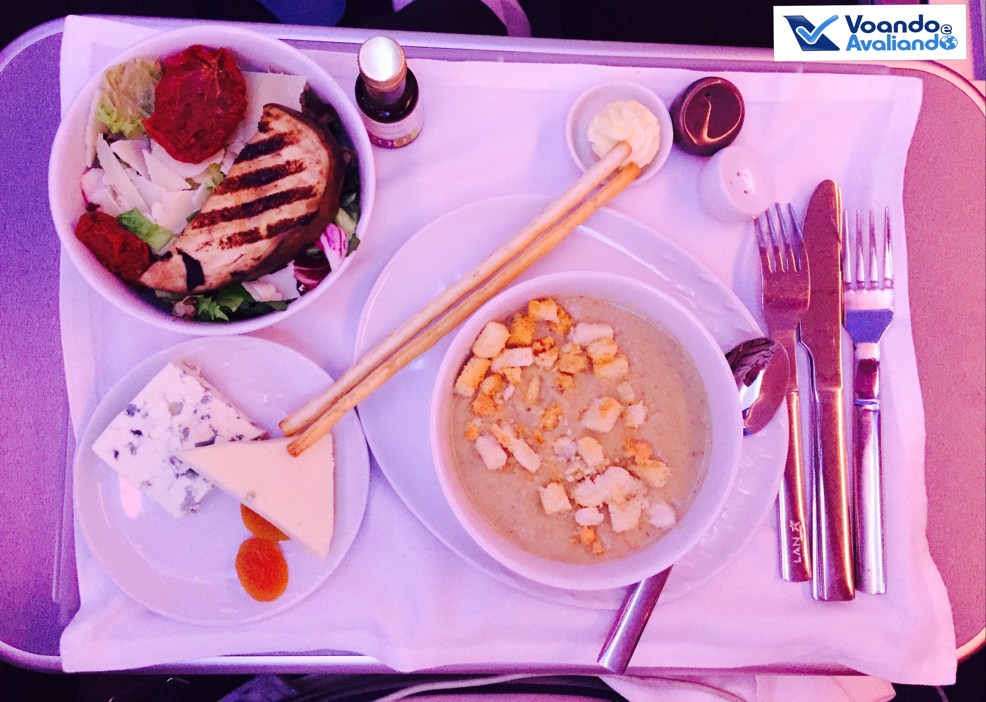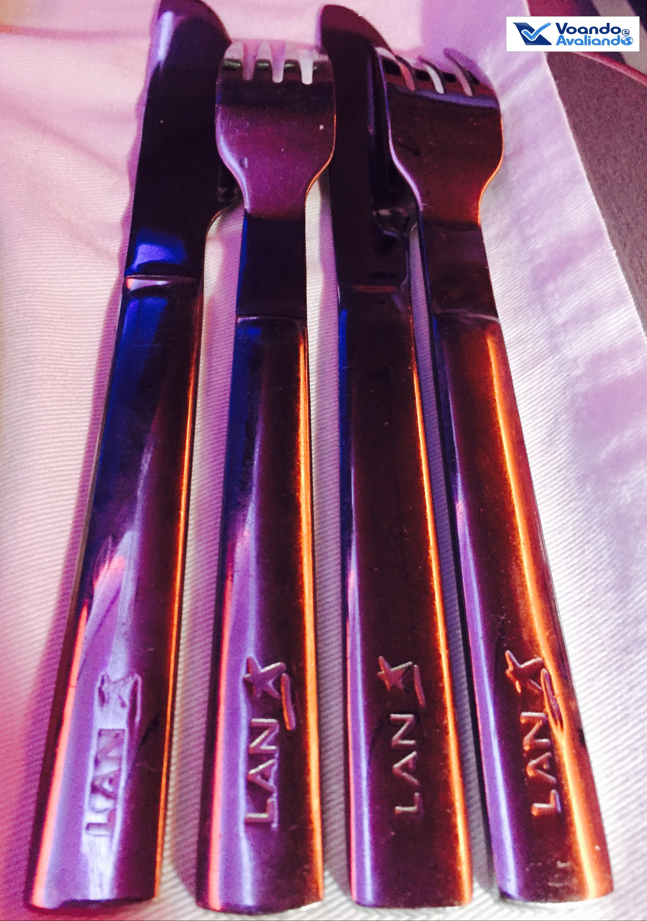 – a refeição estava boa, mas nada de excepcional (nível bem abaixo da minha outra experiência com a LAN Chile em outubro de 2015, voando de Madrid para Santiago); a torta de sobremesa (ricota com chocalate branco) estava muito gostosa; o vinho branco foi servido 02 vezes, mas a taça foi retirada sem me consultar se eu estava satisfeito; os talheres são personalizados com a logomarca da empresa