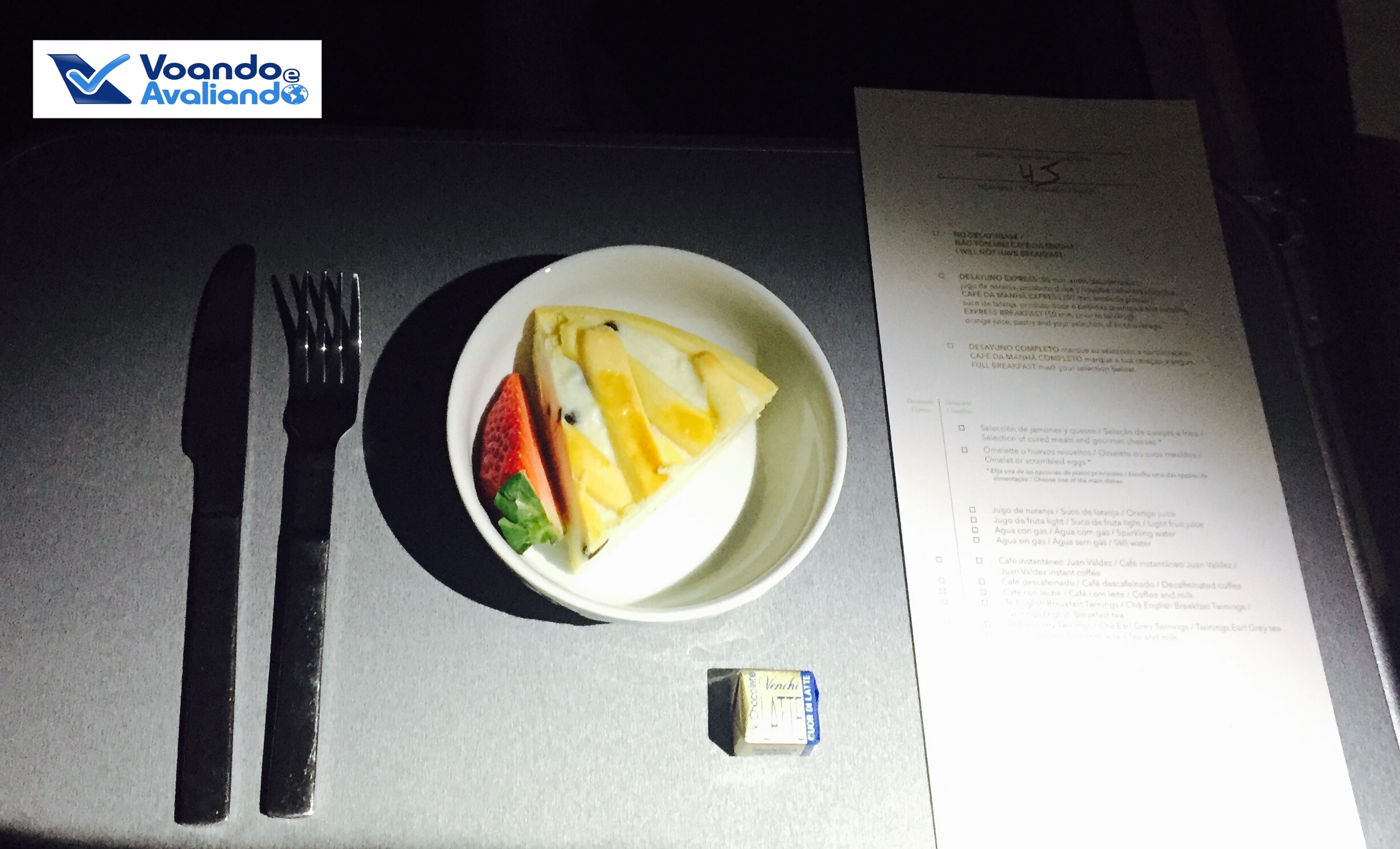 – logo em seguida foi entregue um formulário para que eu escolhesse desde logo as opções para o café da manhã; esta ideia que a LAN e TAM usam é interessante, pois permite que os passageiros recebam aquilo que é de sua preferência, evitando desperdícios, além de aumentar a efiência do serviço dos comissários