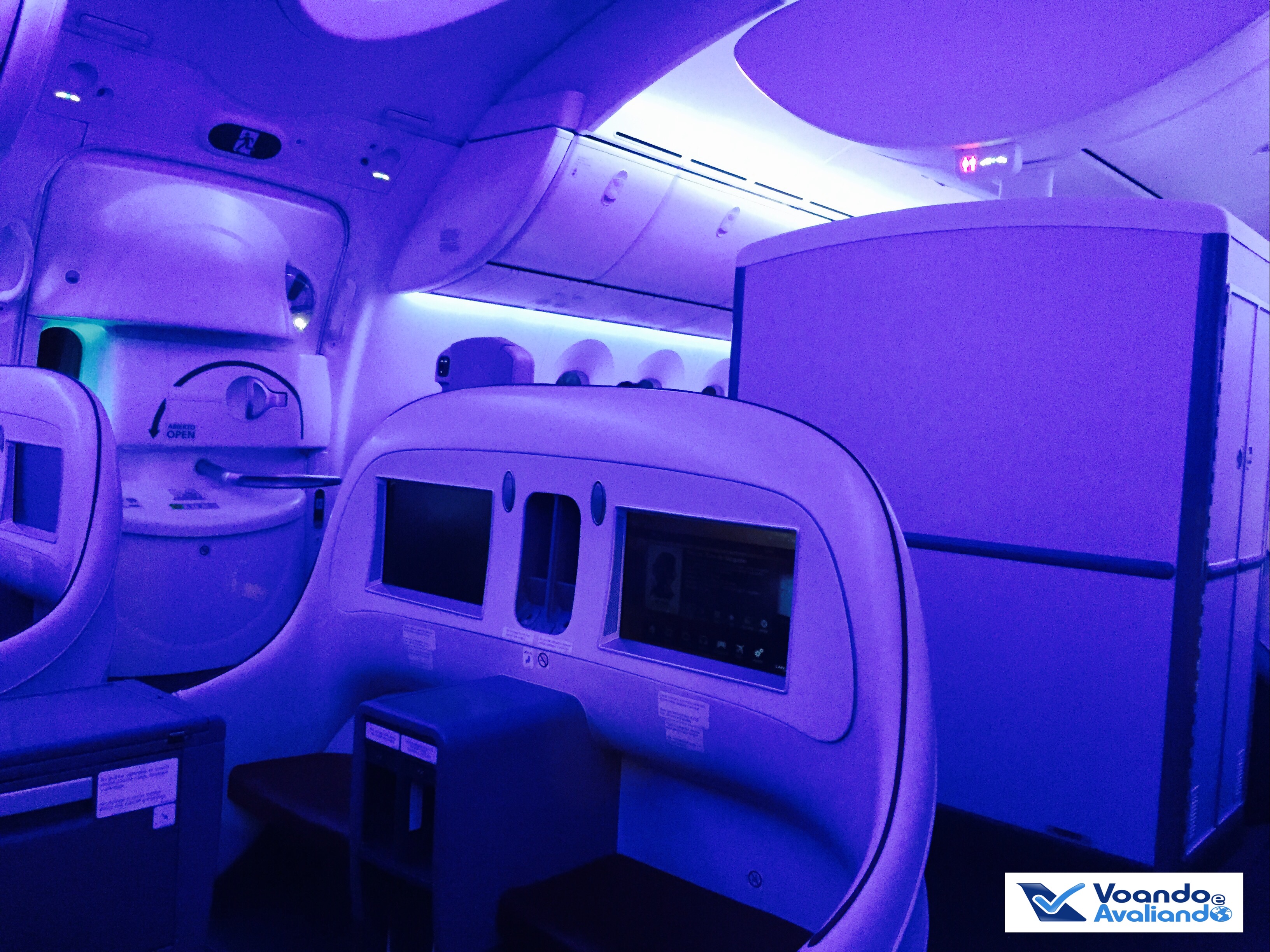 – no caminho de volta ao meu assento, aproveitei para percorrer a cabine e tirar algumas fotos das poltronas e do corredor da Classe Executiva do Boeing da LAN