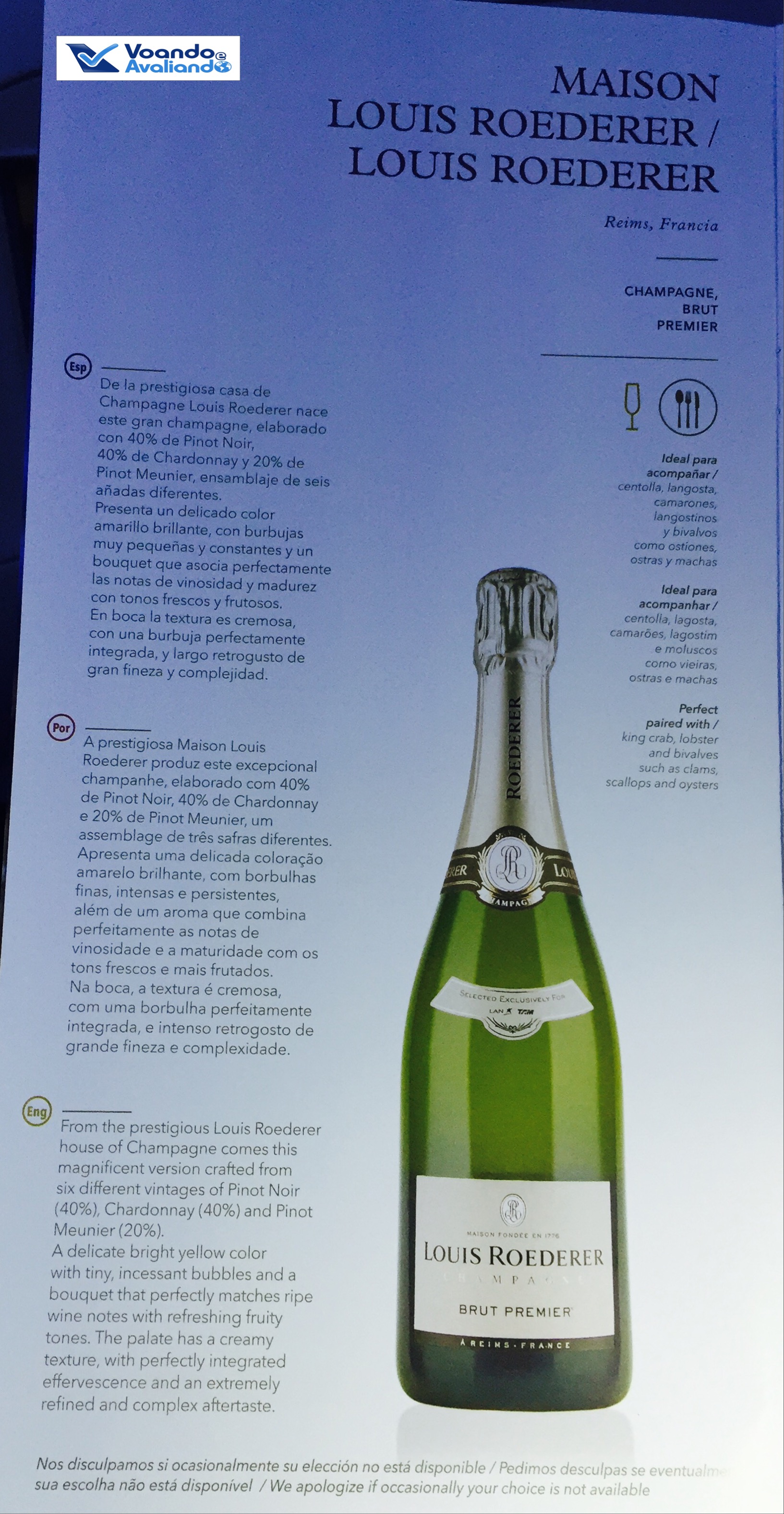 – na porta do avião, um casal de comissários recepcionva os passageiros, indicando o melhor corredor de acesso, de acordo com o assento deles; quando ainda arrumava as minhas bagagens de mão, o tradicional (e irrecusável) champagne com snacks foi oferecido