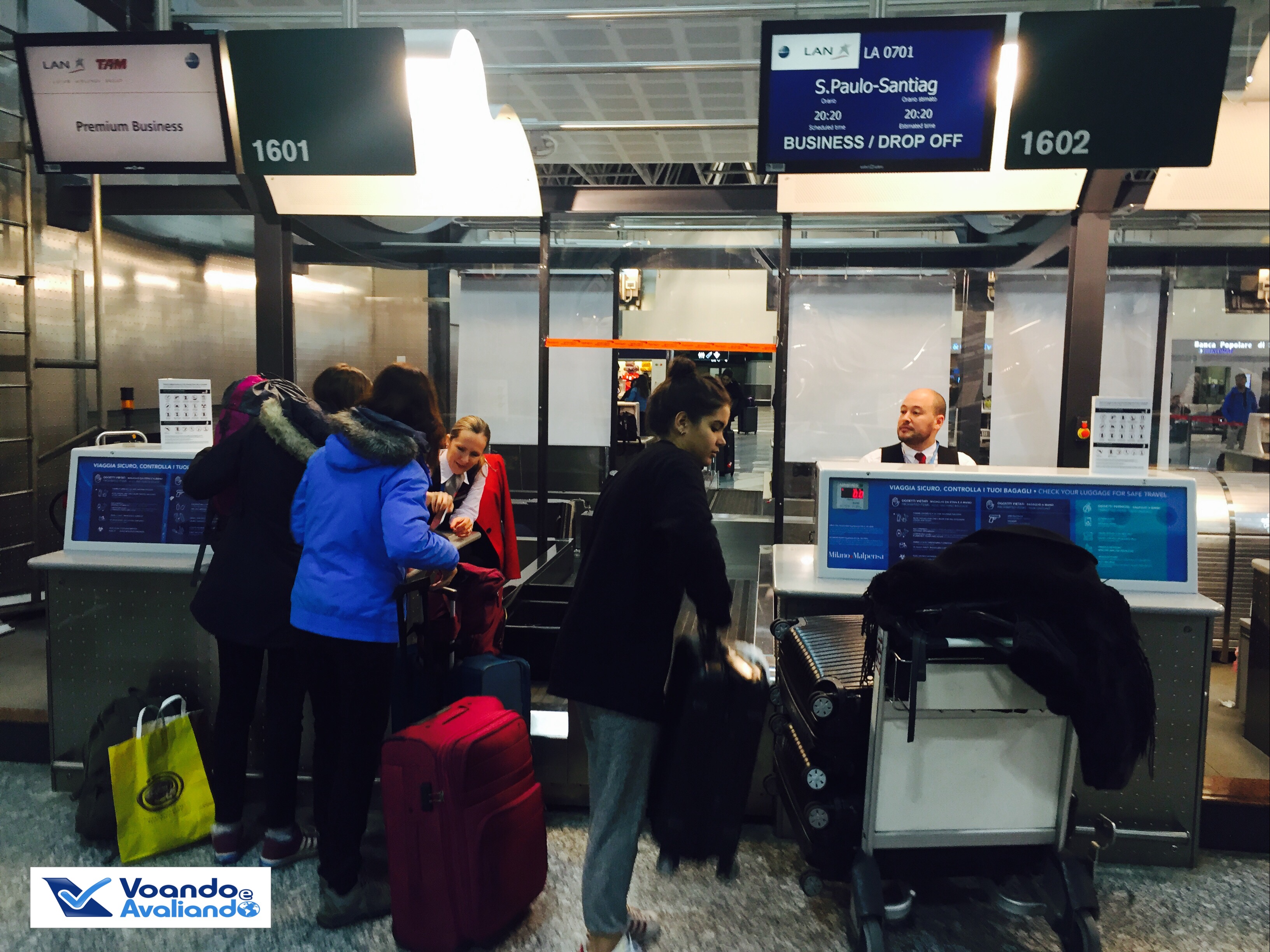 – 02 guichês estavam dedicados para as prioridades e a fila estava pequena; fomos atendidos em menos de 01 minuto; o funcionário Nicolas fez o nosso processo de check-in e foi atencioso e educado; fez questão de explicar com calma onde estava localizada a Sala VIP utilizada pela LAN Chile em MXP; perguntei do meu pedido de upgrade: haviam 03 lugares na Classe Executiva e eu era o 2º na fila, ou seja, boas perspectivas; recebemos também um cartão de “Fast Track” para pegarmos uma fila especial no controle de segurança do aeroporto; a Gerente de Aeroporto (Luciana) supervionava o trabalho de todos os funcionários da LAN