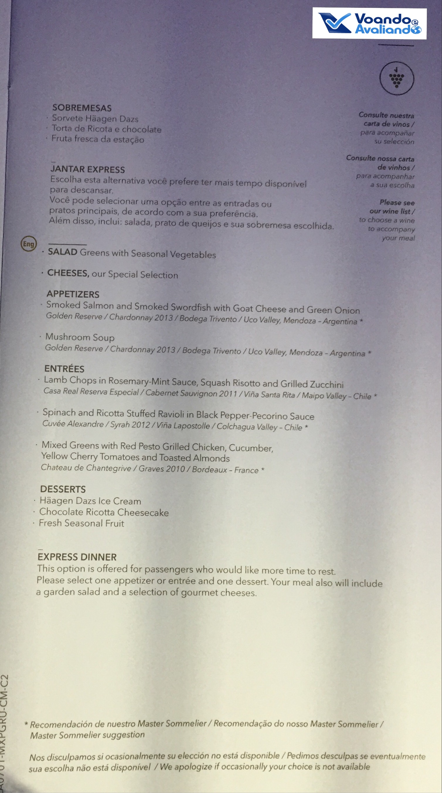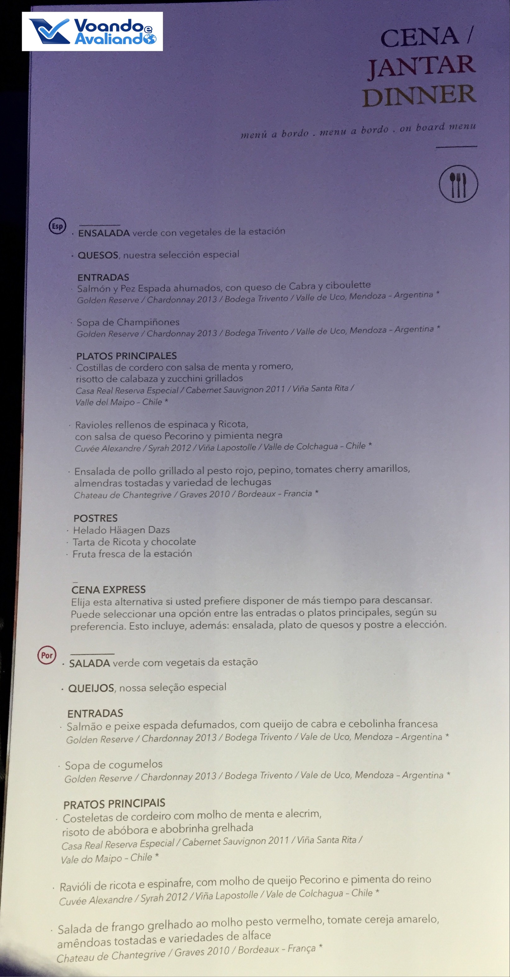 – eram 21:35h quando Alejandra passou anotando os pedidos para o jantar; não dei muta sorte neste voo, as 03 opções de prato principal não me agradaram; as minhas escolhas foram: sopa de cogumelos com salada de folhas e queijos + cordeiro com risoto de abóbora; o jantar foi servido somente às 22:35h: a LAN utiliza uma bandeja onde os pratos e talheres são servidos já montados; as opções de champagne e vinho eram ótimas: França, Chile e Argentina; escolhi o Chardonnay vindo de Mendoza/ARG