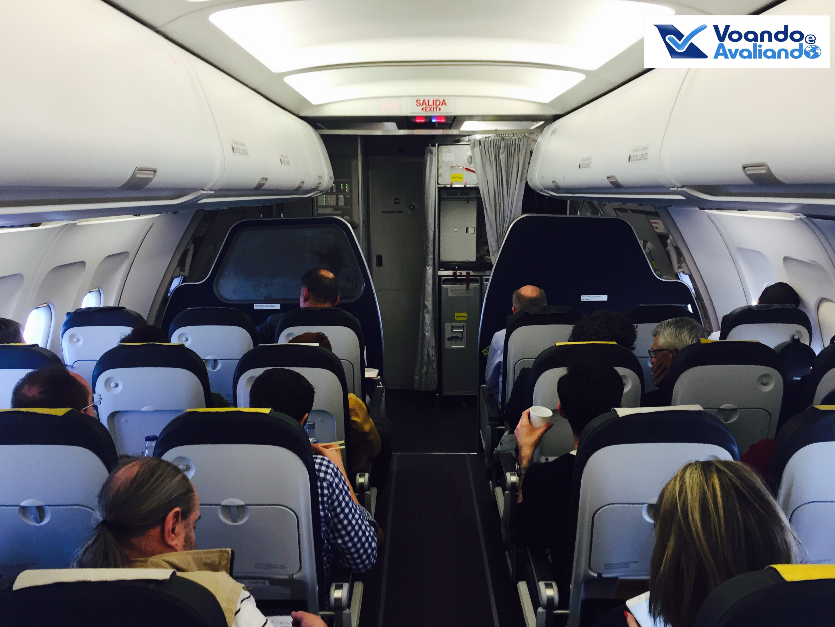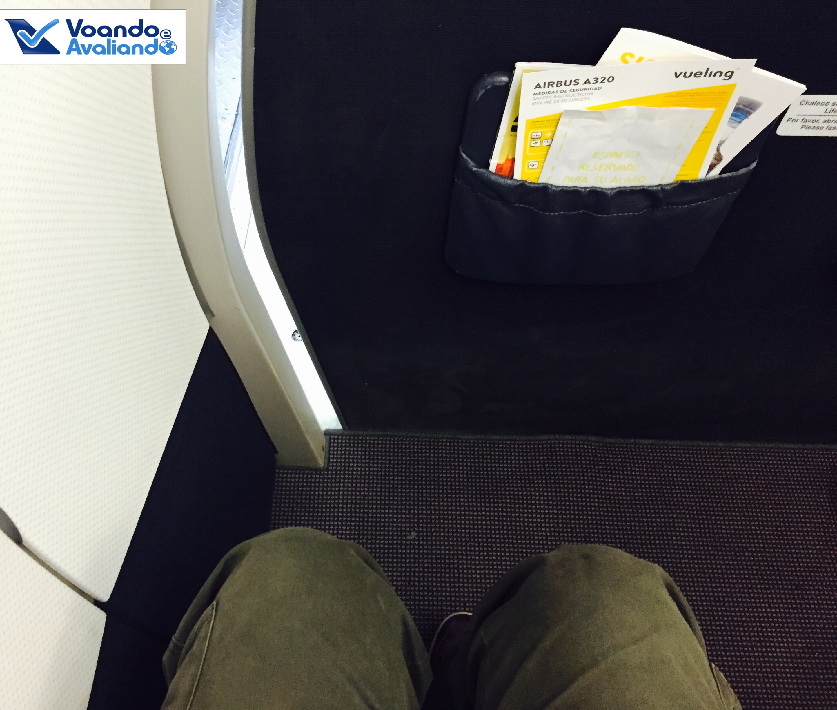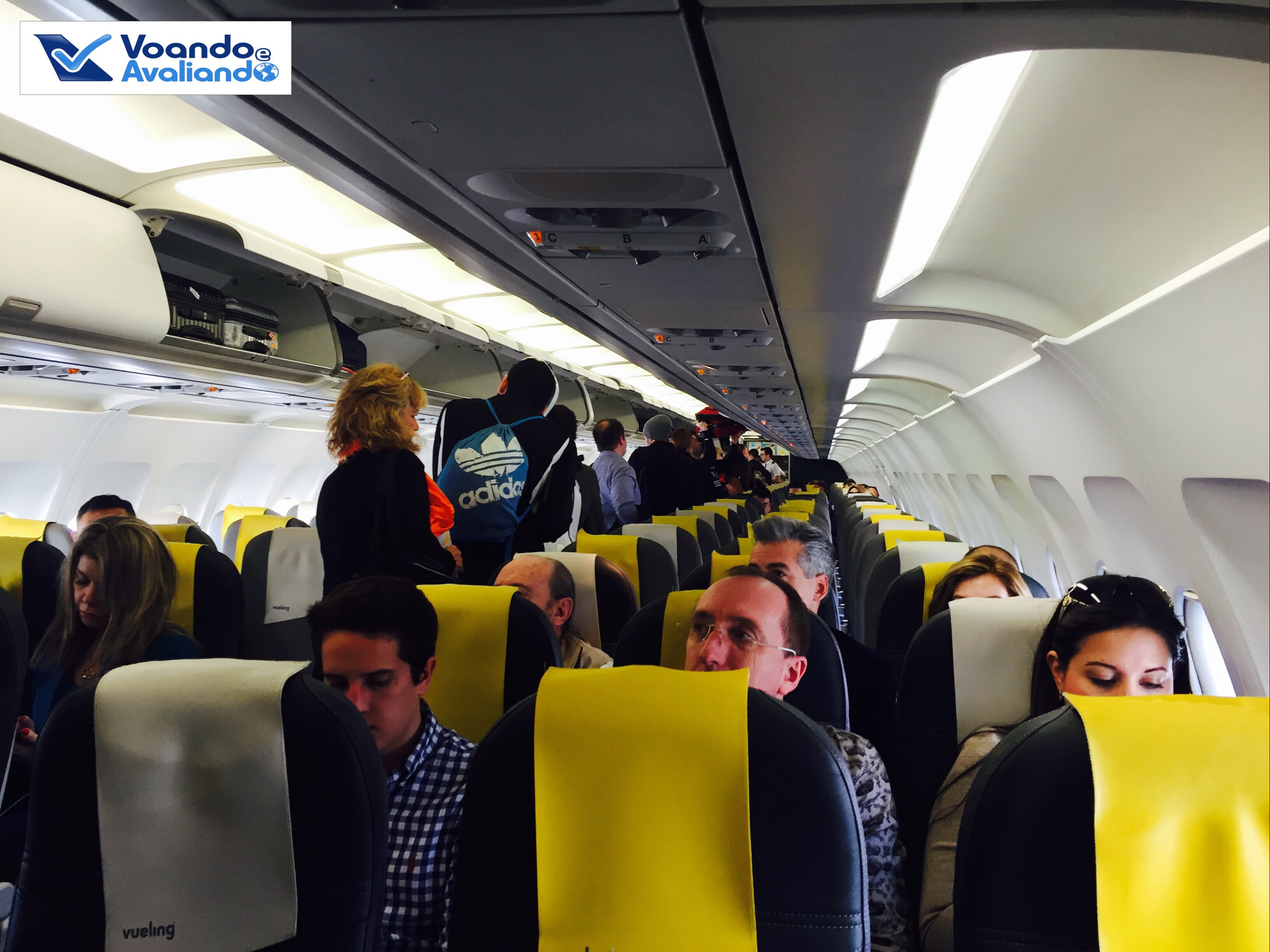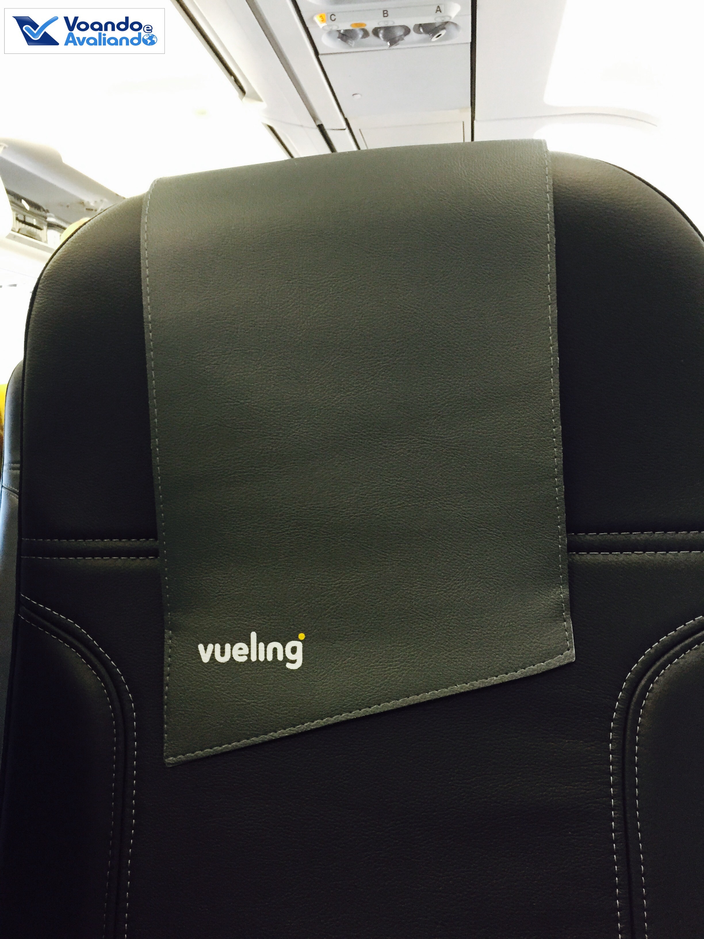 – durante o trajeto até o avião pelo finger, foi possível reparar que o Airbus A320 que me levaria até Barcelona não tinha o pintura completa da Vueling; a configuração do avião de prefixo EC-LQL (fabricado em 2002, fez parte da frota da extinta Spanair e foi incorporado à Vueling em março de 2012) era o tradicional 3×3 dos aviões de corredor único; os bancos são de couro cinza escuro e os encostos de cabeças são coloridos (branco, cinza e amarelo); na parte de baixo do assento, tinha uma tomada para carregar o celular; apesar da idade da aeronave, a cabine estava muito bem conservada, indicando que tinha passado por modernização