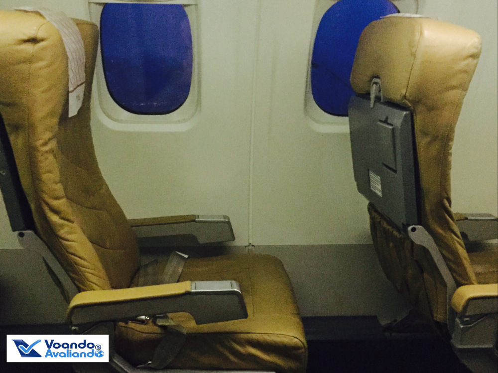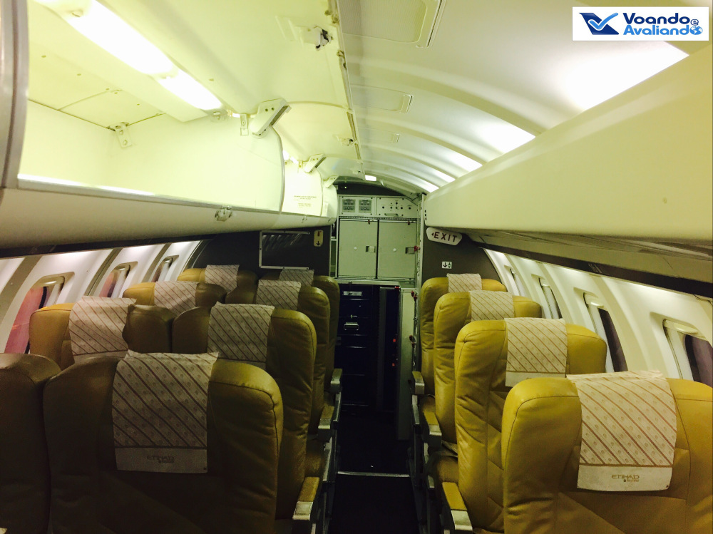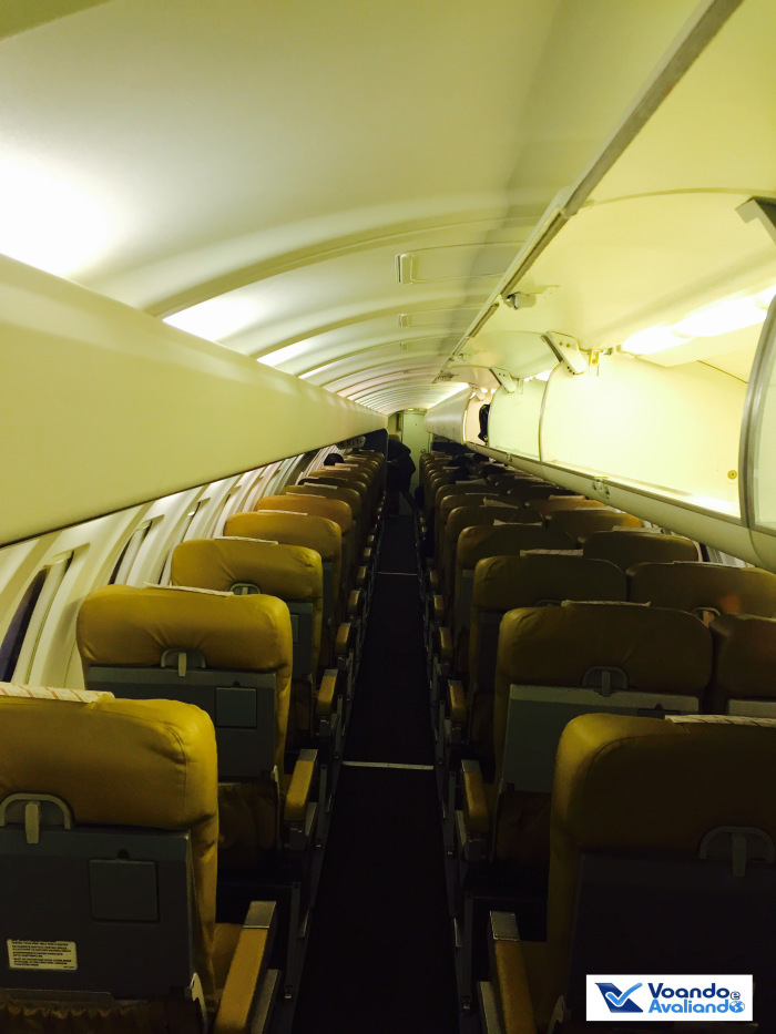 – não é necessária a ajuda de uma escada do aeroporto, o avião tem a sua, que é ativada quando ele está estacionado; a configuração é: 01 poltrona do lado esquerdo e 02 do lado direito, ou seja, o corredor único não fica no meio do avião; classe única, todos os 51 assentos são de classe Econômica; são 17 fileiras e como é comum na Europa, a aeronave não tinha a fileira 13; os bancos eram de couro na cor caramelo; o espaço para as pernas era ótimo (seria Selo A da ANAC); há claros sinais de sua idade avançada, principalmente no acabamento da cabine