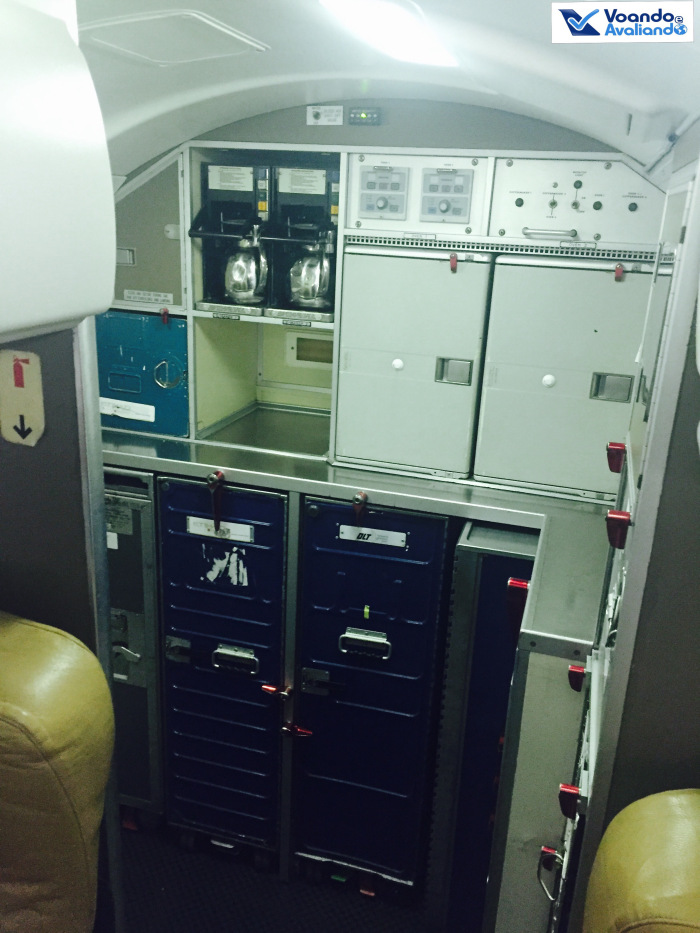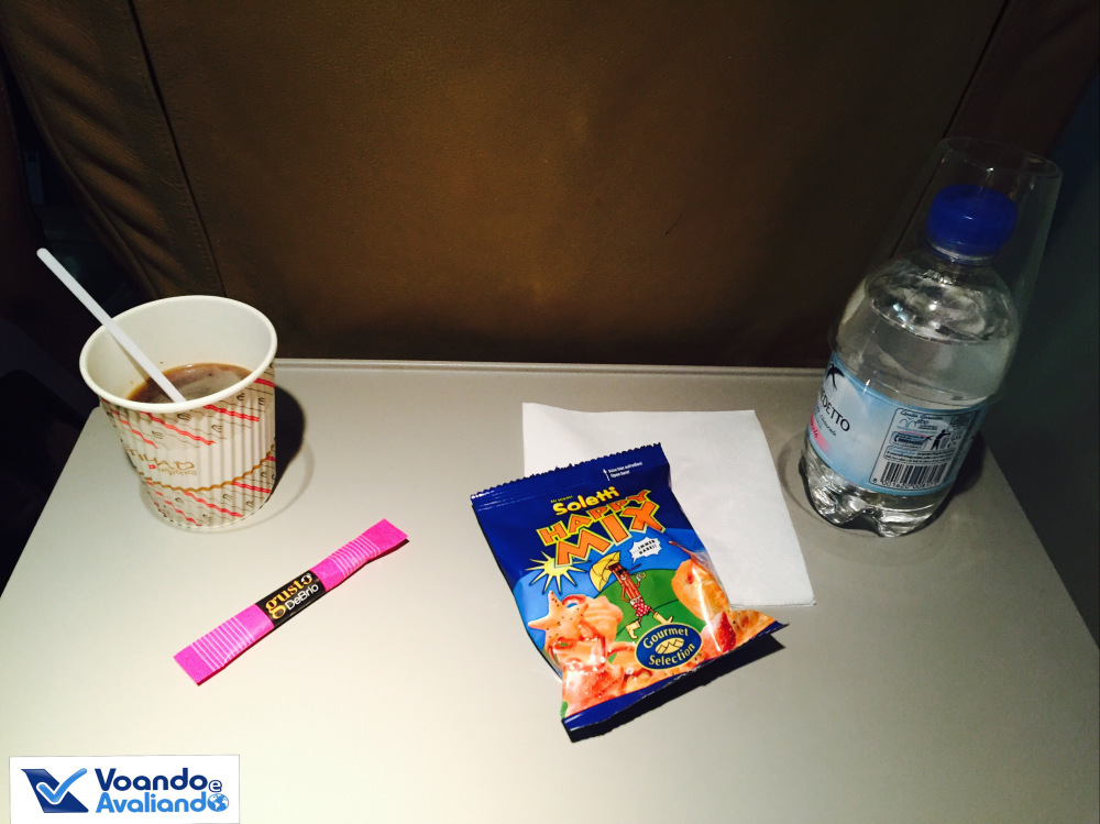 – o serviço de bordo foi oferecido logo depois que os avisos de apertar cinto foram apagados; a Katia serviu rapidamente os poucos passageiros; foi um lanche simples: café (em copo personalizado), uma garrafinha de água e um pacotinho de salgadinhos