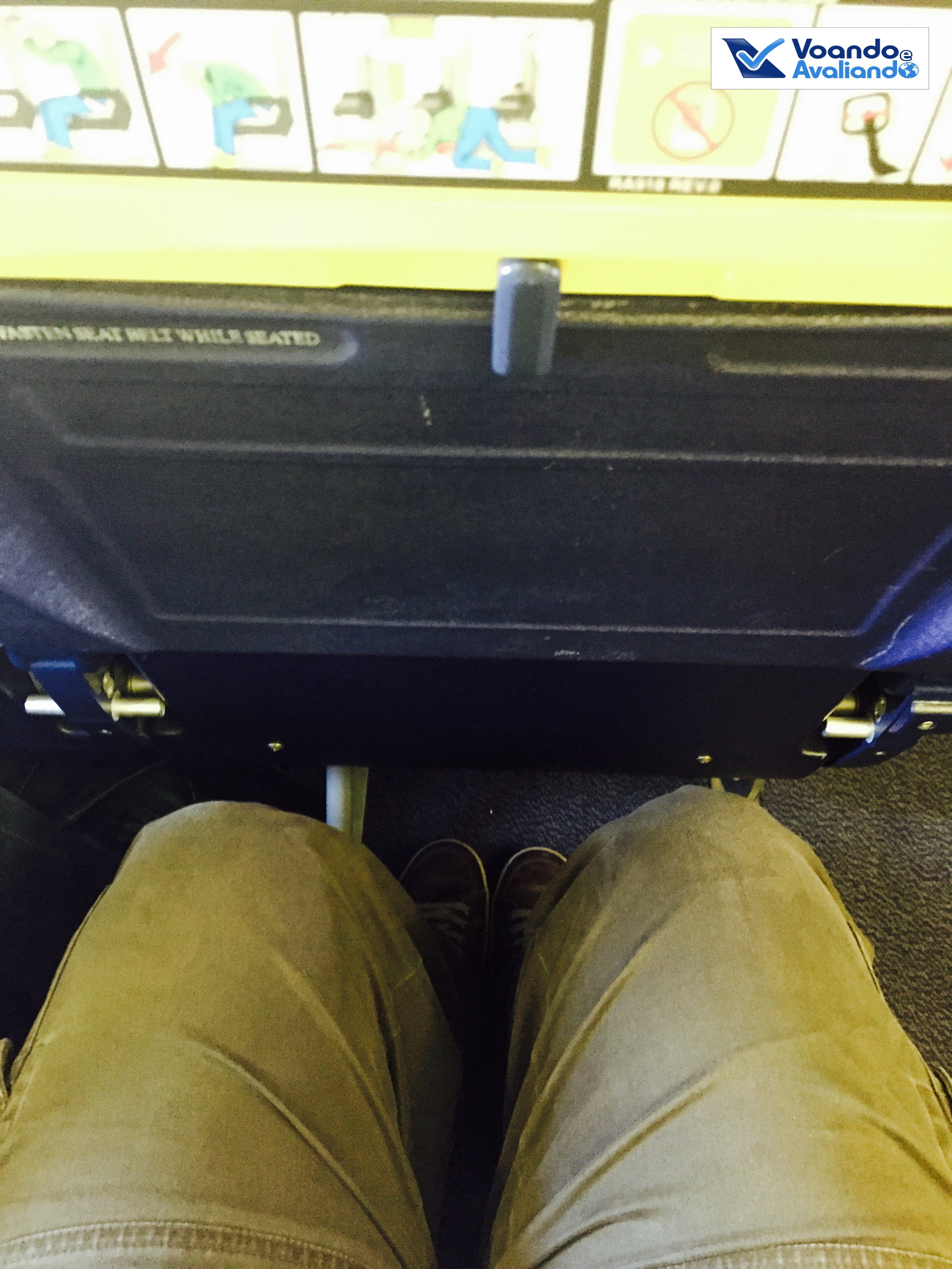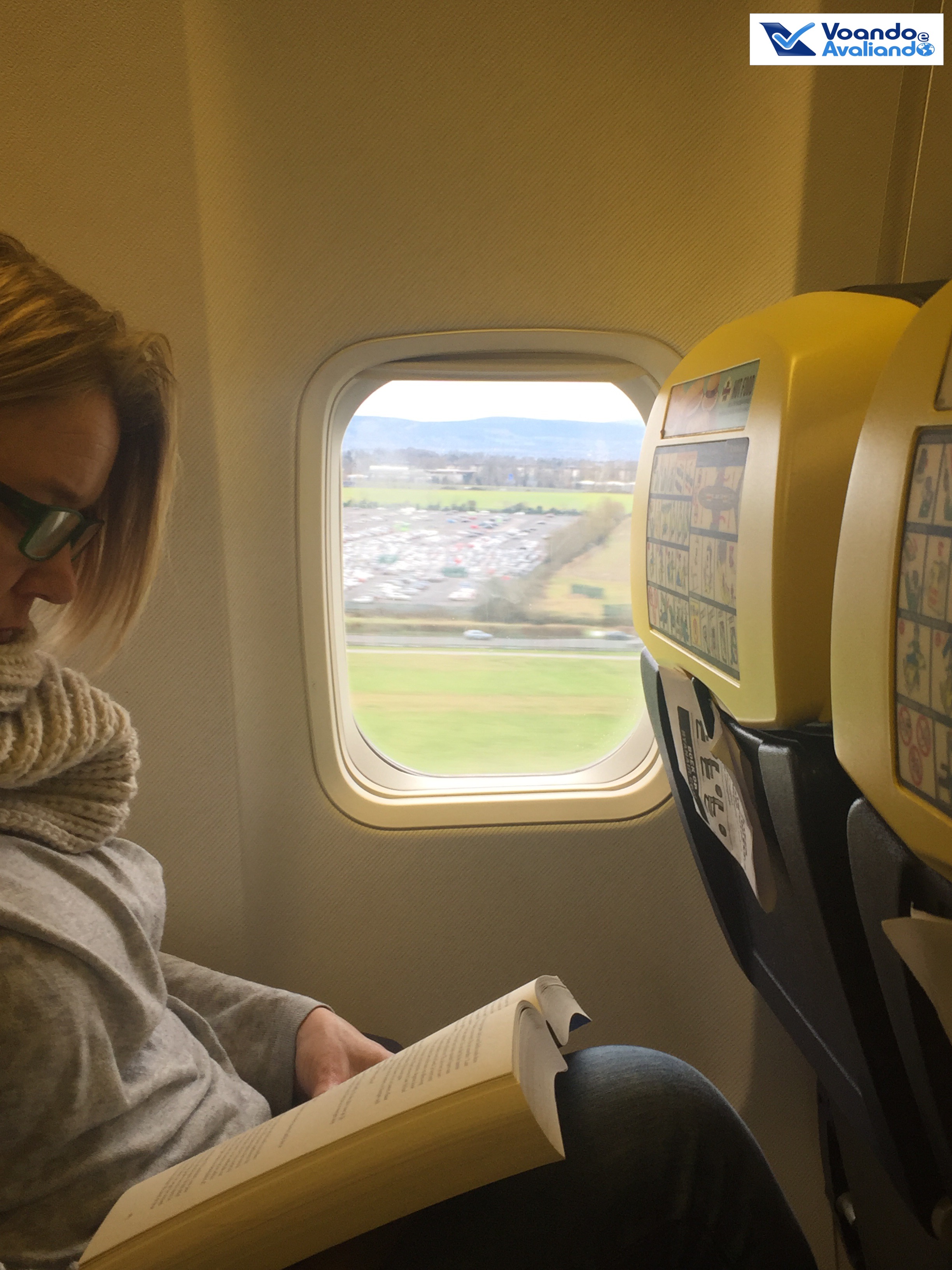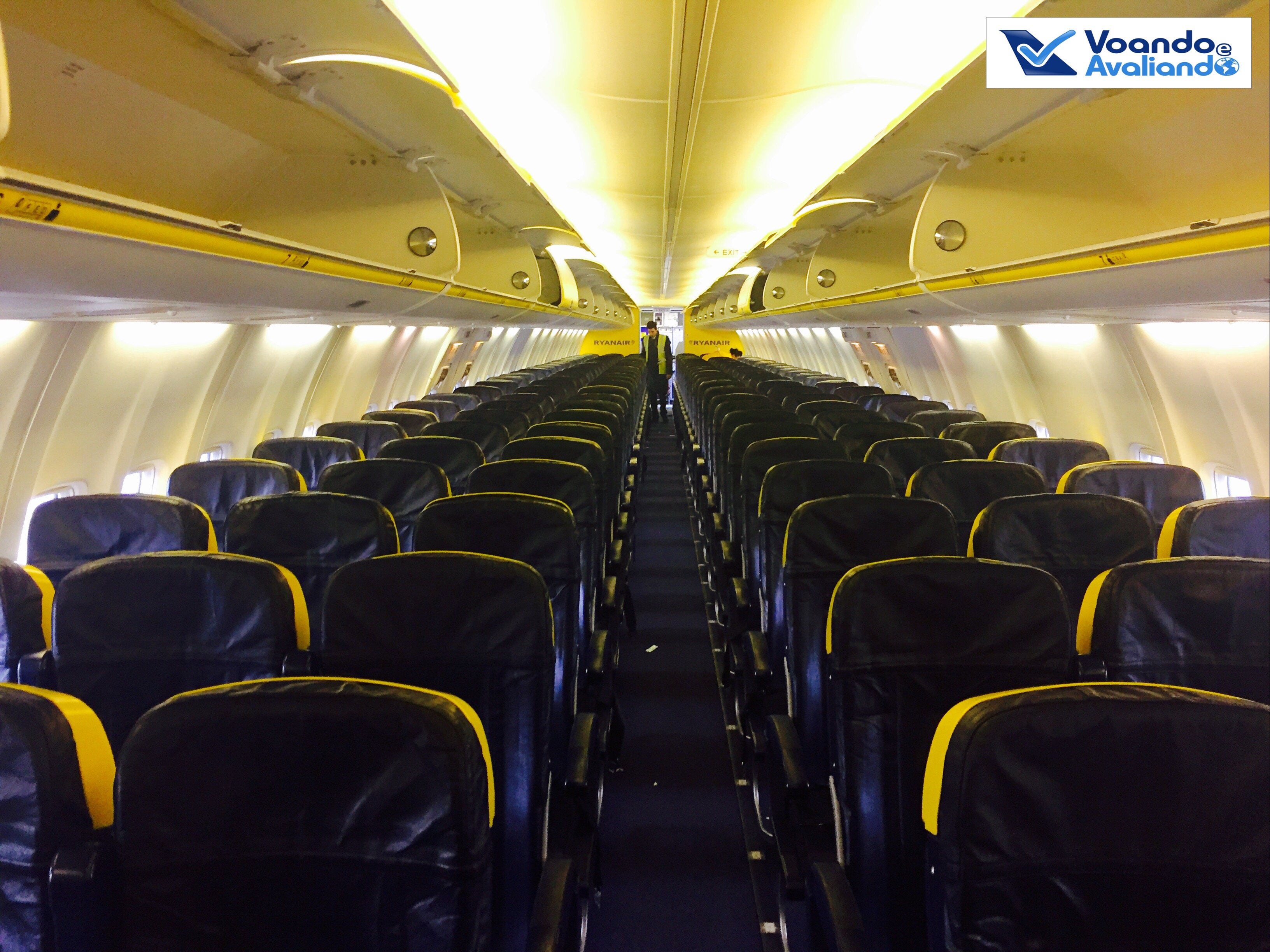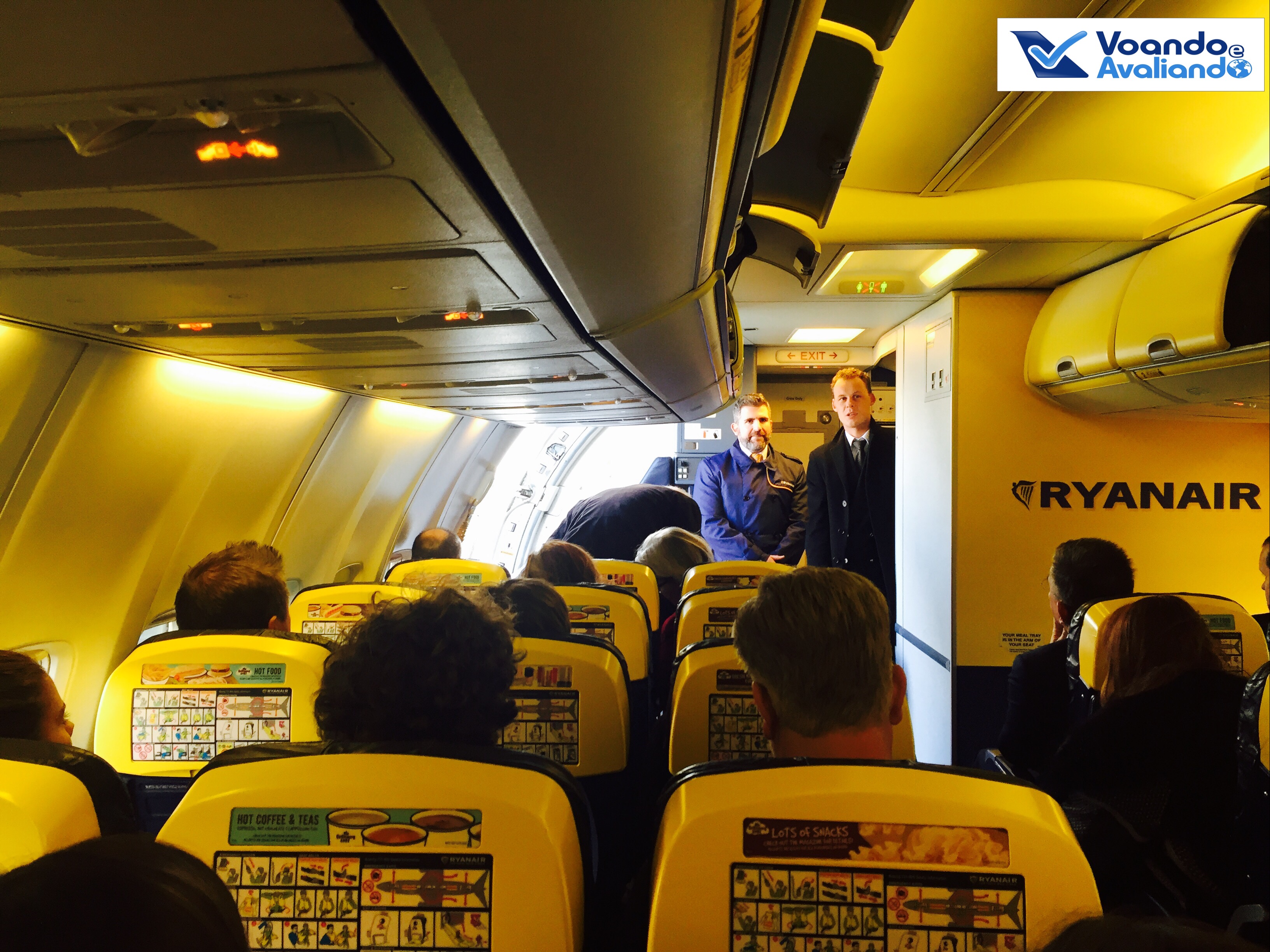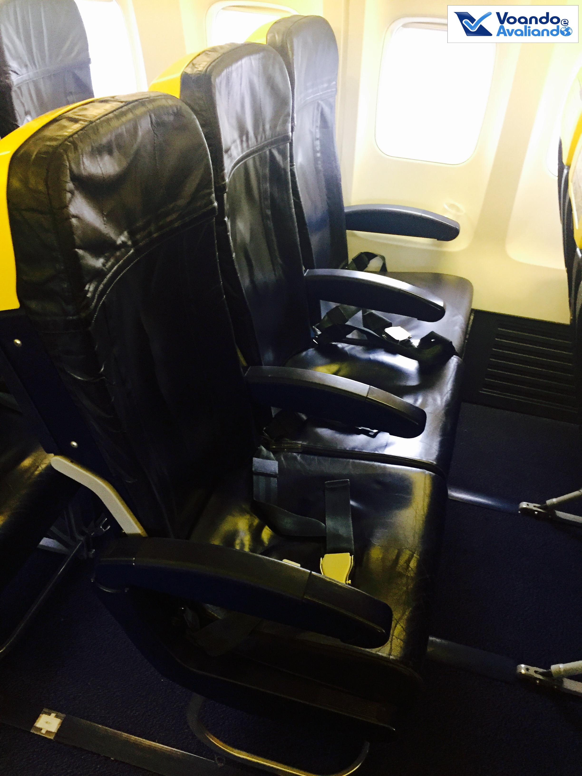 – a configuração do B737 da Ryanair é padrão para este tipo de avião: 03 assentos de cada lado da aeronave; os bancos são de couro azul bem escuro e o amarelo aparece nos bagageiros e na ponta dos assentos; a empresa coloca o máximo de assentos possível por avião, portanto, o espaço para pernas é muito apertado (se fosse no Brasil, com certeza receberia o Selo D da ANAC); além disso, nenhuma poltrona reclina; este voo estava cheio, com 90% de ocupação dos 189 assentos