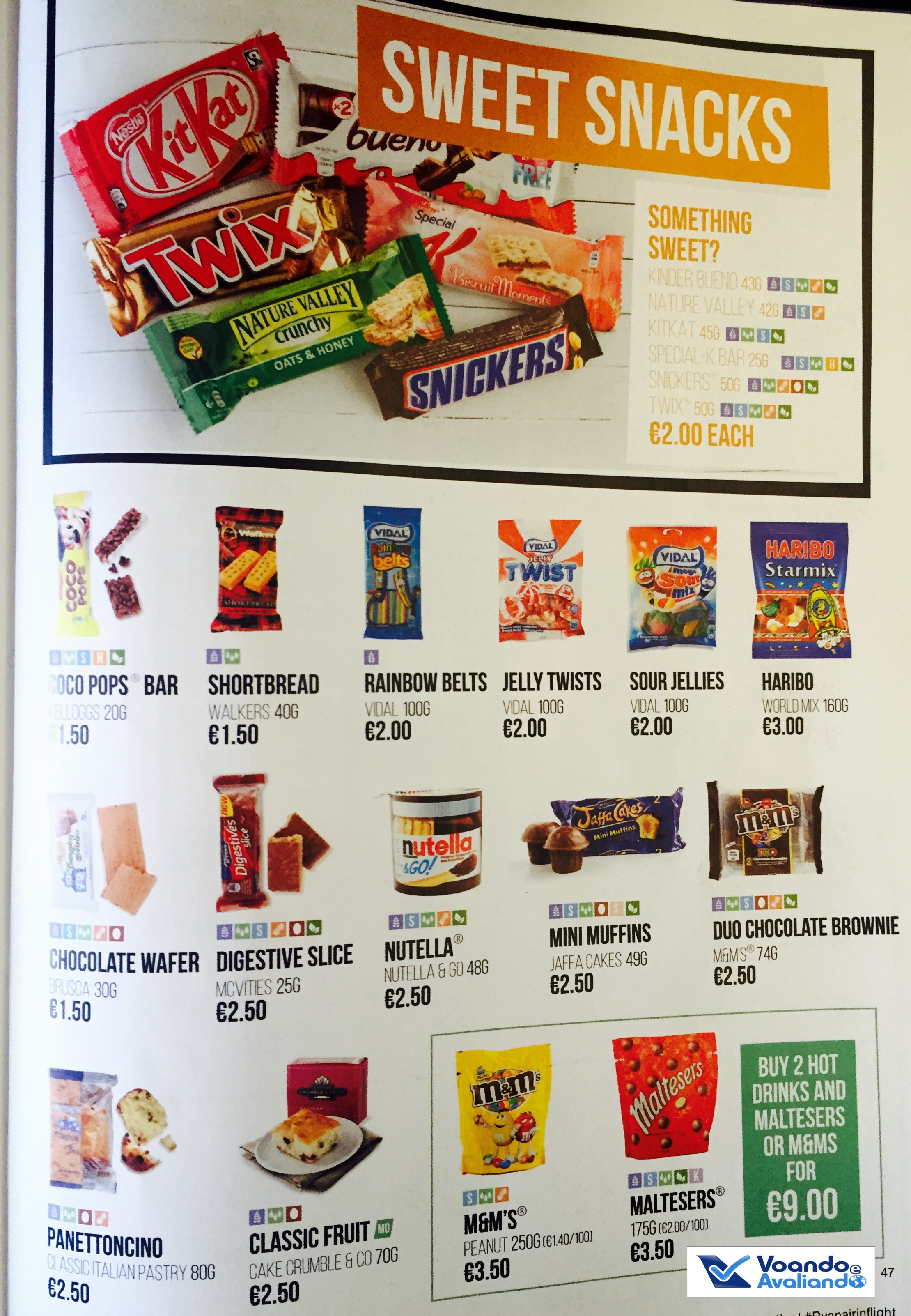 – a Ryanir é famosa pela compra de produtos a bordo; logo depois que o aviso de apertar cintos apaga, a tripulação se prepara para começar a oferecê-los para os passageiros; neste voo, em função do horário (início da tarde), os Comissáros tiveram muito trabalho, pois muitas pessoas fizeram compras; o cardápio é incrivelmente variado, faz surgir a dúvida de como eles conseguem carregar tantos produtos diferentes!