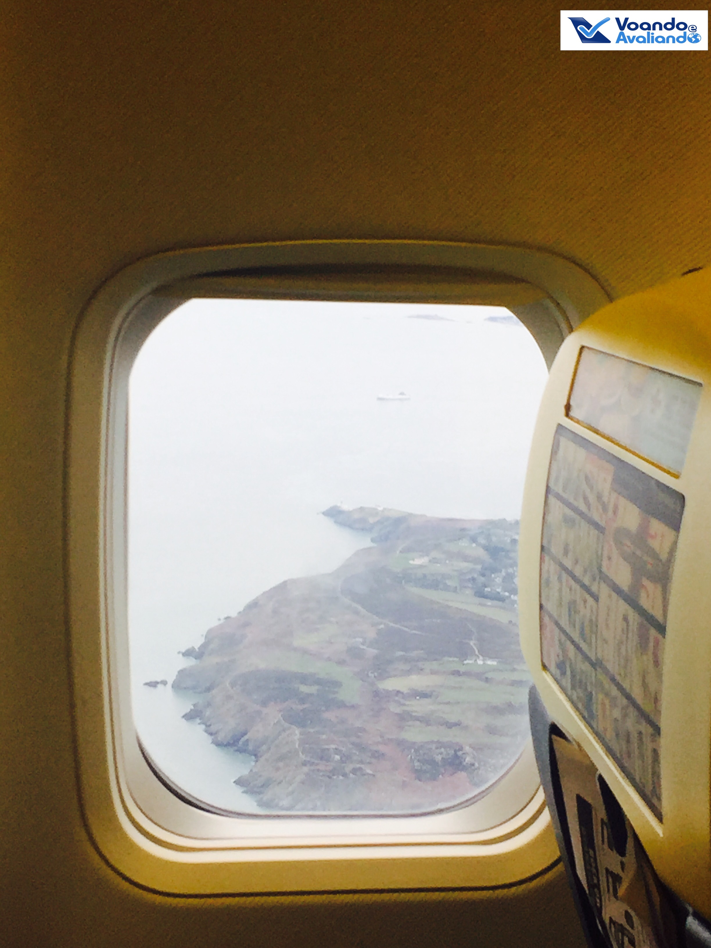 – eram 15:42h quando o Comandante informou que faltavam 10 minutos pra o pouso; a vista lá fora estava linda, uma pena eu estar no corredor, se eu estivesse na janela seria bem mais fácil tirar fotos da chegada à ilha irlandesa