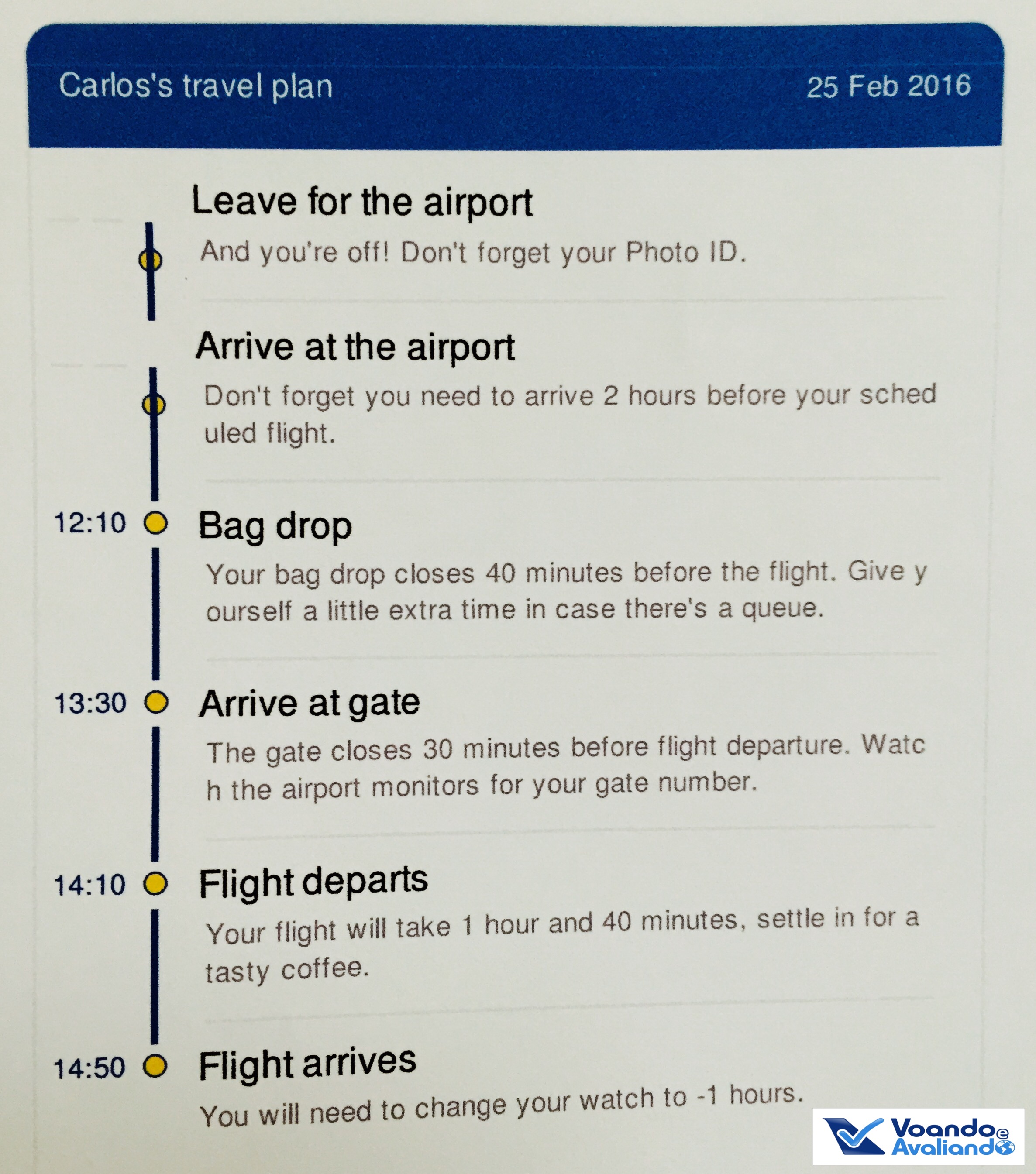 – fiz o check-in pela Internet: a Ryanair cobra uma taxa adicional de 45 euros para o passageiro “preguiçoso” que prefere deixar para fazer no aeroporto; não paguei 6 euros para escolhar o assento, por isso o sistema da empresa fez uma escolha aleatória (deu sorte, consegui um corredor); no cartão de embarque recebido por e-mail, há uma “linha do tempo” para orientar os clientes sobre quais são os procedimentos que precisam ser feitos antes do embarque e qual é a hora sugerida para cada um deles
