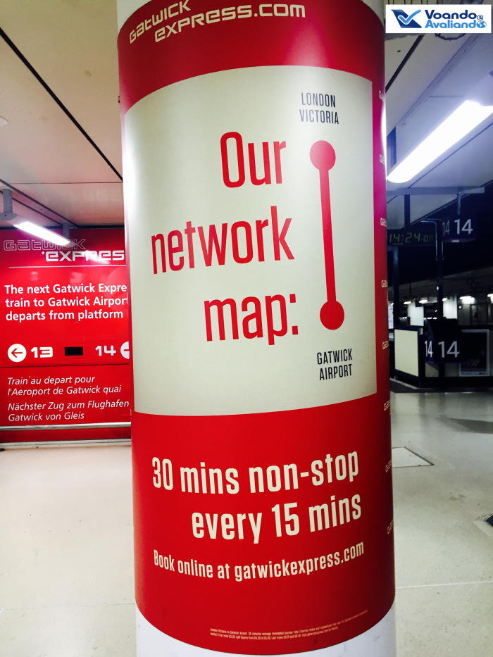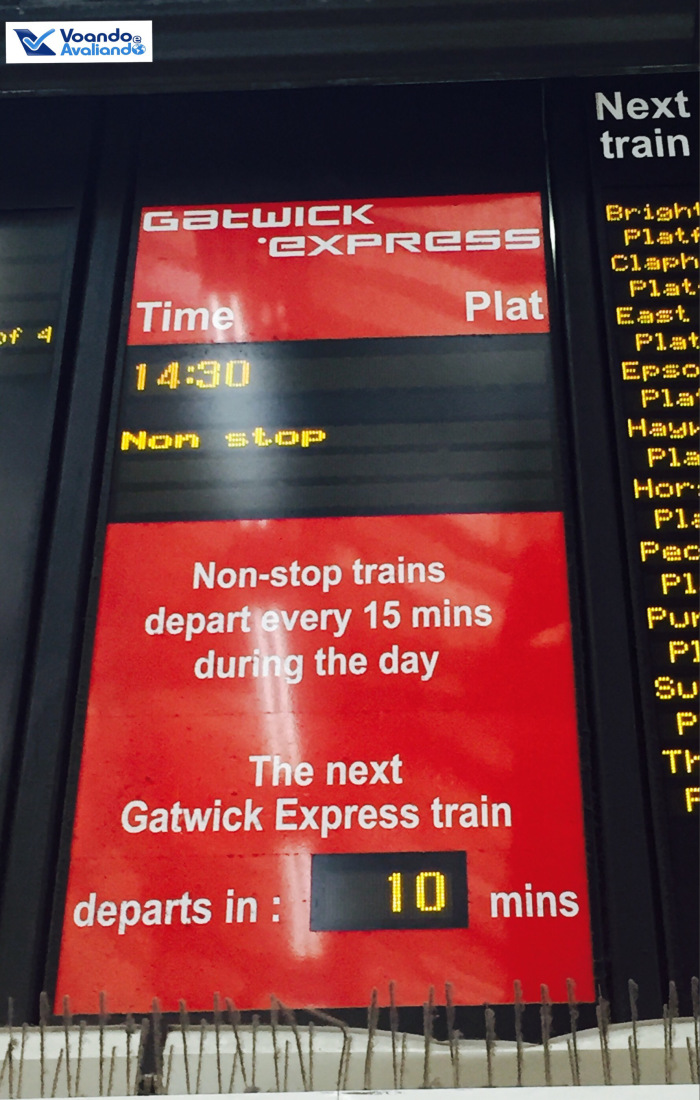 – saindo do centro de Londres, especificamente da Estação Vitória, a melhor opção para chegar no Aeroporto de Gatwick (distante 47 km e o 2º maior da região) é o trem Gatwick Express, que custa 34 pounds para bilhetes de ida/volta (cada trecho de táxi custa 60 pounds); peguei o trem de 14:30h e cheguei no Terminal Sul do aeroporto às 14:58h; o aeroporto tem 02 terminais, se o voo parte do Norte, é preciso pegar um trem interno; o Sul é utilizado pela Swiss