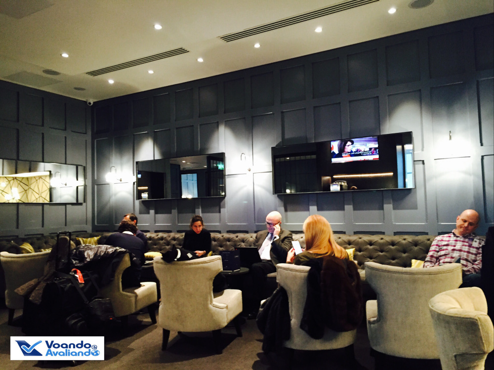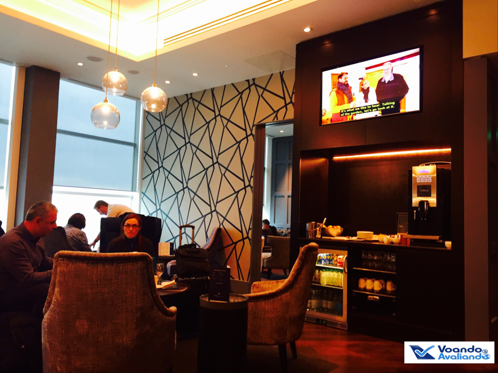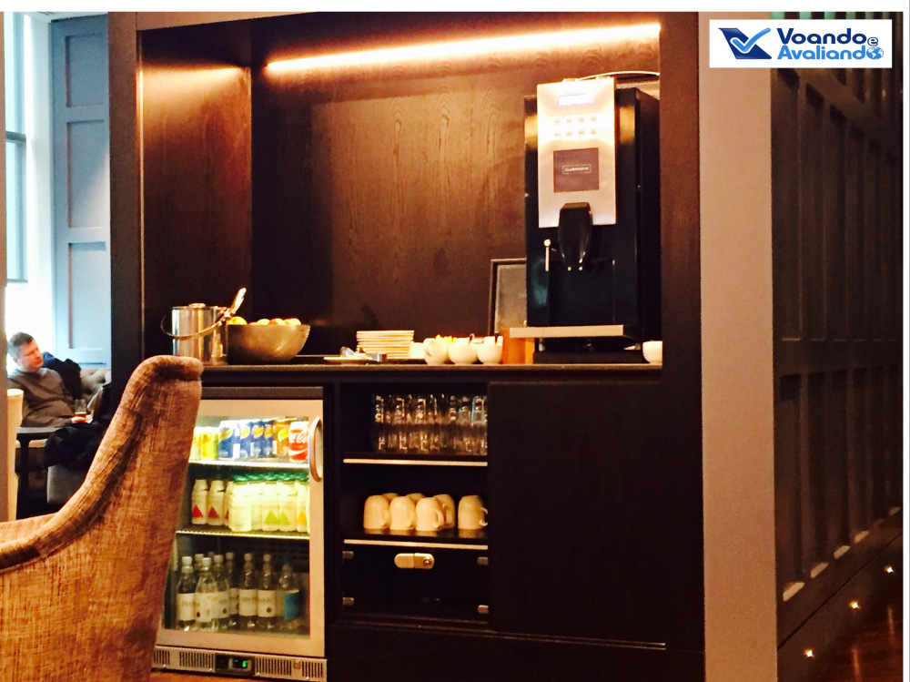– já no saguão de embarque, procurei a sinalização para a Sala VIP: há 02 Lounges neste terminal: Nº 1 e Clubrooms; eu não sabia qual delas a Swiss utiliza, tentei primeiro a Clubrooms e o tiro foi certo, era lá mesmo; é um espaço bem pequeno, são apenas 03 cômodos, mas extremamente acolhedor; o ambiente me chamou a atenção, parecia o hall de um hotel 5 estrelas em Londres; as opções de buffet eram poucas, mas outras coisas podem ser pedidas para os garçons que apareciam de vez em quando