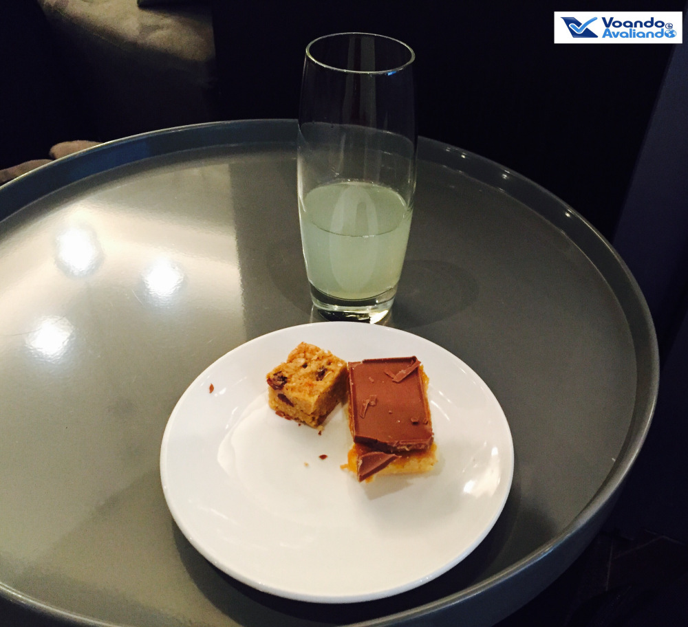 – por volta de 16:50h, o serviço de bordo foi iniciado: 01 comissária serve um sanduíche (mini-baguete de frango e pepino japonês) e 02 outras oferecem as bebidas (água, suco, cerveja e vinhos); escolhi o vinho tinto (garrafinha de plástico); logo depois, uma comissária passa com uma pequena bandeja oferecendo chocolate suíço; na minha opinião, foi um lanche apenas saboroso, mas o rapaz sentado no corredor do outro lado adorou: ele comeu 04 sanduíches!