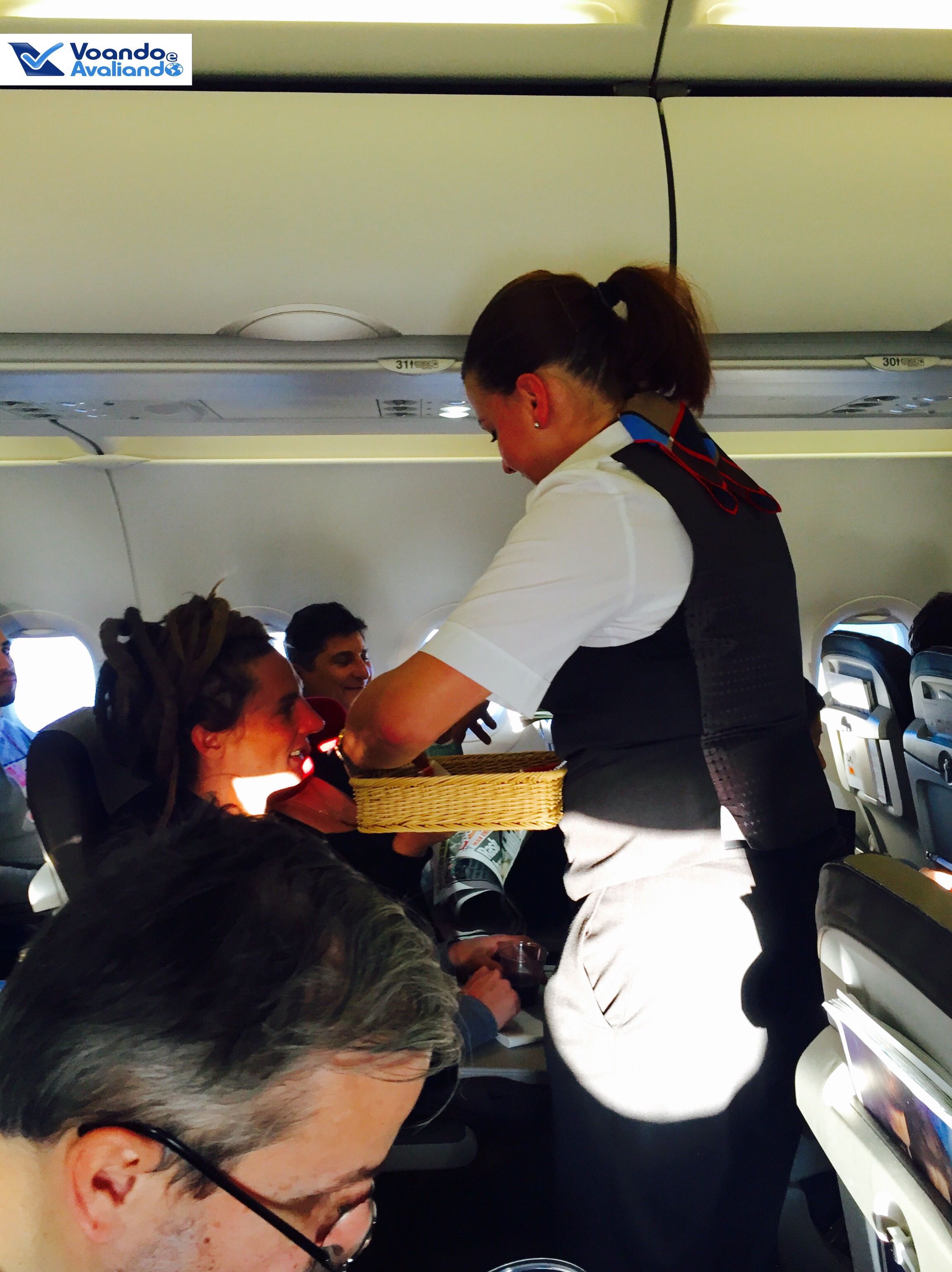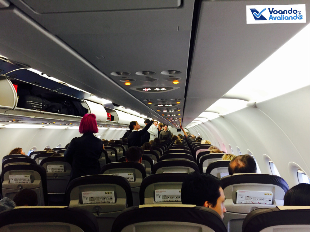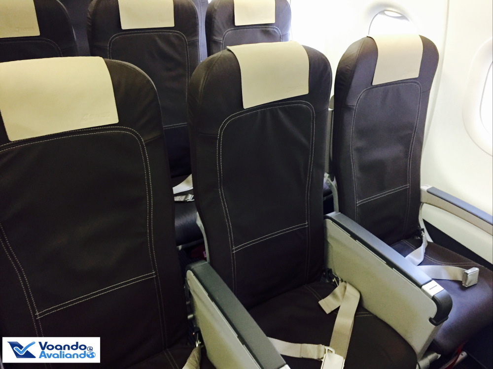– meu assento era o 31 F, uma janela no lado direito, parte de trás da aeronave; tive sorte, não havia ninguém do meu lado; as poltronas são de couro marrom escuro, com o encosto de cabeça bege claro; o espaço para pernas não era dos maiores; os celulares podem ficar no modo avião durante todo o voo, mas não há tomadas nem porta USB para carregar aparelhos eletrônicos