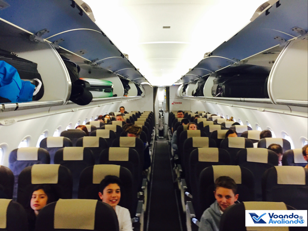 – a Swiss configura o A320 com 03 fileiras dedicadas à classe Business, separadas por uma cortina marrom que fica fechada durante o voo; são 03 poltronas de cada lado do avião, inclusive na Business (o assento do meio fica vazio, são apenas 12 passageiros no máximo nesta classe); na Classe Econômica, são 150 lugares; um fato curioso: as fileiras 13, 18, 19, 20, 21, 22, 23 e 24 não existem