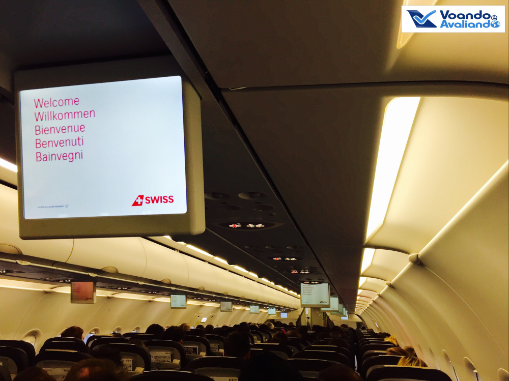 – o sistema coletivo de entretenimento é utilizado para mostrar as instruções de segurança; notícias sobre o voo e da Swiss ficam sendo exibidas, dentre elas o lançamento do voo de Zurich para o Rio de Janeiro a partir do fim de abril (serão 02 voos semanais)