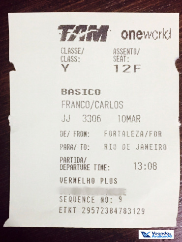 – cheguei no Aeroporto Internacional Pinto Martins por volta de 12:05h e, mesmo já tendo feito o check-in antecipadamente pela Internet, fui ao balcão da TAM para tentar sentar em um Assento Conforto; não tinha filas e fui atendido pela funcionária Ana Clara: simpática, rápida e atenciosa, que conseguiu me colocar no poltrona 12F, localizada em uma das saídas de emergência; este assento especial custaria R$ 30,00 caso eu não tivesse direito à gratuidade por conta do meu Cartão Vermelho Plus