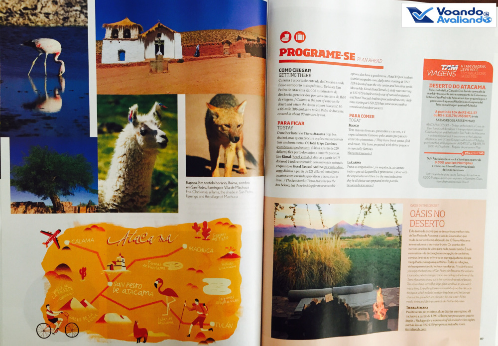 – uma revista de bordo está à disposição dos passageiros: “TAM nas Nuvens“, que na edição de março traz uma reportagem bem legal sobre o Deserto de Atacama no Chile; no geral, a revista é um bom passatempo, mas me chamou a atenção que a 1ª reportagem só aparece na página 22, antes disso somente propagandas e dados editorias