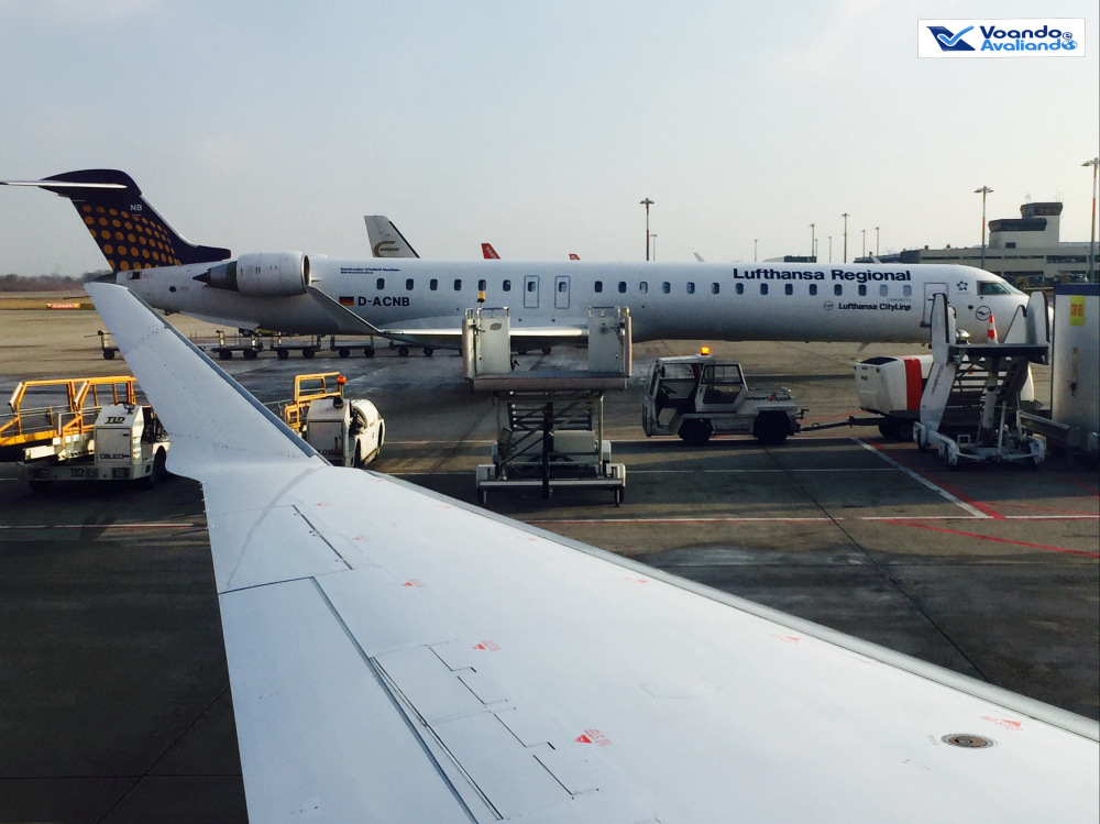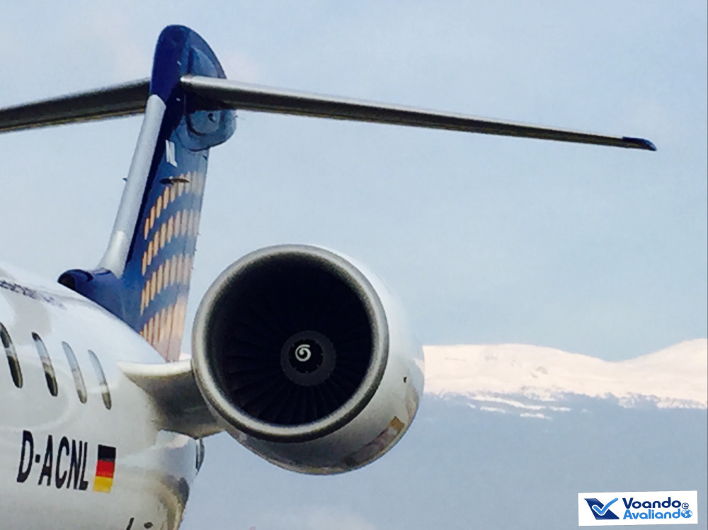 – em menos de 05 minutos fomos “entregues” na porta do Bombardier CRJ 900, Prefixo D-ACNL, fabricado e entregue à Eurowings em março de 2010; esta aeronave tem uma escada própria para acesso dos passageiros e estava pintada nas cores da Brussels Airlines, companhia aérea que também faz parte do Grupo Lufthansa; o estilo do avião é bonito, com 02 turbinas instaladas na parte de trás da fuselagem; este tipo de embarque permite uma bela visão dos Alpes ao fundo, com neve no topo das montanhas